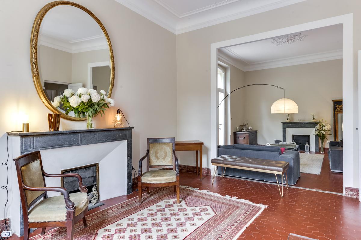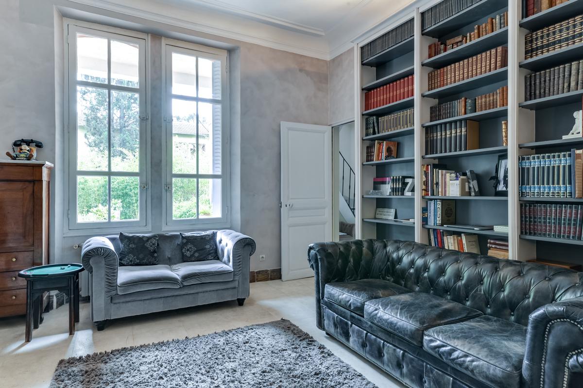 – Espace de vie avec salle à manger, cheminée et grande bibliothèque