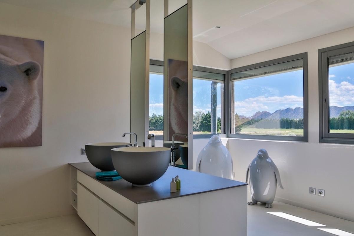 Très confortable et avec de grands espaces, cette villa accueillante est entourée de 20 hectares de terrain boisé parfaitement entretenu. Véritable paradis pour les familles nombreuses, la maison était particulièrement bien aménagée pour les adultes, les adolescents et les enfants – tout le monde s’y sentira bien ici ! C’est un lieu construit autour des loisirs – la belle piscine de 15x5m avec volets roulants électriques, jacuzzi sur la terrasse, cuisine d’été, et aussi de fantastiques installations équestres – centre équestre, écuries, écuries, prairies, qui sont disponibles sur demande, avec des coûts supplémentaires. Sur demande préalable et moyennant des frais supplémentaires, la piscine peut être chauffée. La villa dispose d’un décor moderne, de bon goût et convivial, avec cinq chambres à coucher dont une indépendante, qui sera parfaite pour les adolescents ou les jeunes couples. Chacune est équipée d’un téléviseur. Rez-de-chaussée : Entrée – Séjour avec cheminée et TV satellite, et salle à manger – Cuisine ouverte parfaitement équipée – WC invités – Chambre 1 : lit queen, salle de bains attenante (baignoire et WC) – Chambre 2 : lit queen et mezzanine avec un lit double (140 cm), salle de douche (douche et WC) – Chambre 3 : lit simple et mezzanine avec trois lits jumeaux de 90 cm, salon avec baby-foot, salle de douche (douche et WC) à l’étage : Chambre 4 : suite parentale de 70 m2, vue panoramique sur les Alpilles, lit king size, salon privé, salle de douche attenante (douche et WC) -Terrasse avec annexe Jacuzzi : Chambre 5 : suite indépendante, lit double (140cm), salle d’eau et WC extérieur : Cour intérieure/pool house avec cuisine d’été complète, grande table et coin détente -Mobilier de jardin -Douche extérieure, draps et serviettes de toilette fournis. Les lits seront fraîchement faits à l’arrivée. Vous trouverez des articles de toilette dans les salles de bains et un panier gourmet dans la cuisine. Des services optionnels sont disponibles sur demande à la réservation.