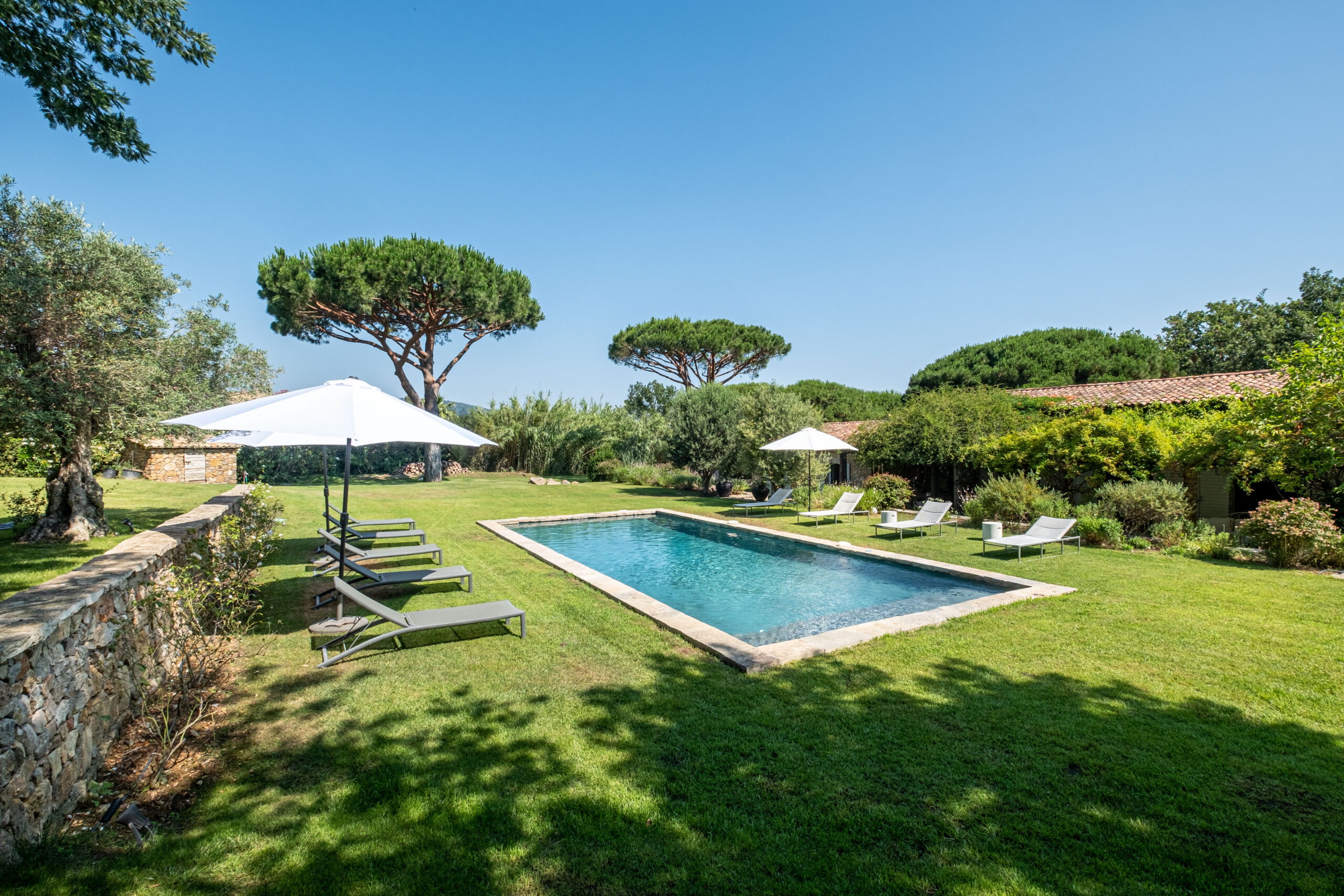 Le jardin plat et vaste de 5500 m² avec une belle et grande piscine pour toute la famille. De grands espaces, à l’extérieur comme à l’intérieur, une villa sur la Côte D’Azur pour profitez des vacances dans un grand confort.
