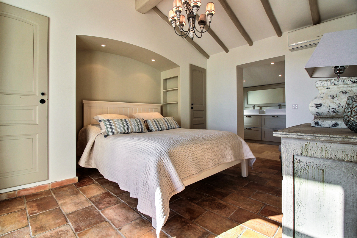Puis toujours au rez de chaussée, l’accès aux chambres dont 4 chambres doubles avec salle de bain privée attenante et WC. Les chambres ouvrent sur la terrasse et la piscine. Une des chambres se trouve directement dans le jardin.