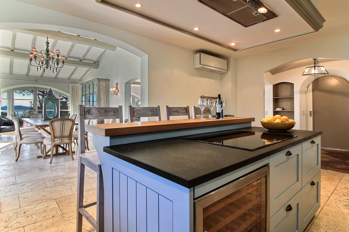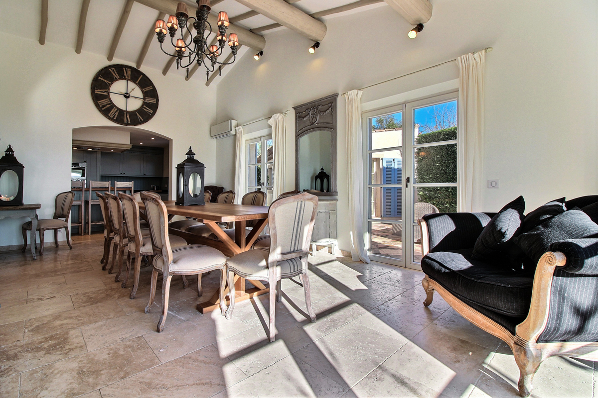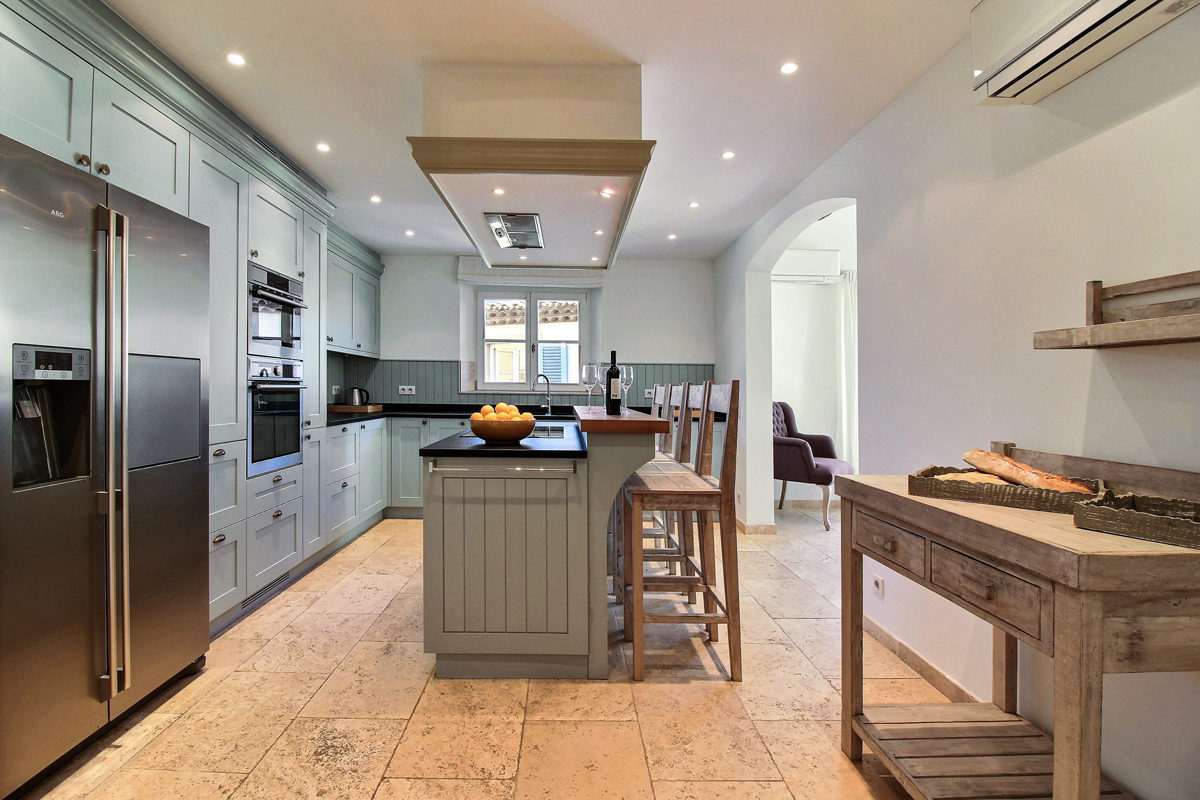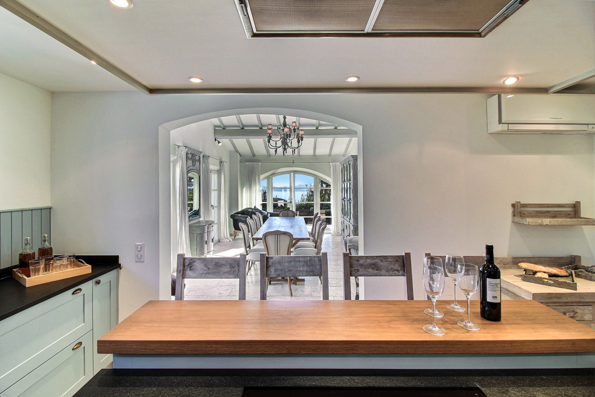 Puis, passons à la cuisine de style moderne campagnard, entièrement équipée. En fait, ce qui est très accueillant, c’est le bar avec avec ses tabourets ce qui rends l’espace cuisine convivial. Cette cuisine est ouverte sur une salle à manger pour dîner autour de la grande table prévue pour 10 convives avec accès direct terrasse et jardin.