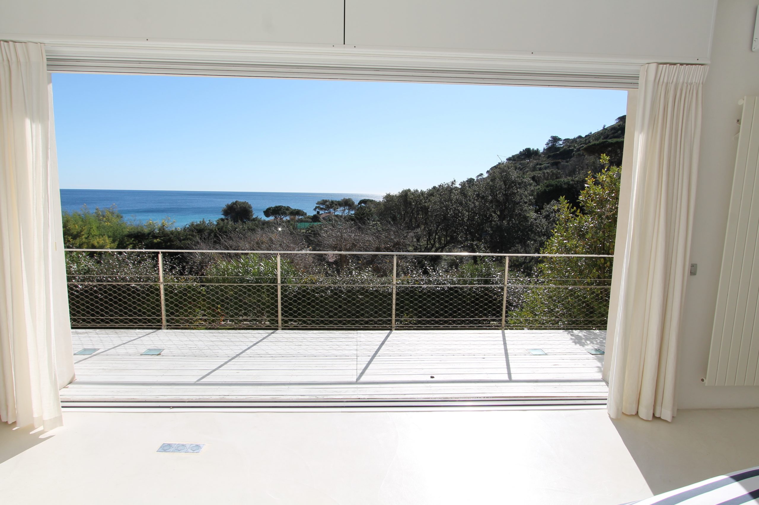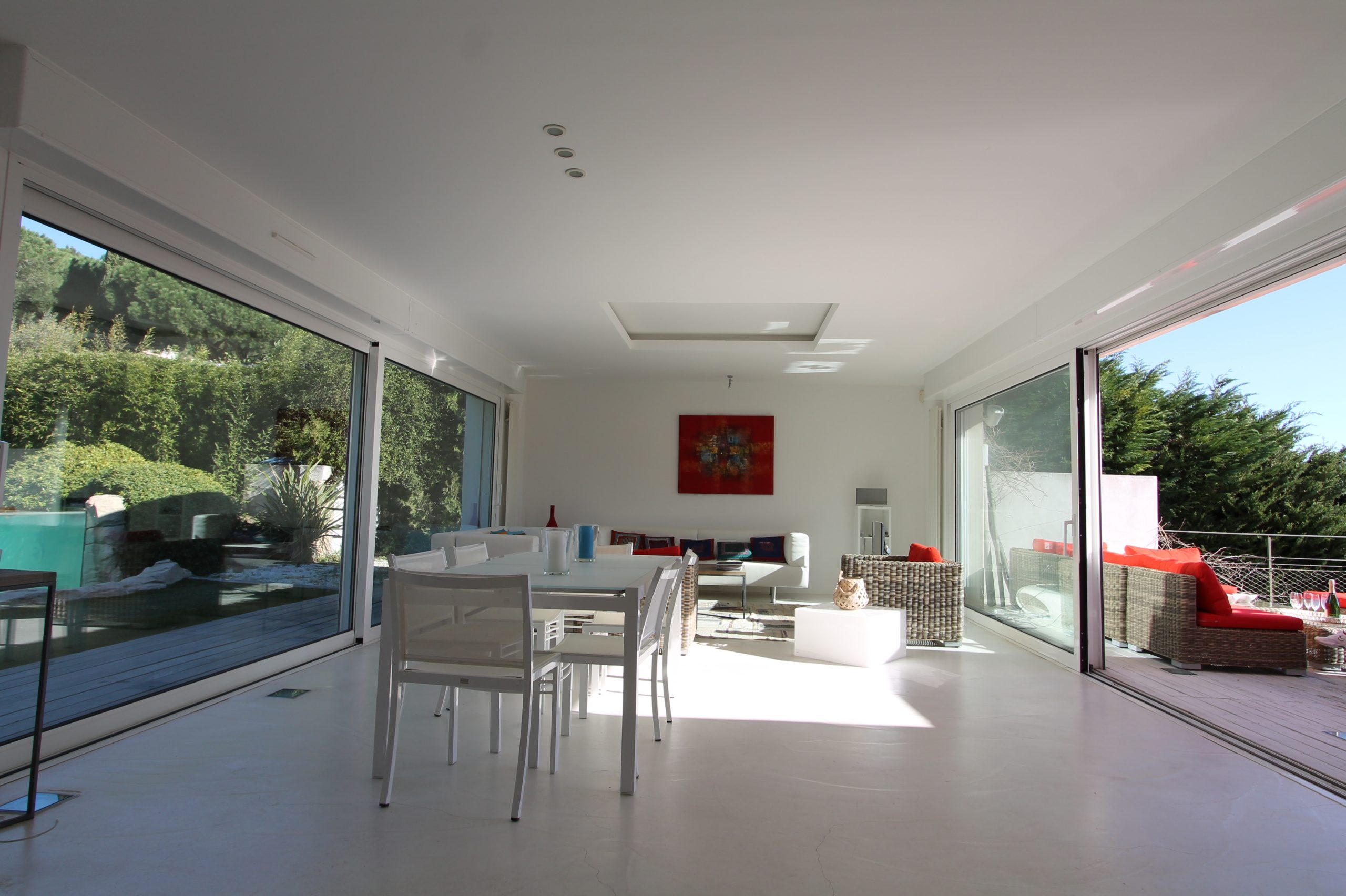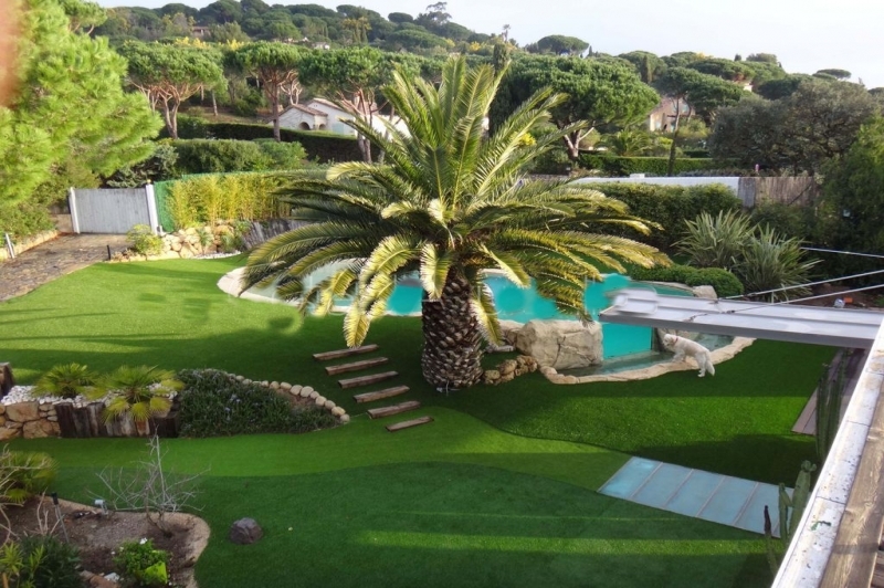 Un magnifique jardin planté des palmiers, une belle pelouse avec une belle piscine à débordement. En effet, cette villa toute en lumière avec ses baies vitrées offre une ouverture sur la méditerranée à perte de vue. Puis, nous sommes à quelques minutes de la célèbre plage de l’Escalet et 5 km du centre de Saint Tropez.