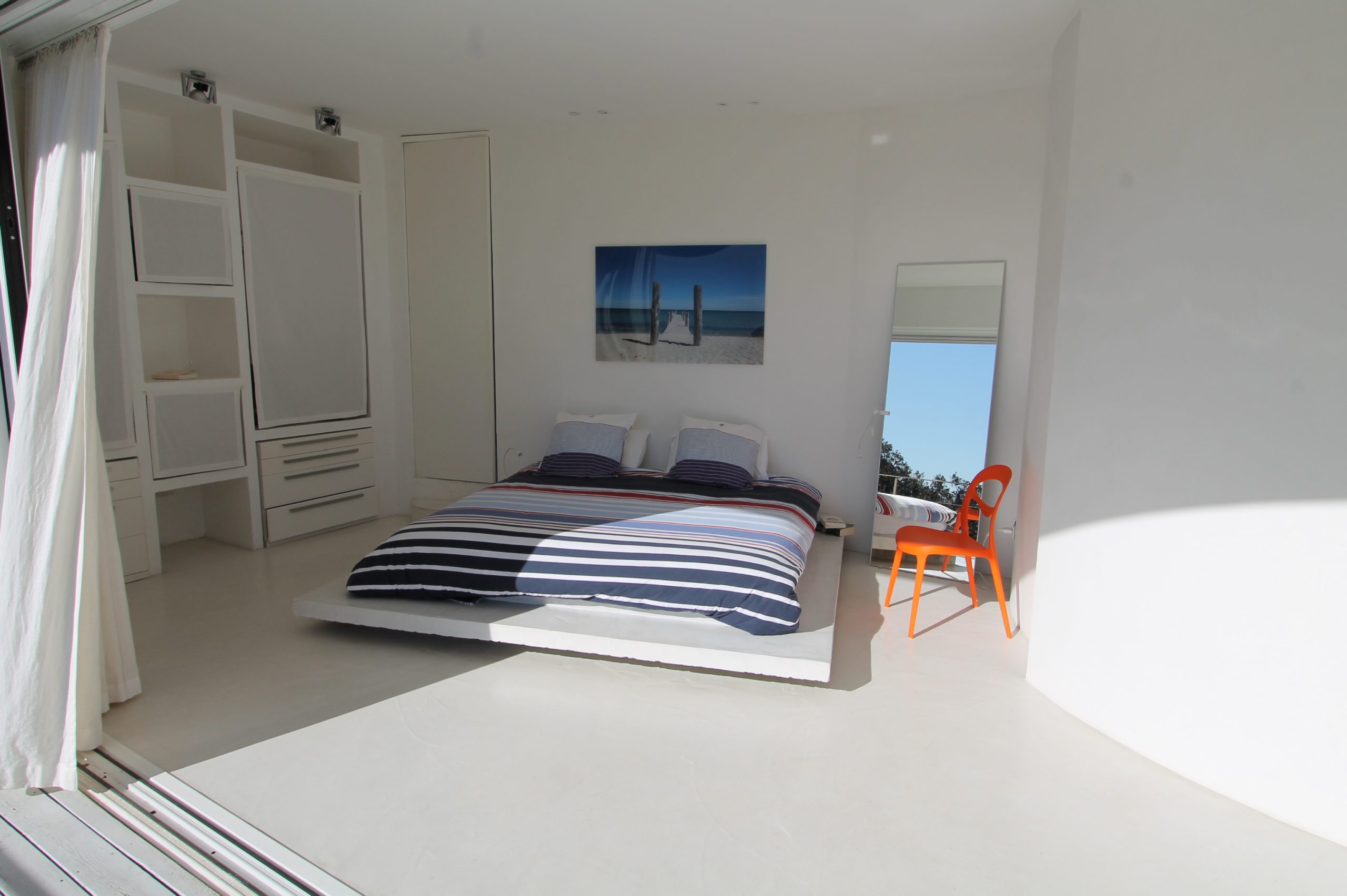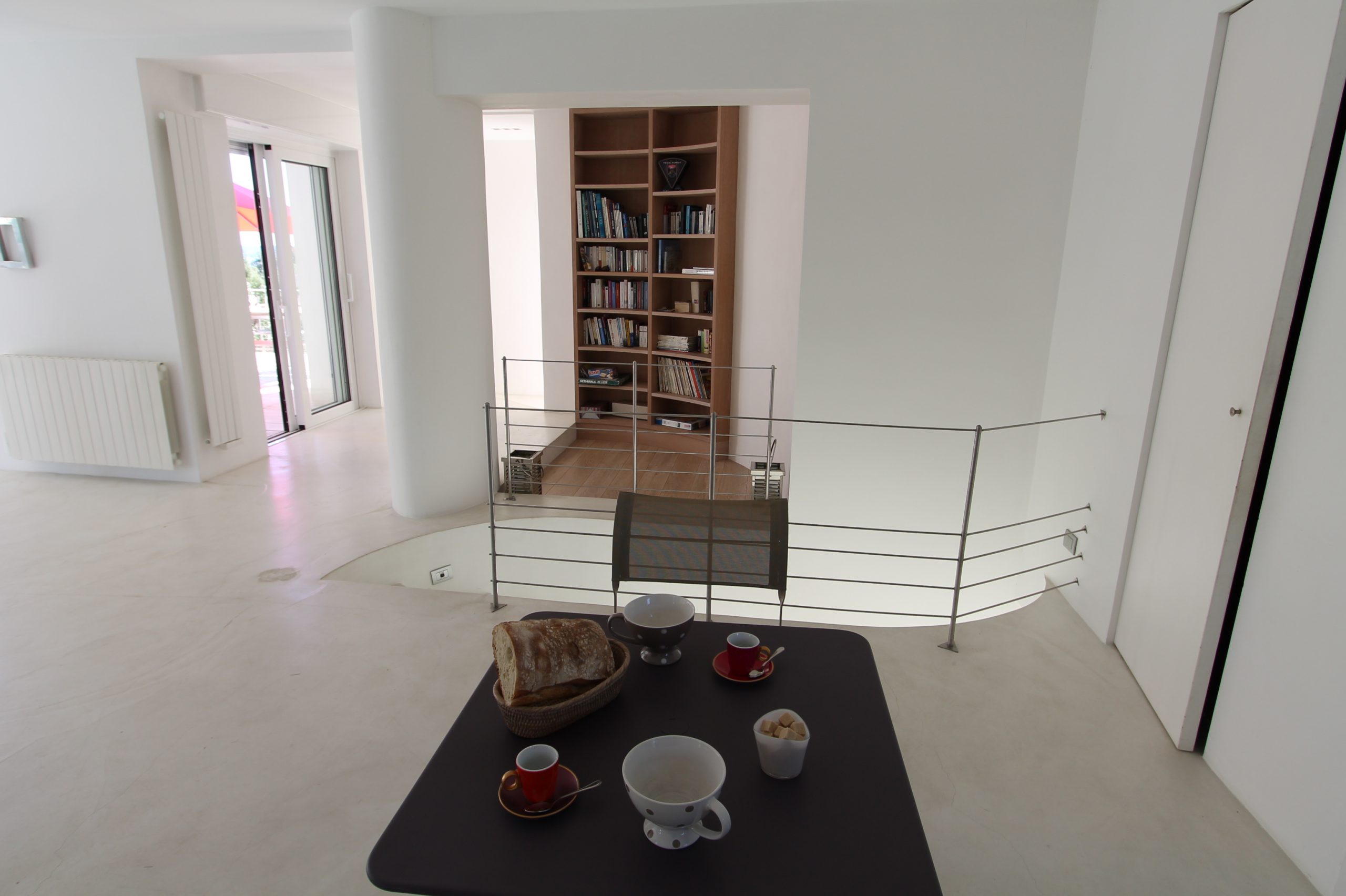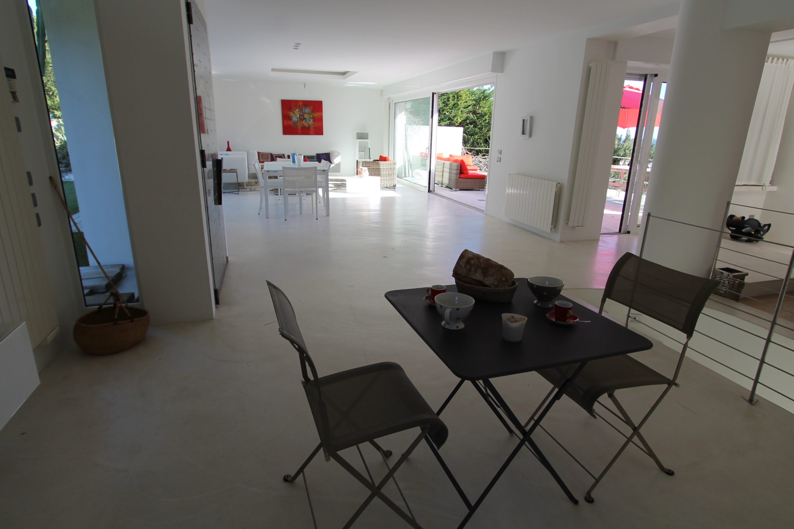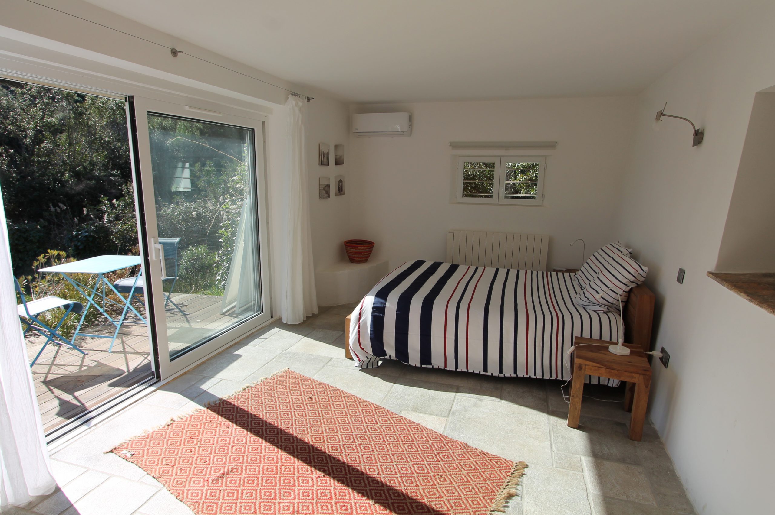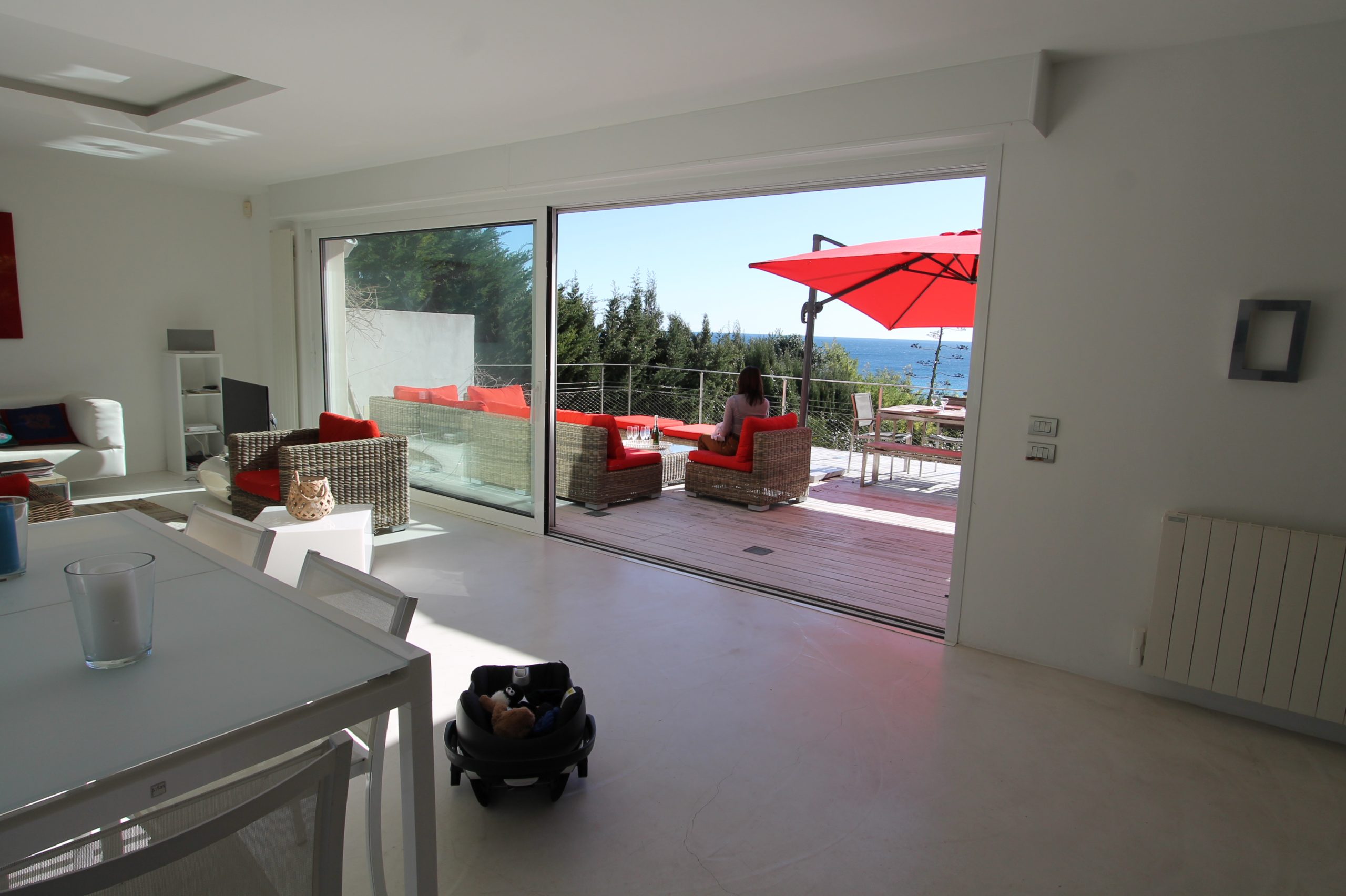 En fait, le rez de chaussée est réservé aux pièces de vie avec le salon, salle à manger lumineux avec accès direct sur la terrasse devant la grande bleue!!! Puis une cuisine ouverte complètement aménagée et très chic avec son blanc étincelant. Toujours à ce niveau, 2 chambres doubles et salle de douche attenante et toilettes. Puis une autre chambre avec 2 lits simples.