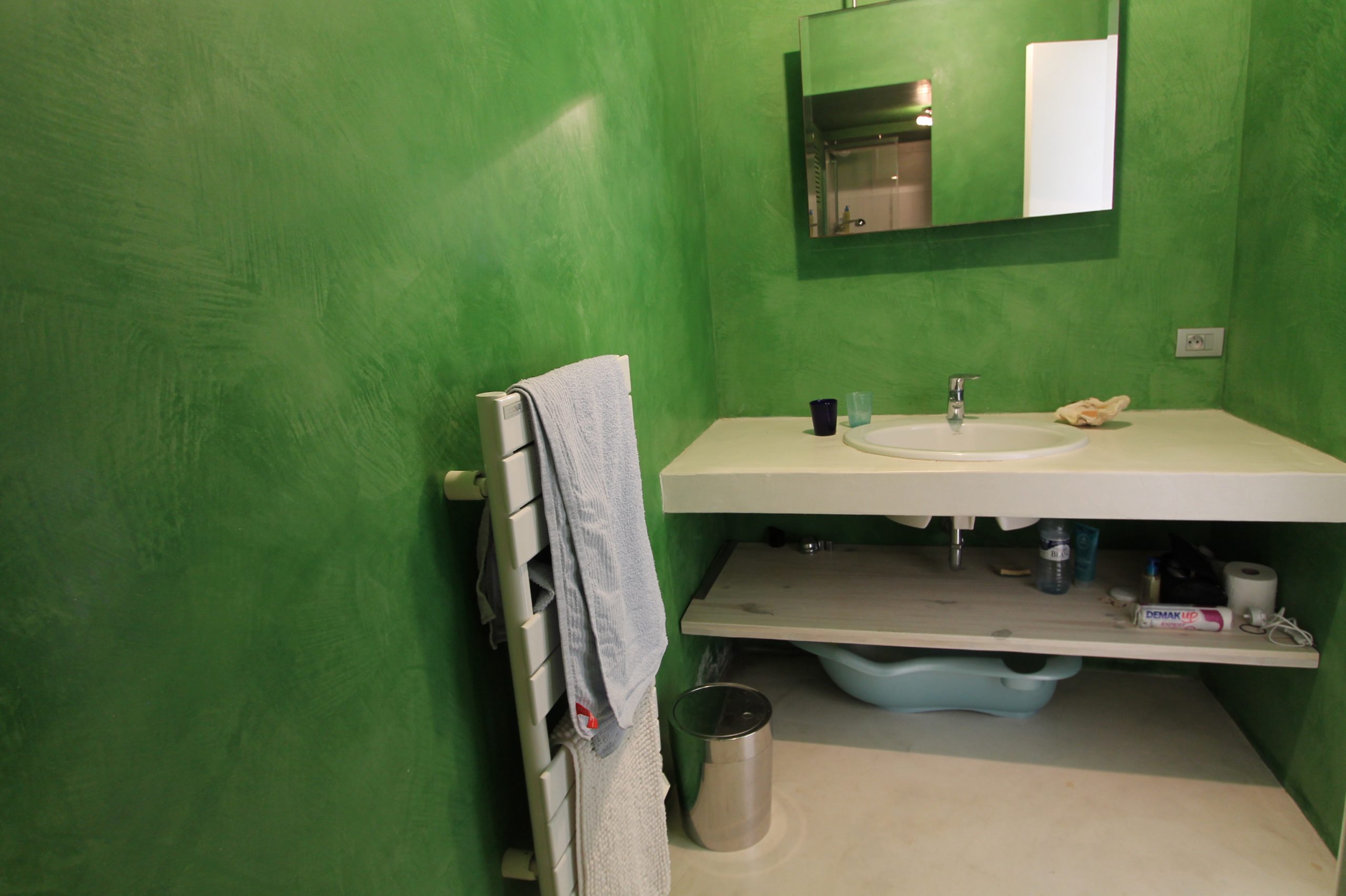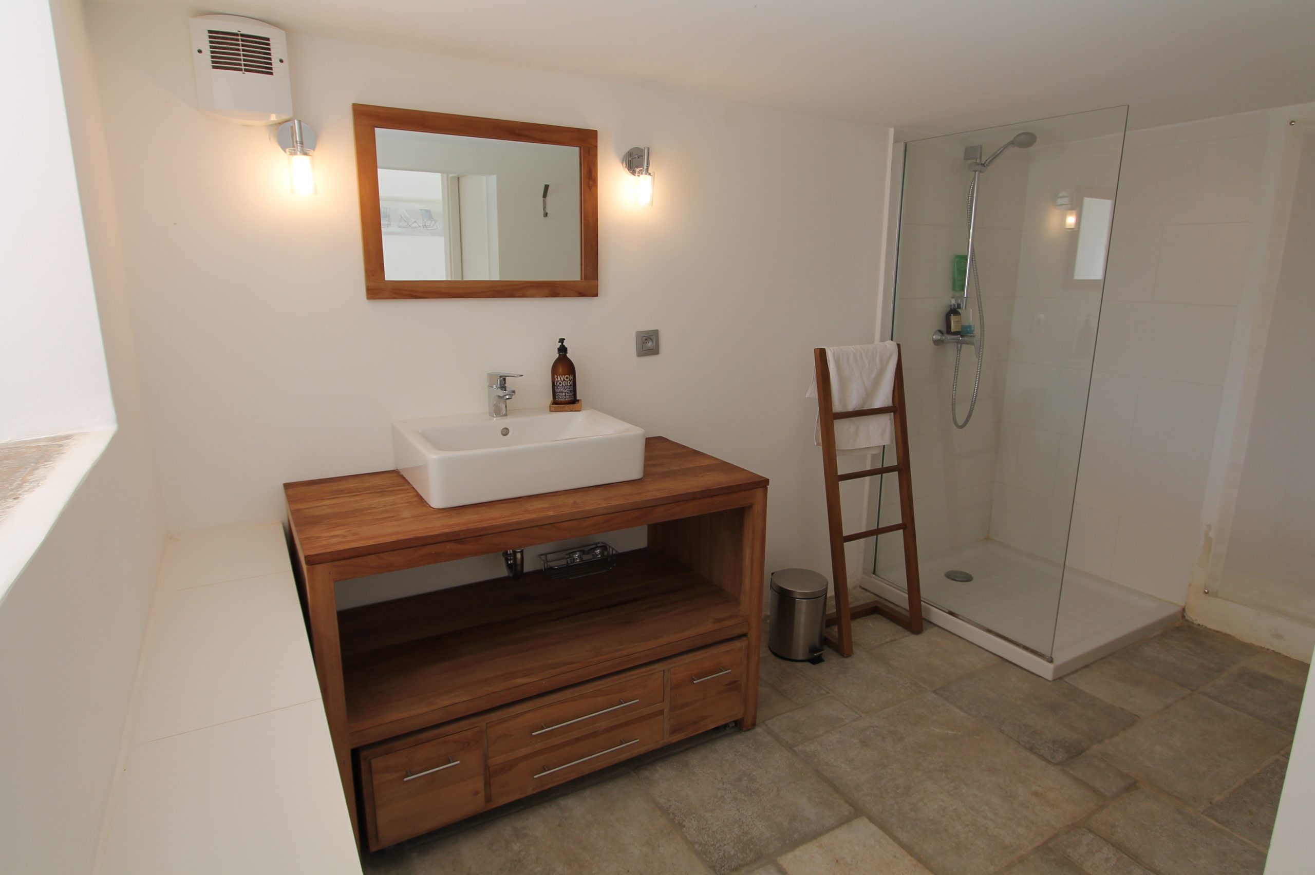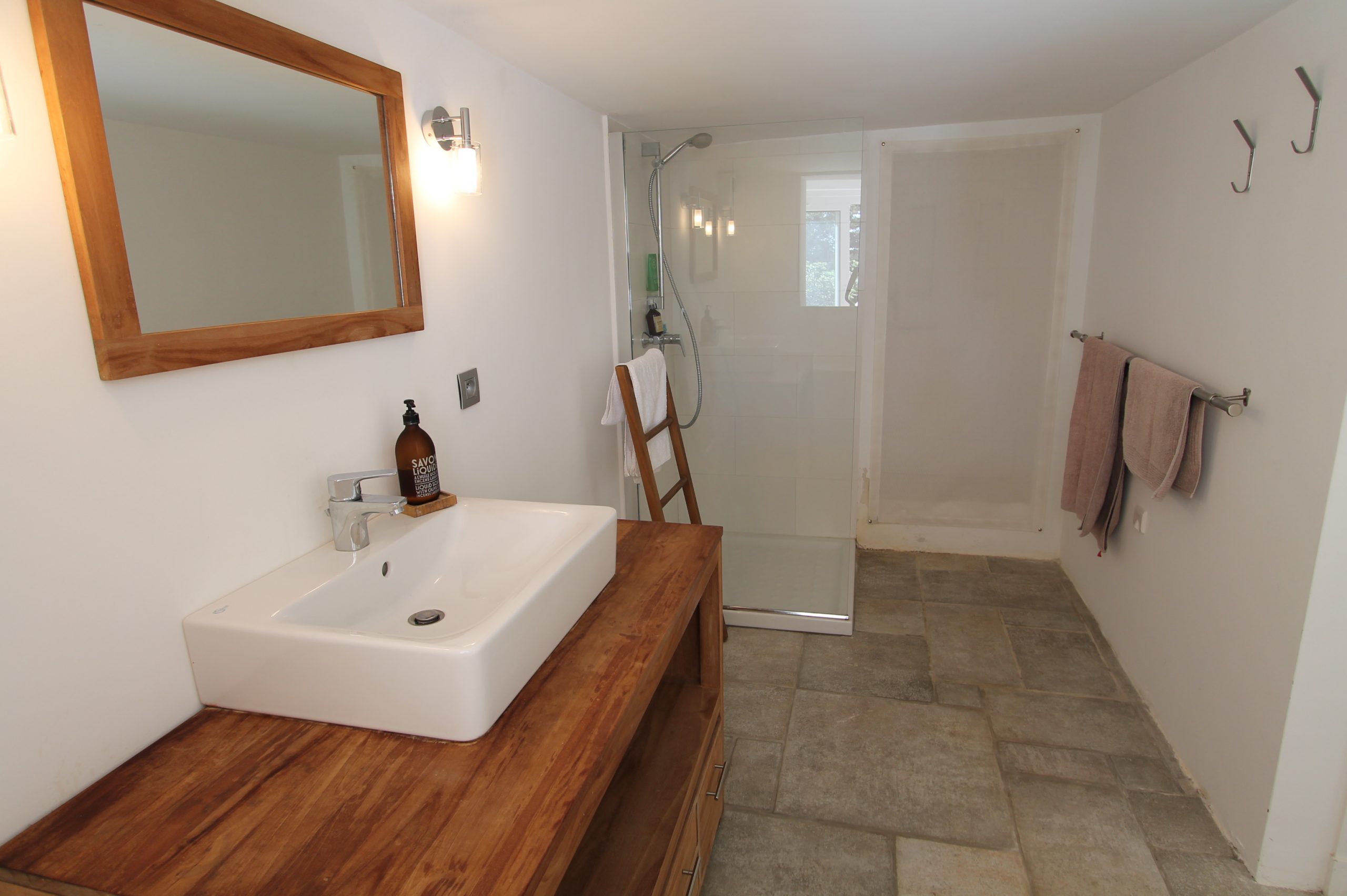 On retrouve 2 chambres en rez de jardin. En fait une chambre double avec salle de douche attenante et toilettes. Puis, une chambre familiale de 5 lits simples avec salle de douche attenante et toilettes.