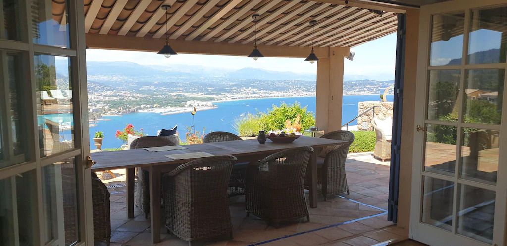 Cette villa au sommet de la colline qui domine le port de Théoule sur Mer, étonnante avec une vue panoramique spectaculaire. En effet, vous admirez la baie de cannes et les iles de Lérins face à vous. Puis, en toile de fonds sur le bleu de la méditerranée une farandole de bateaux blancs nous donne l’impression d’un tableau de Maître.