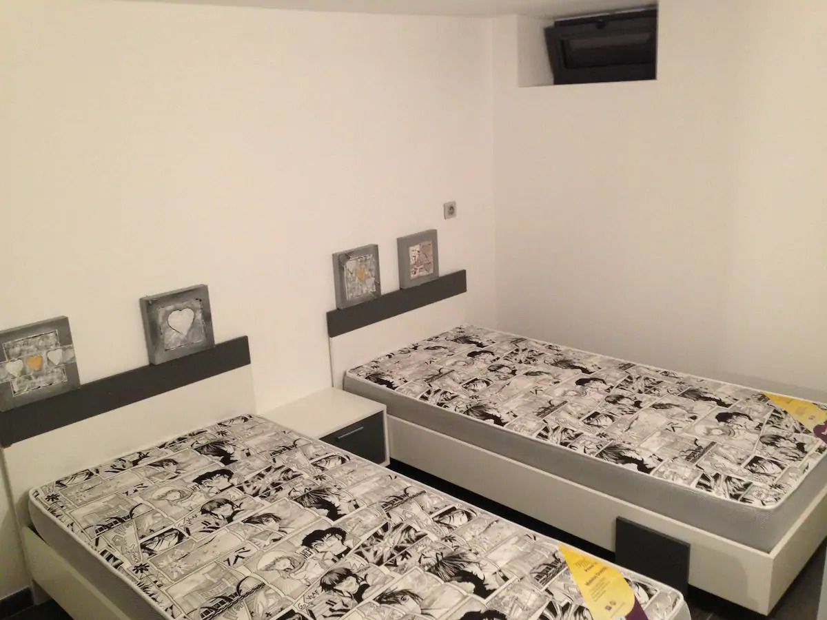 En rez de jardin, une grande suite avec un lit rond dominé d’une baie vitrée inondée par le soleil du matin pour des réveils radieux, suivie d’une chambre avec deux lits jumeaux, créant ainsi un espace familial particulier complété par une salle de douche et des toilettes.