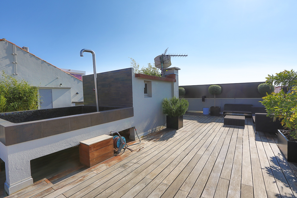 Cannes, Palais des festivals, magnifique appartement toit terrasse. Appartement de luxe, pour 6 personnes, en dernier étage avec ascenseur privé, rue d’Antibes au cœur du carré d’or. Un appartement, idéal pour rester au calme en plein centre de Cannes, avec 2 belles terrasses, dont la magnifique terrasse solarium de 120 m² sur le toit. En fait, la terrasse de 120 m² sur le toit est entièrement aménagée avec 2 frigidaires, wc, lave vaisselle et matériel audio avec 6 enceintes Bose pour écouter la musique sur le toit de Cannes.