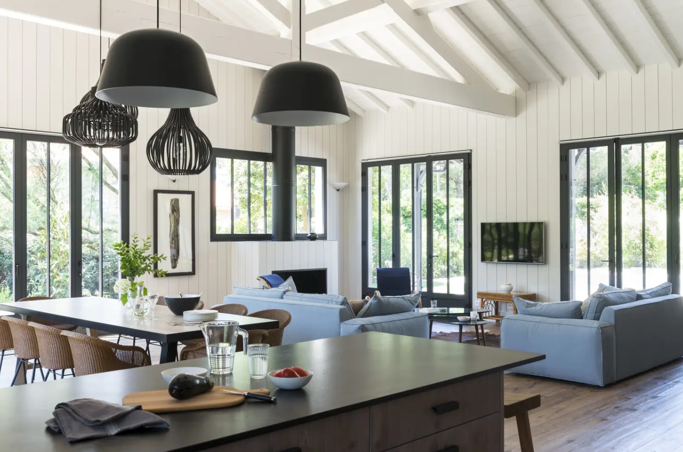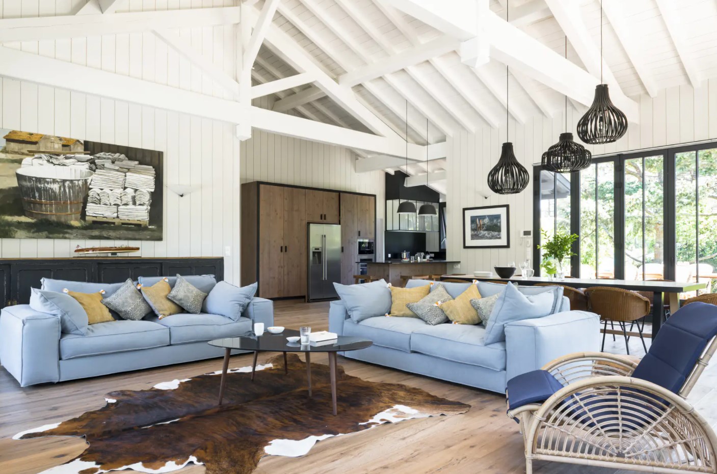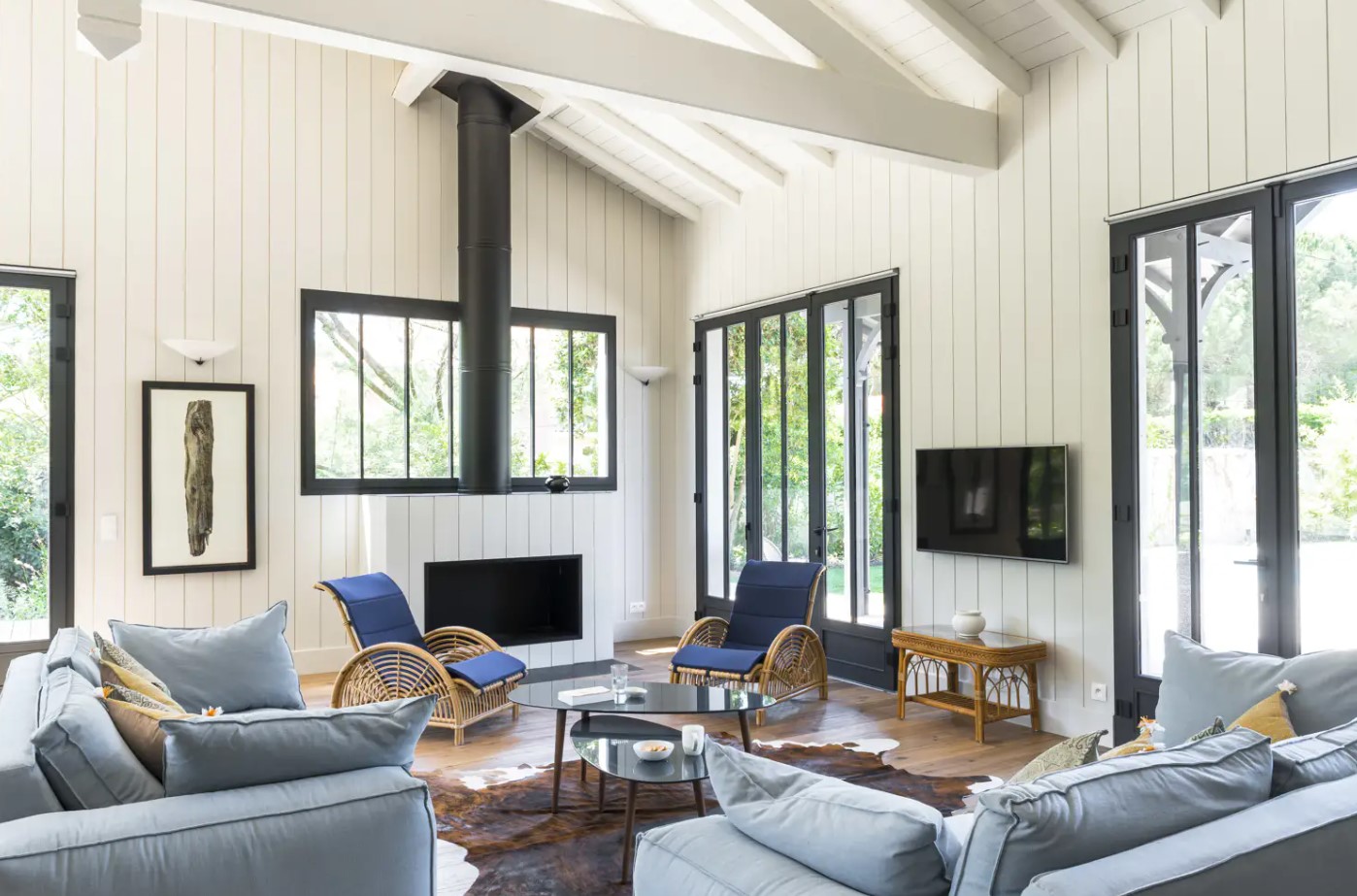 La location villa Palomba, une villa de luxe de plain-pied avec un beau jardin. Un espace de vie et des couleurs claires avec des murs en bois peints. C’est les vacances, avec les canapés bleus ciel comme la mer et le ciel.