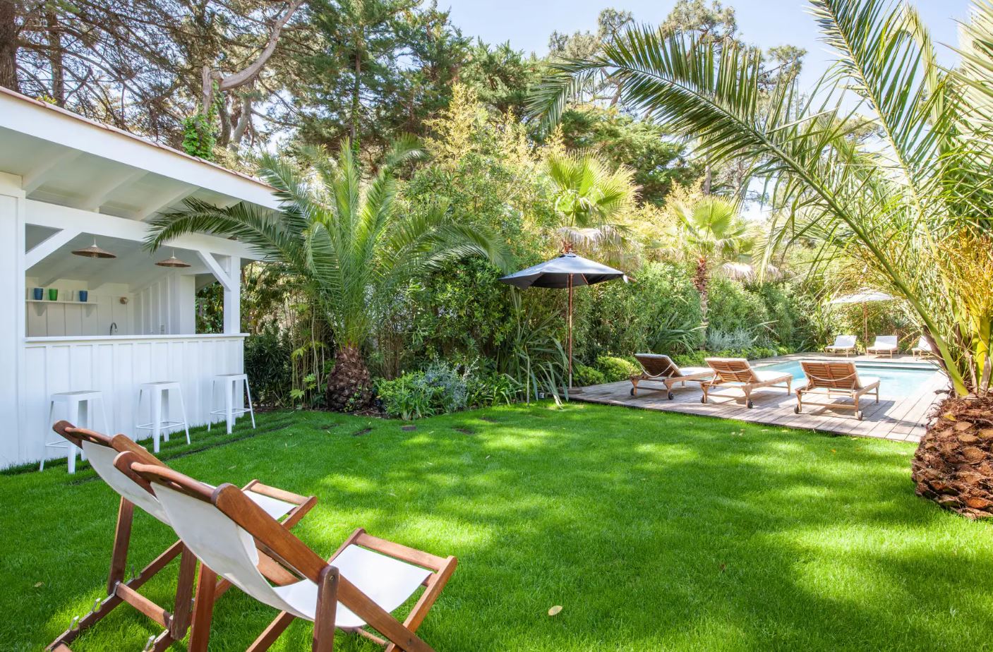 En fait, le jardin de 1000 m² est très bien arboré. Et, l’on peux voir un dégradé de couleur entre le vert des végétaux et la clarté de l’eau transparente de la piscine. Puis, transats sont agréables pour se reposer avant de partir surfer sur l’océan.