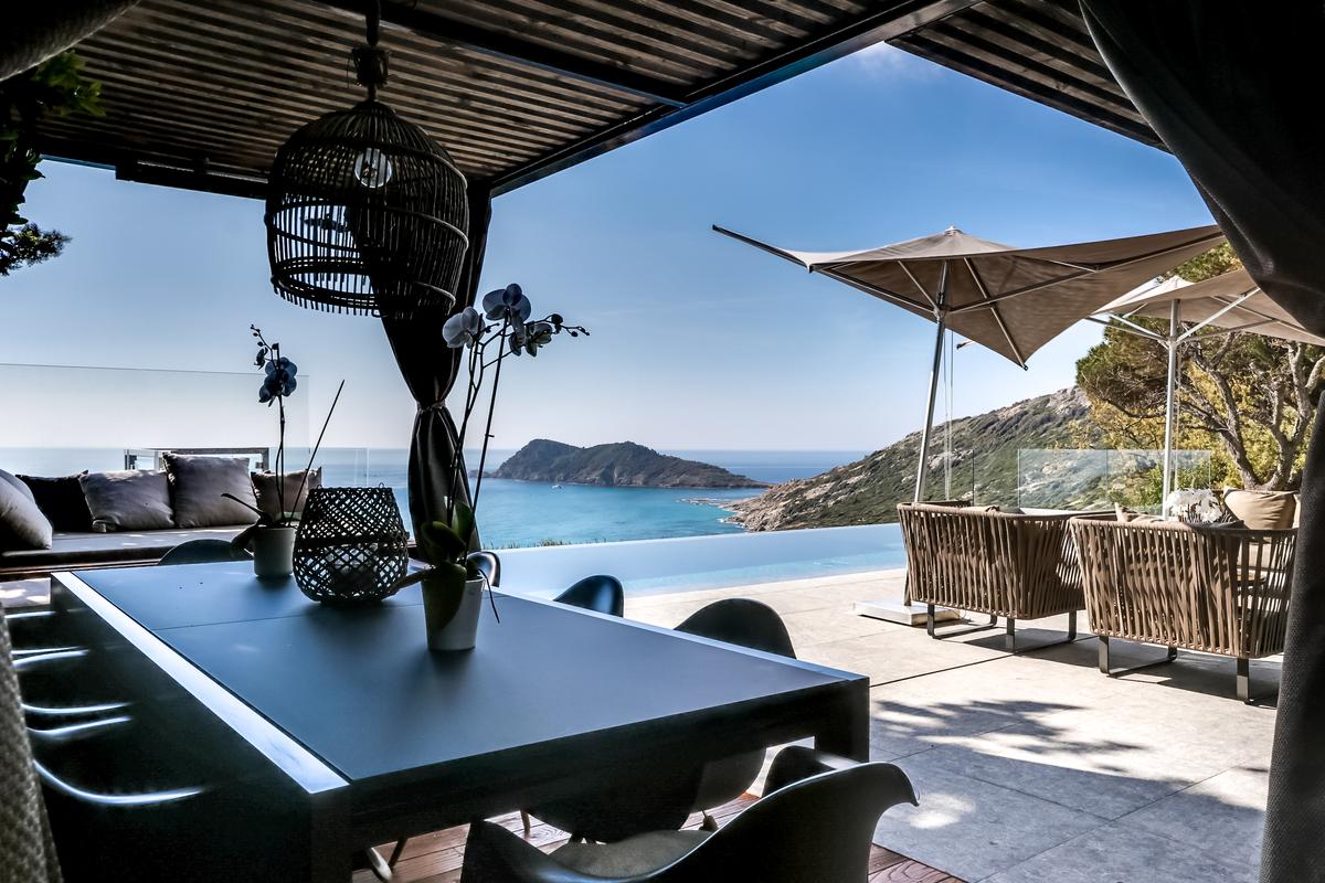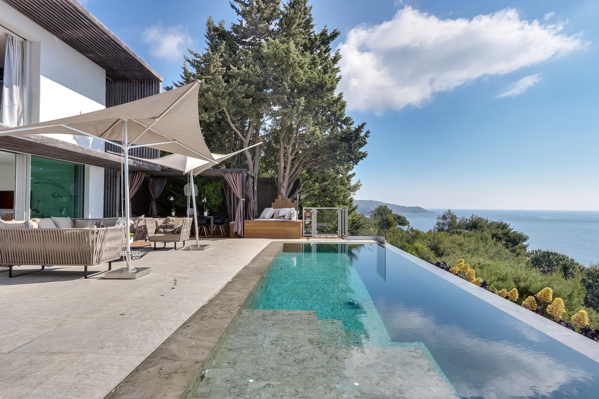 Le cadre est tout simplement éblouissant. Rien ne bloque la vue : vous êtes seul face à face avec la Méditerranée ! La piscine à débordement semble plonger dans la mer, reflétant le ciel azur de la Côte d’Azur. Et pour admirer la vue de jour comme de nuit, d’immenses baies vitrées dans le salon et les chambres à coucher, dont trois avec vue sur la mer, relient l’intérieur aux terrasses extérieures confortablement meublées. Vous pouvez déjeuner ou dîner sous la pergola équipée d’un barbecue et d’un chauffage.