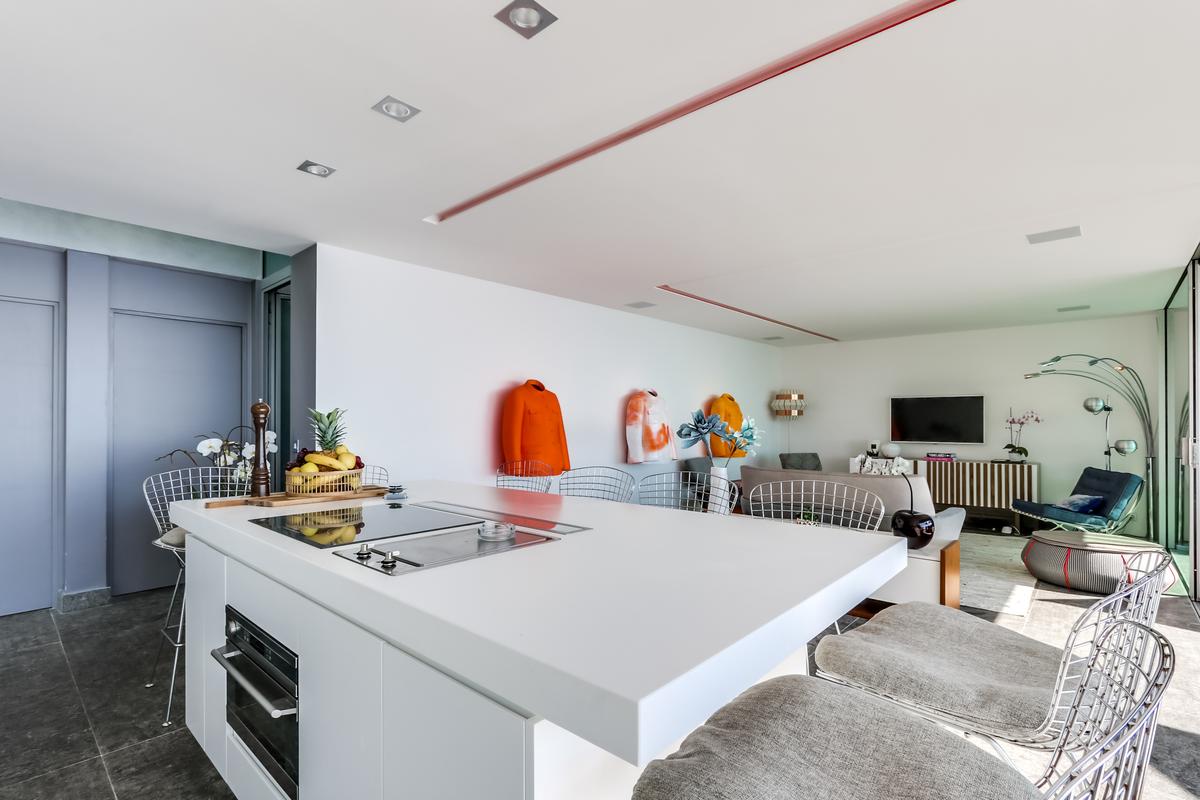 – Cuisine américaine ouvrant sur le séjour et donnant sur la piscine et la mer