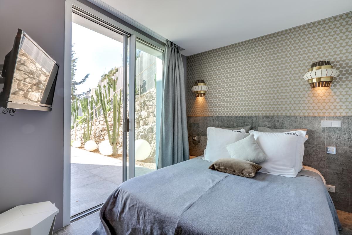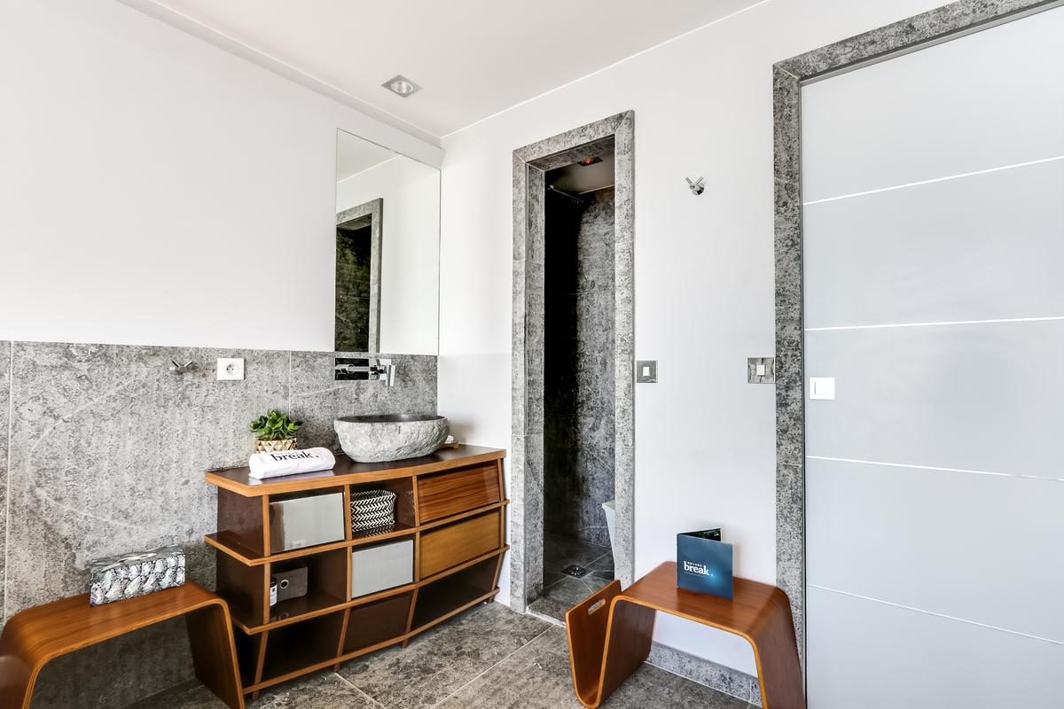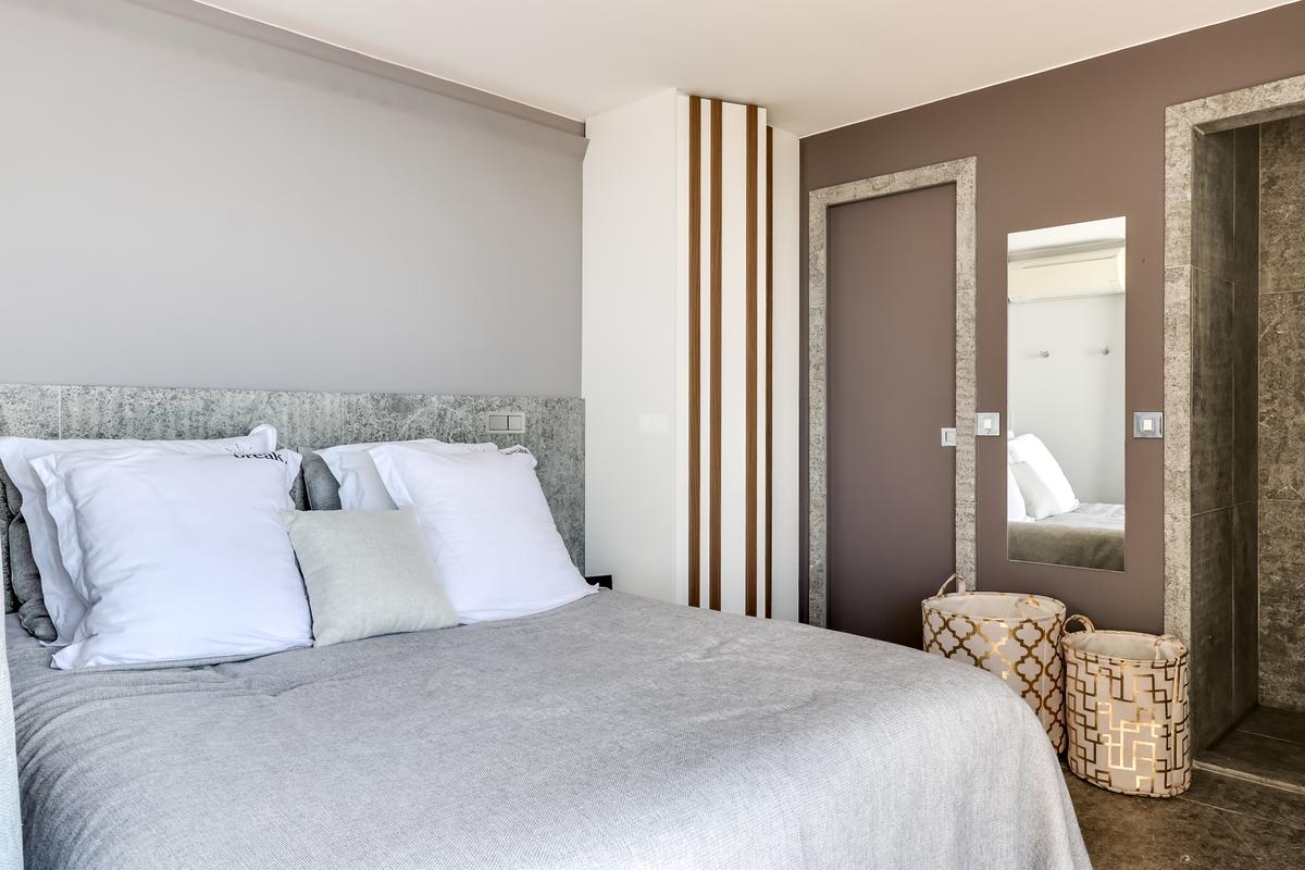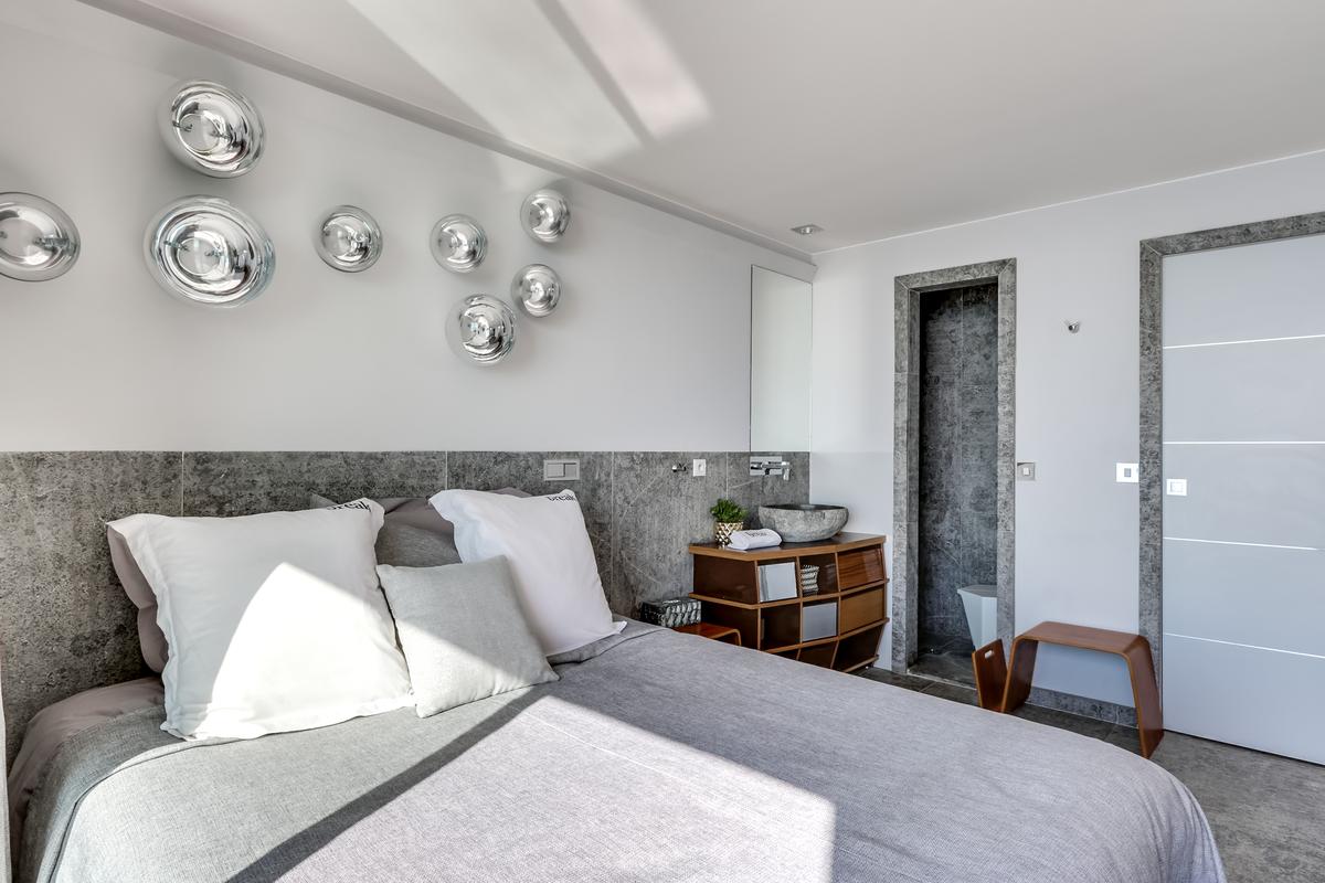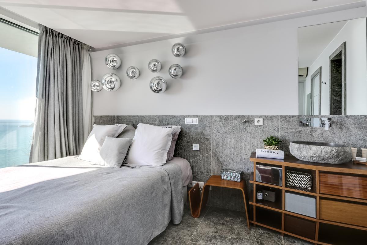 – Chambre 5 : grand lit queen, salle de douche attenante – douche et toilettes, vue mer