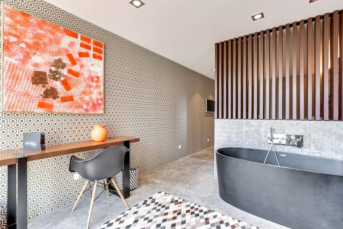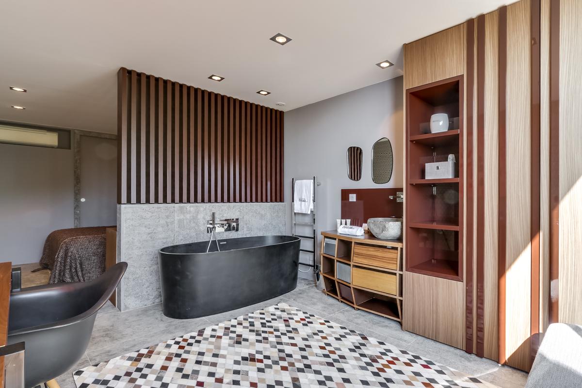 – Chambre 2 : grand lit queen, salle de bain privée : baignoire, douche et toilettes