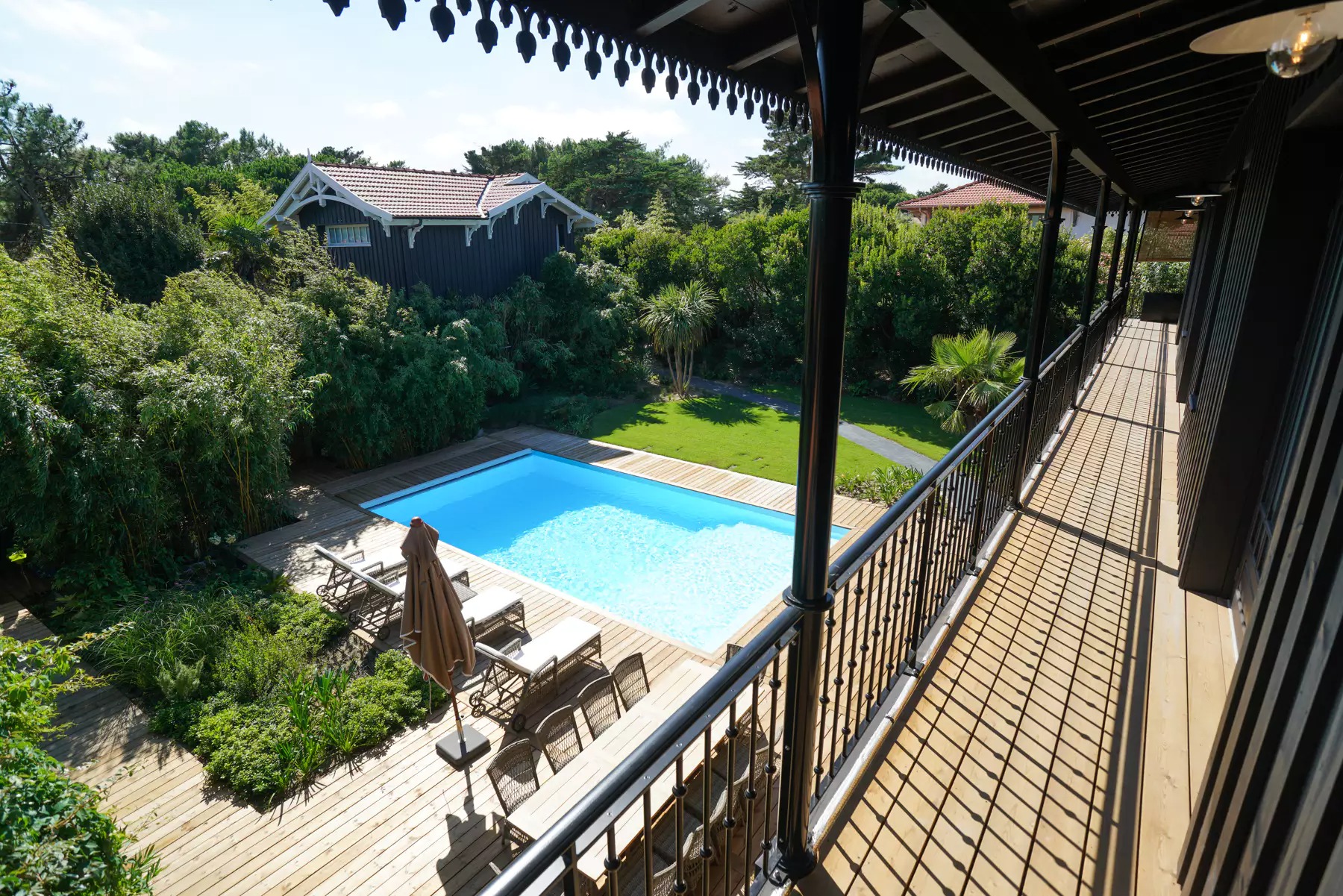 Cette splendide propriété offre la possibilité de passer vos vacances dans un cadre vraiment haut de gamme. De plus, l’une des maisons les plus exclusives de Ferret !!! Un jardin clos avec une belle piscine chauffée de 12M X 5M. Puis, la villa possède une grande terrasse en bois avec chaises longues et table à manger. En fait, Le style architecturale de cette villa enchanteur et moderne faisant la célébrité de Ferret. Les intérieurs soigneusement conçus sont meublés avec un décor confortable et raffiné de style colonial.