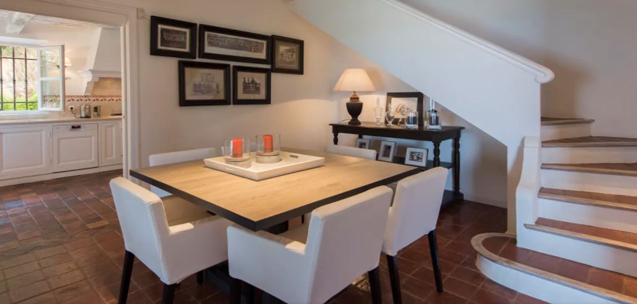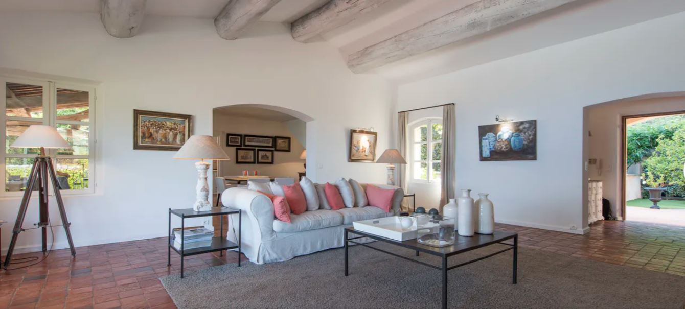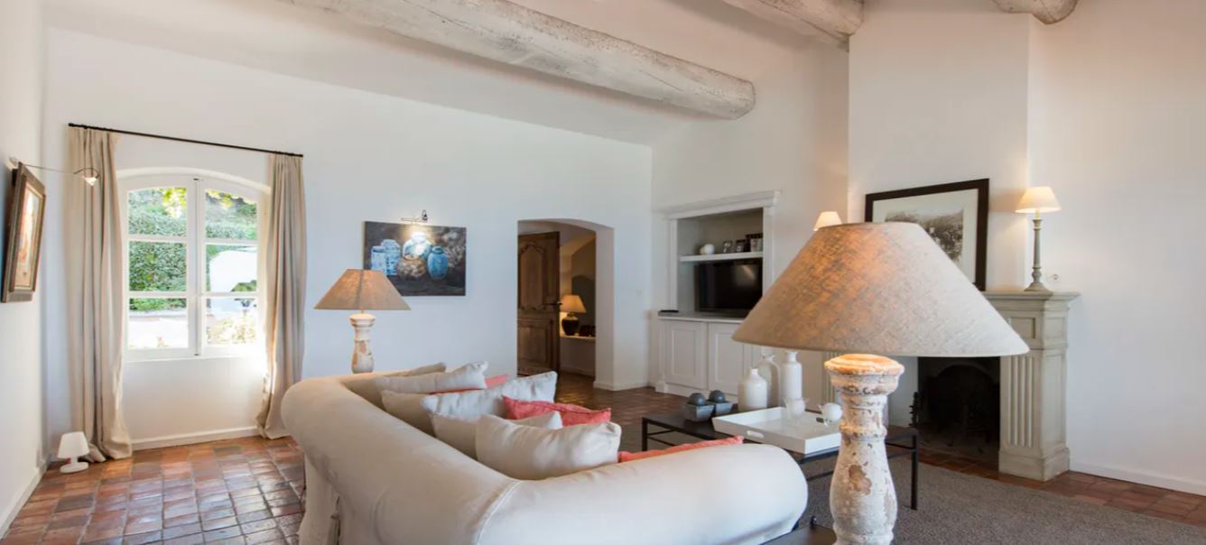 La décoration de style Provençal chic et revisité avec une douceur dans le choix des couleurs et des tissus. Canapé en lin et peinture blanche avec des tableaux pittoresques accrochés au mur. Un grand tapis douillait, des poutres patinées et le carrelage en terre cuite rougeoyant confère un atmosphère très apaisant et convivial à l’espace de vie. La cuisine très fonctionnelle, avec une décoration ambiance bistrot reste dans l’esprit Maison Familiale.