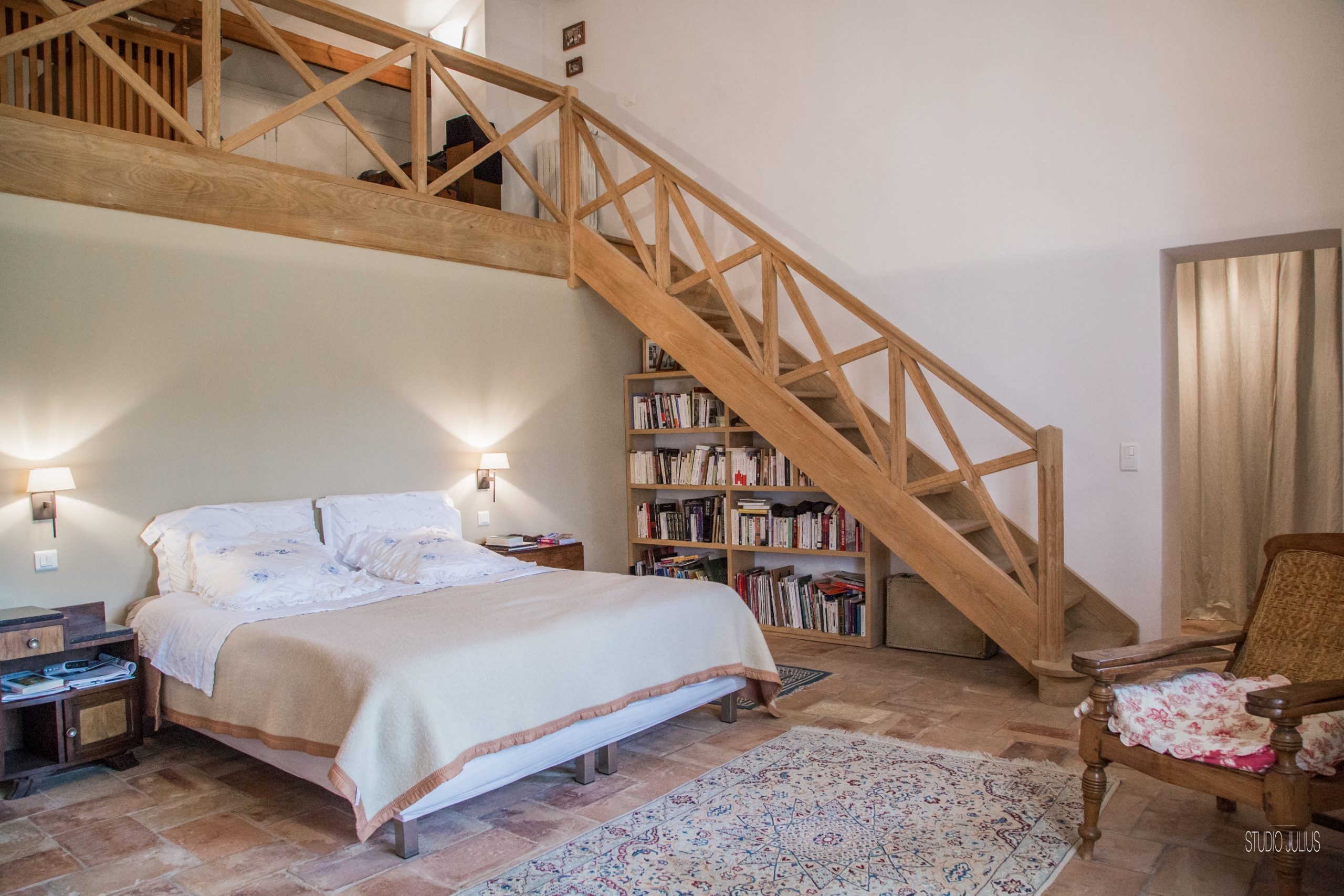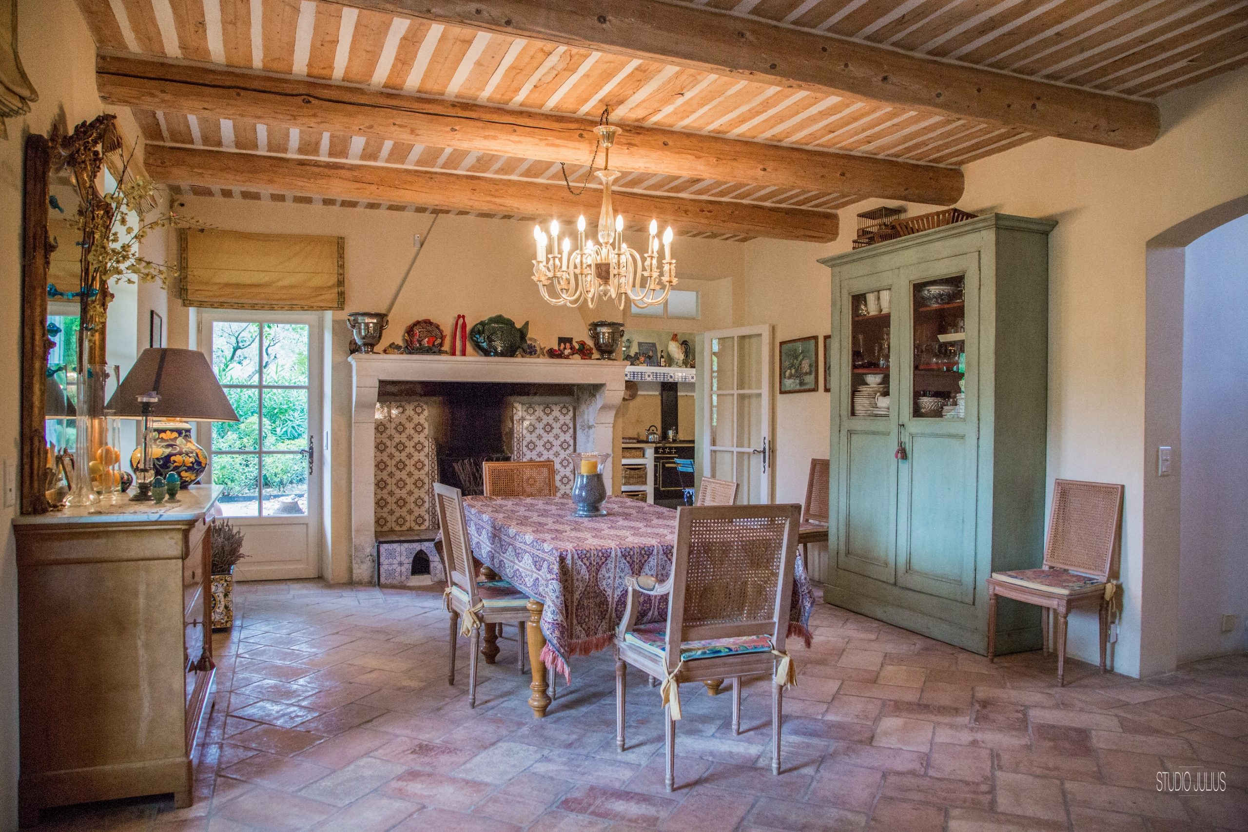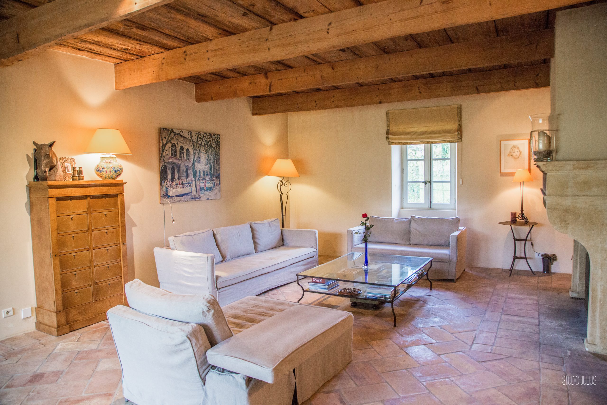 En effet, le rez de chaussée comprends les pièces de vie très vastes. La salle à manger de 35 m² avec une cheminée provençale de charme, une table pour accueillir les 10 convives. Puis, un salon de 45 m² avec cheminée, pour se détendre sur les canapés tout confort. Enfin, Un autre petit salon côté lecture et télévision. Pour finir, 2 escaliers magnifiques nous mènent à l’étage supérieur. Wc invité.
