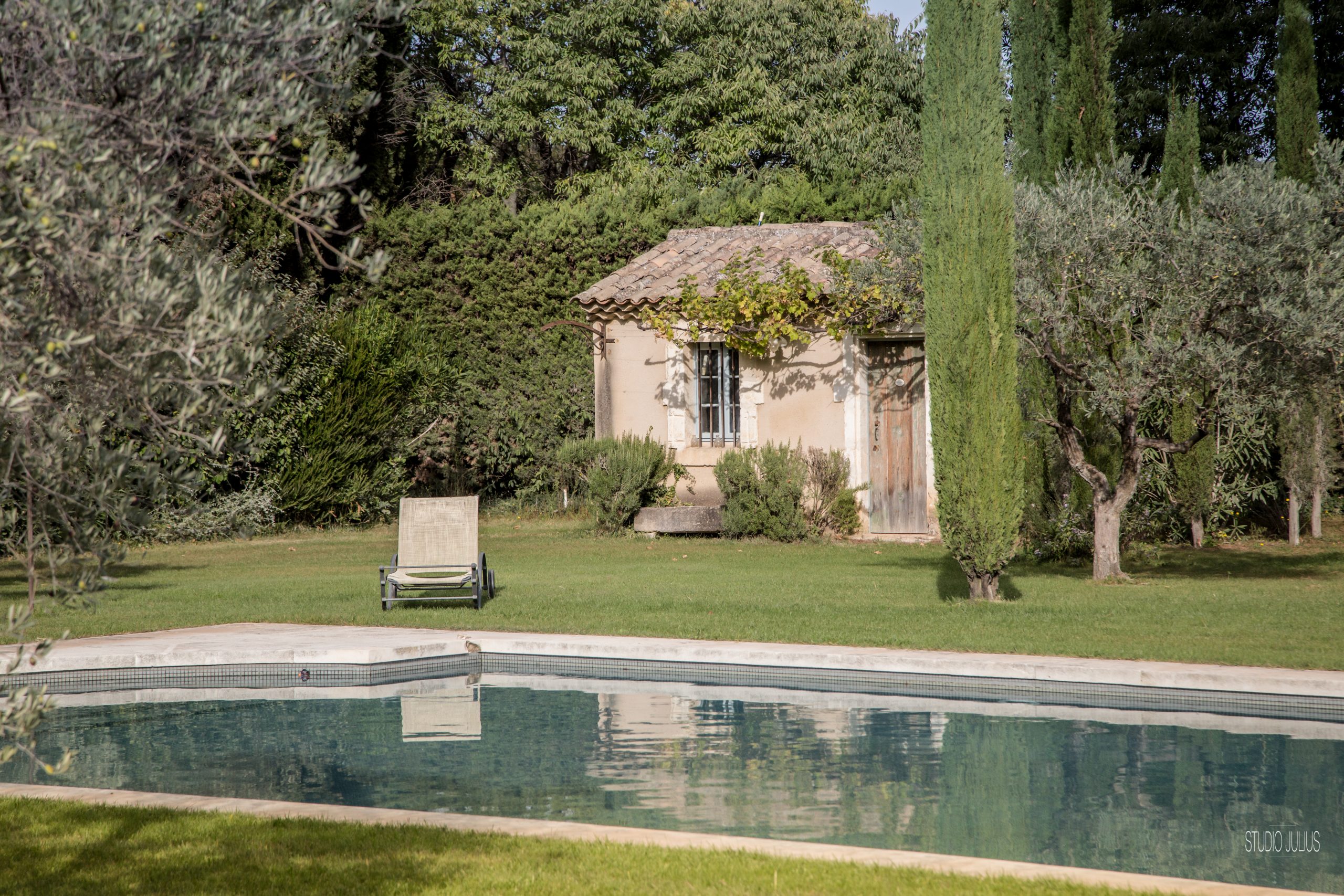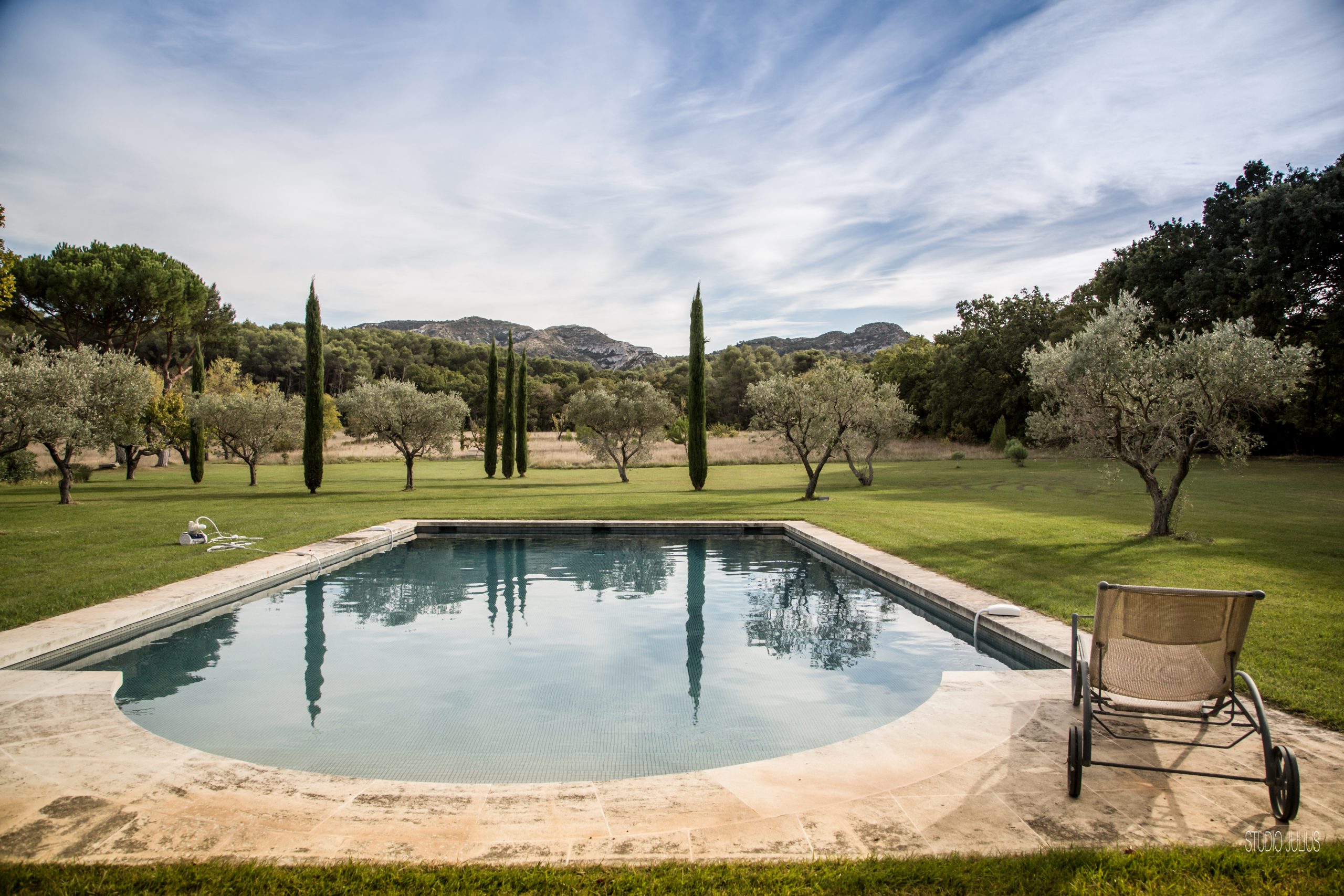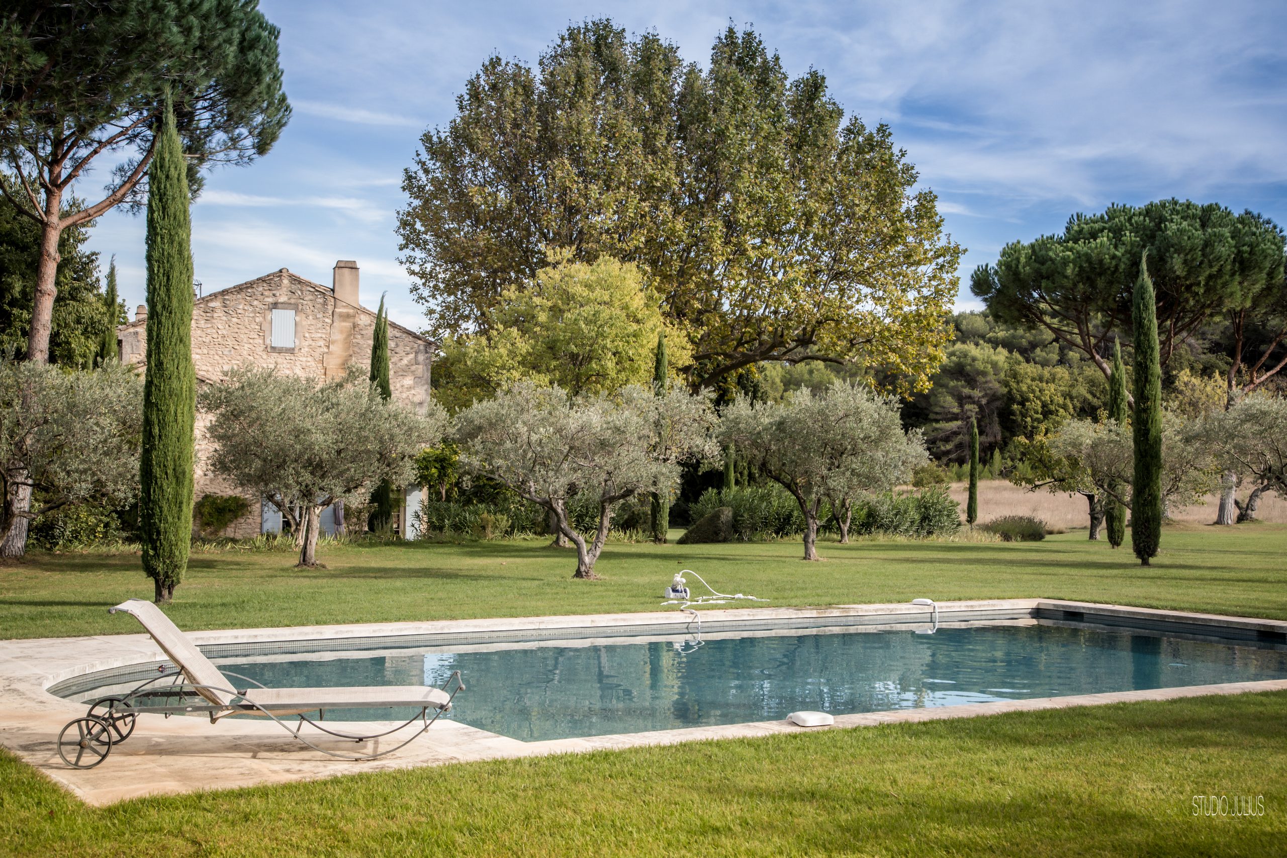 Une piscine privée 12 X 7 M profondeur 1 M/2.10 M. Sécurité par Alarme. Et cette piscine avec un escalier romain rappelant les belles piscines de Florence. Tout près, une treille ombragée dans le jardin clos de 6000 m² en pelouse. Un jardin de prestige avec des cyprès de Florence et oliviers. De plus, une belle vue sur les Alpilles et la campagne. Des équipements extérieurs avec du mobilier haut de gamme.
