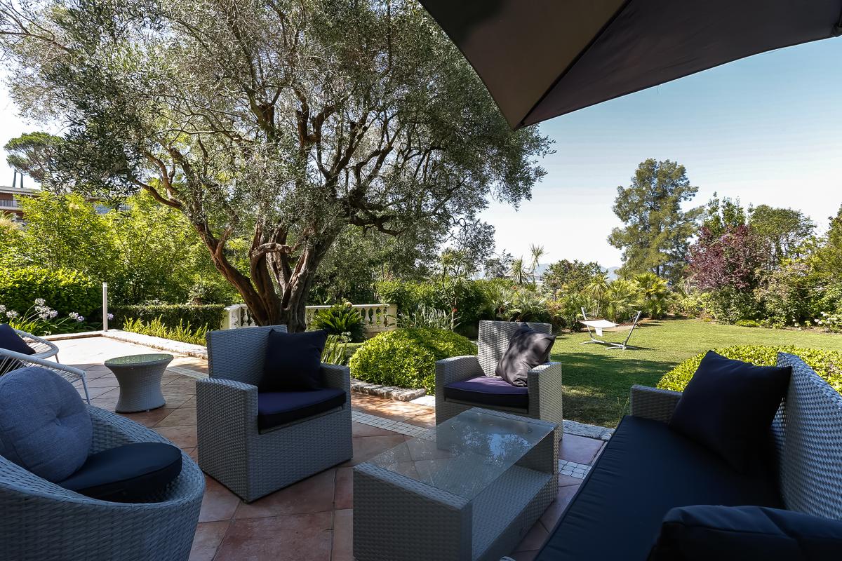 Enfin, la terrasse meublée ajoute vraiment plus d’espace de vie, avec une table et un coin salon, ombragé par un magnifique olivier.