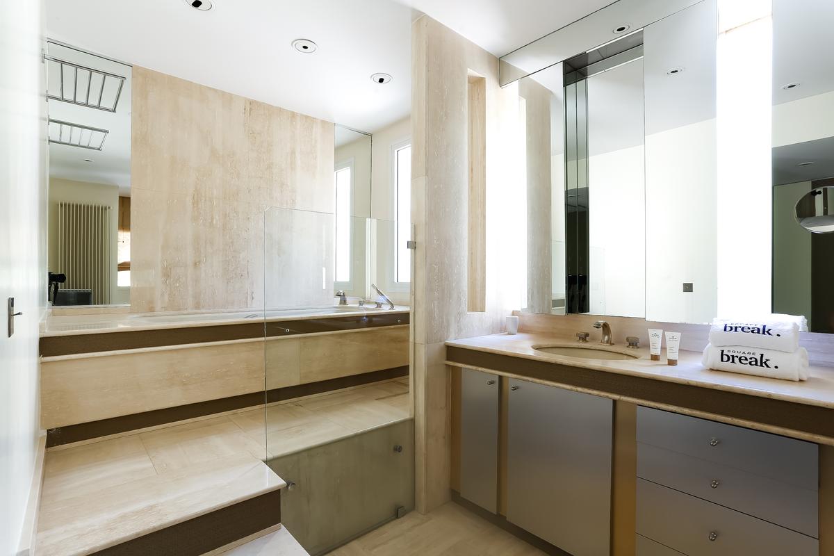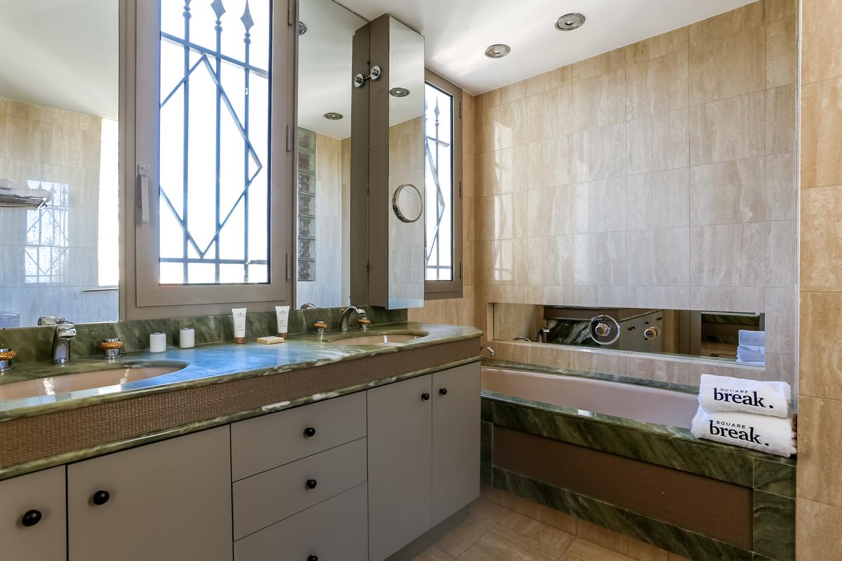 – Chambre 3 : lits jumeaux de 90 cm, accès à la terrasse, salle de bains attenante – baignoire, douche et toilettes