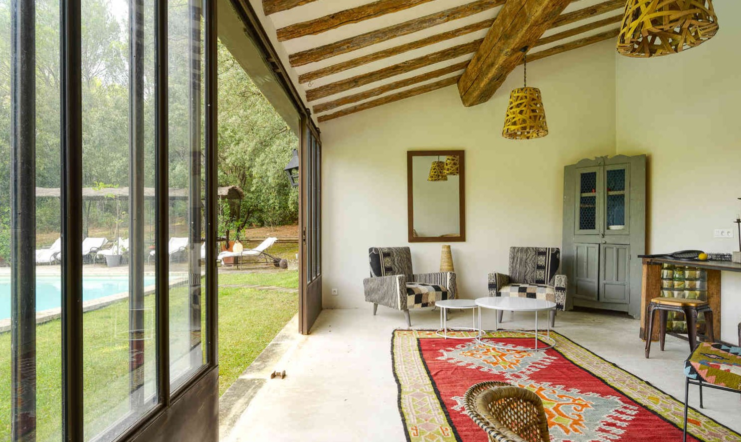 La fontaine adossée directement à la villa donne une atmosphère de paix. Un élégant pool house pour profiter de la piscine et faire la sieste sur les beau canapé.