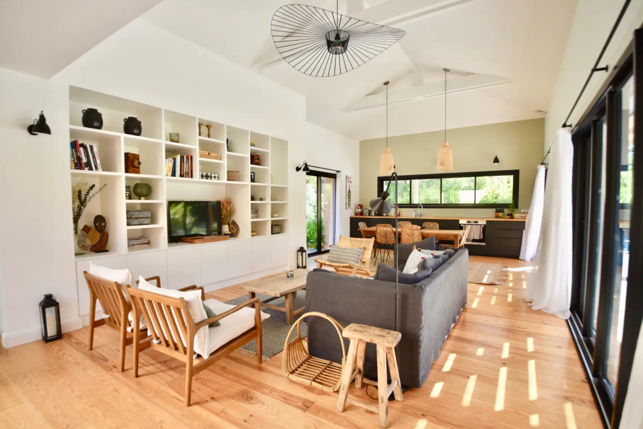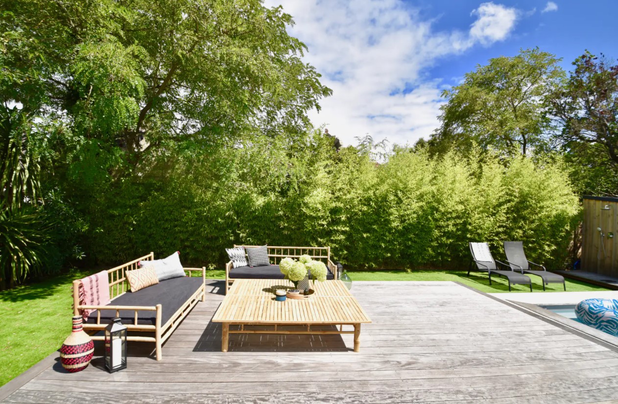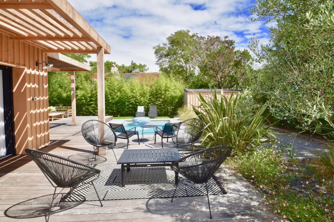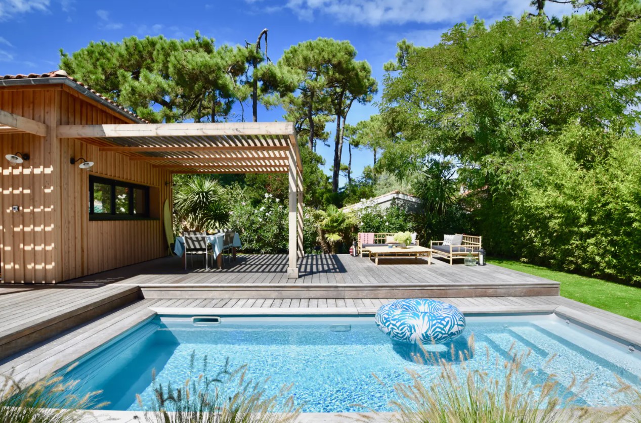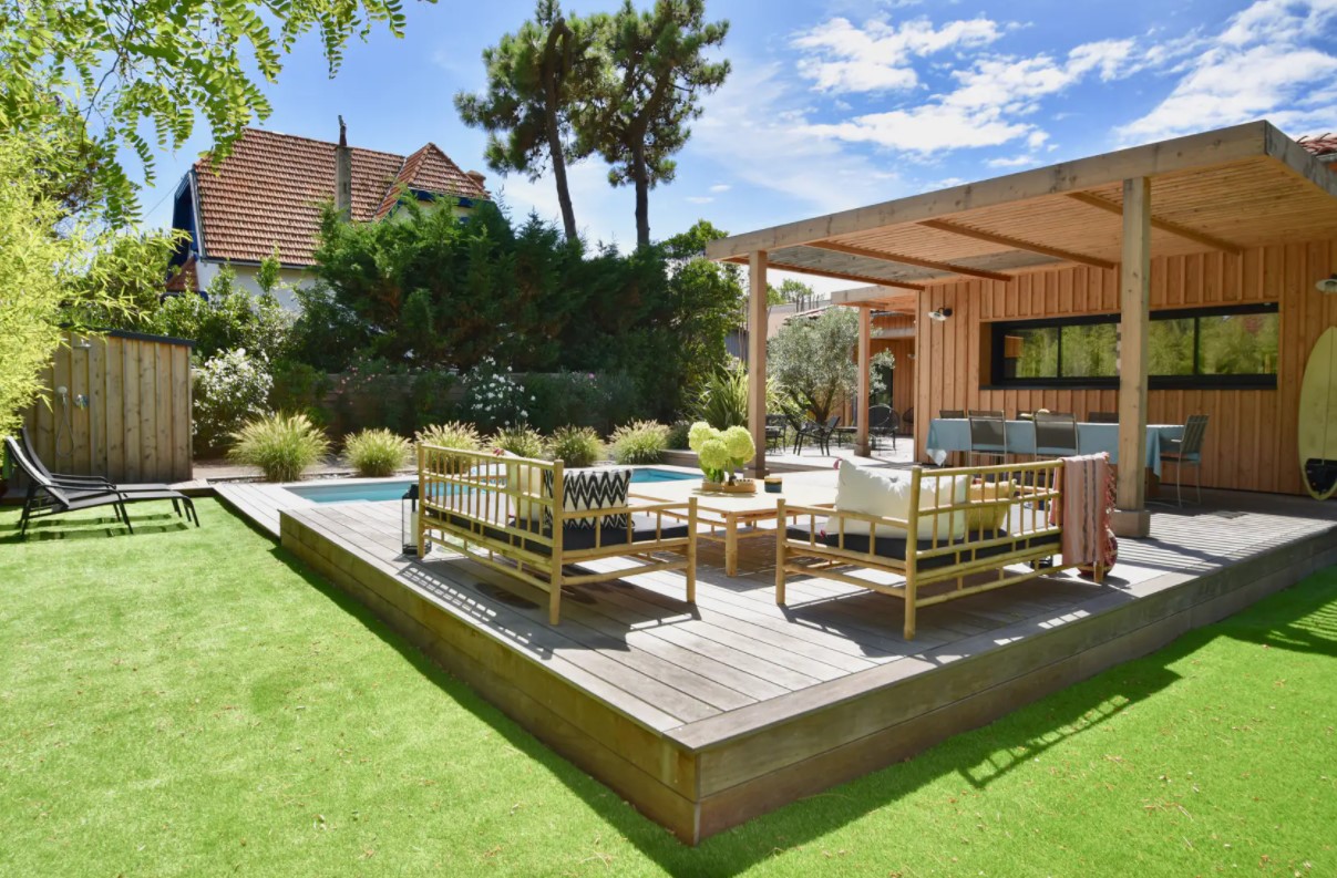 De grandes terrasses pour passer de bons moments en famille ou entres amis et décompresser pour des vacances inoubliables. La piscine de taille moyenne est chauffée cependant très agréable pour se prélasser appréciant le calme du quartier résidentiel. Ensuite, il est agréable de diner autour d’une table familiale sur la terrasse en bois.