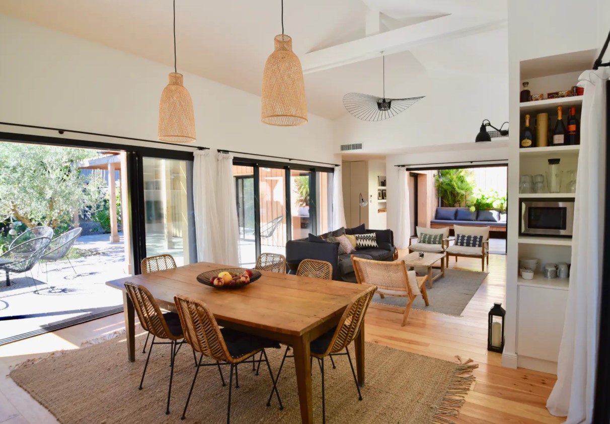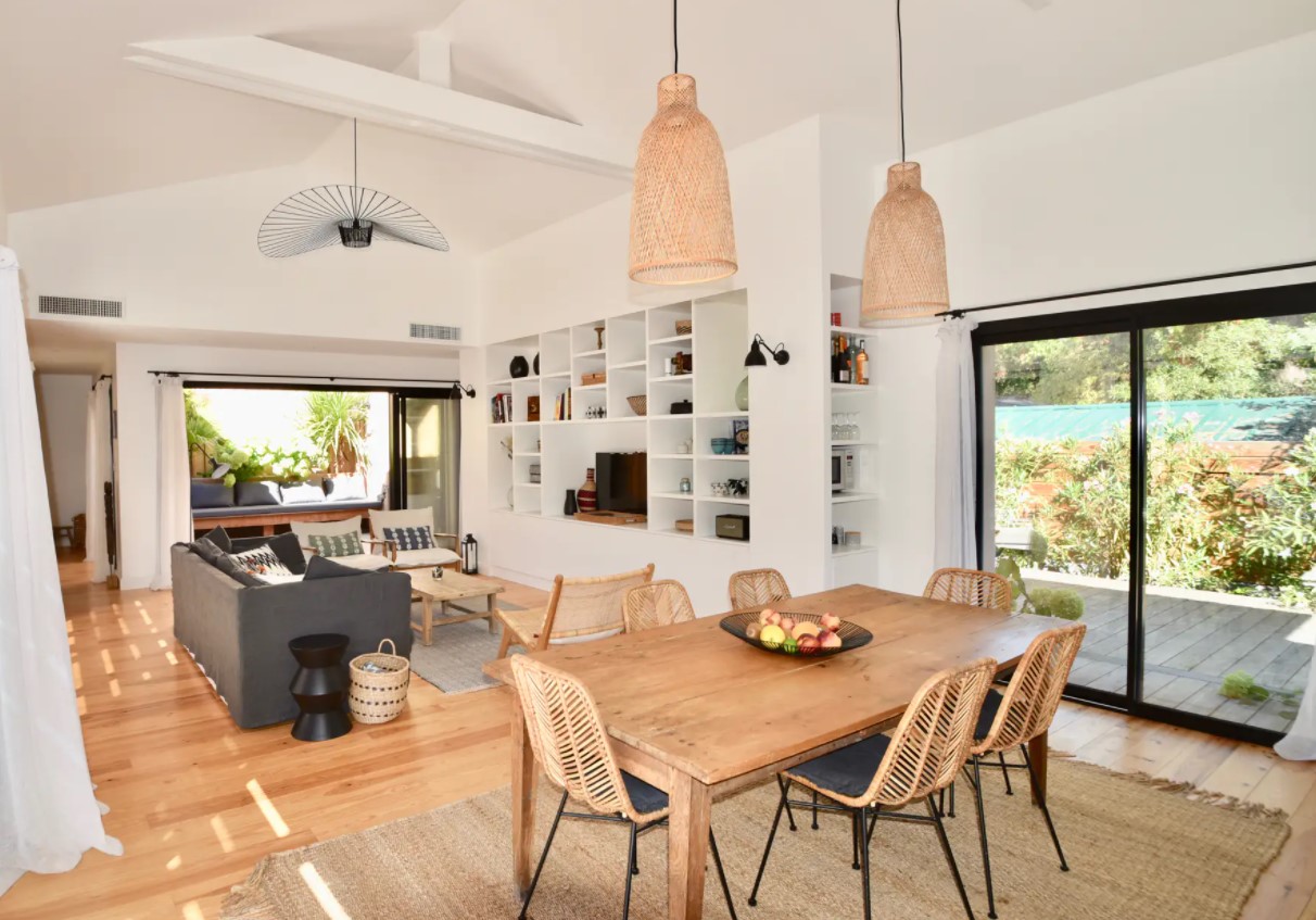Puis, le reste de la villa est bien équipée, la cuisine est spacieuse entièrement équipée. De plus, un salon avec 2 beaux canapés en tissu et une salle à manger possédant une belle table pour accueillir les 6 convives.