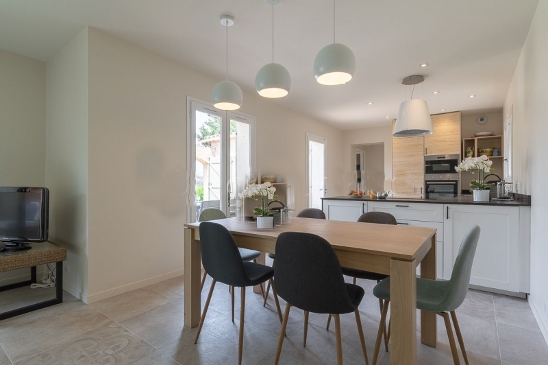 Les pièces de vies se trouvent en rez de chaussée ainsi que les 2 chambres doubles avec salle de bain privée. Au premier étage on retrouve 2 autres chambres avec une salle de bain à partager.