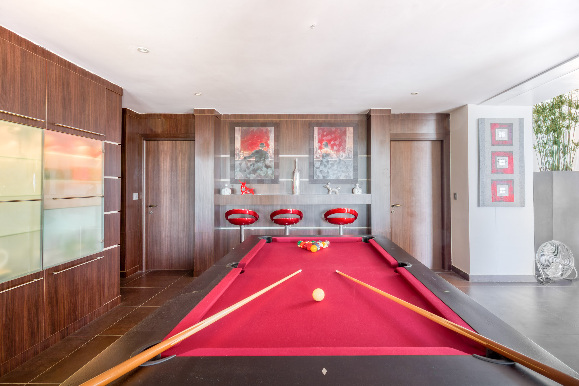 Premièrement, au rez de chaussée de cette villa depuis l’entrée, nous arrivons dans un immense salon haut en plafond, avec des voûtes. En effet, un grand salon lumineux équipé d’un canapé et de fauteuils confortables. Puis, vous disposez d’un bureau, d’un salon télévision avec toutes les chaînes satellites. Certainement, cette villa présente toutes les prestations du luxe, une magnifique salle à manger dont une table accueillant 10 convives. Et, une salle de billard avec bar. En prolongement de la salle de billard, la cuisine entièrement équipée de matériels de très haute performance, fours et zone de cuisson teppanyaki et autres. En effet, les pièces de vies entourées de grandes baies vitrées offrant une vue impressionnante sur la mer. Enfin, à l’extérieur de la cuisine, une belle terrasse couverte avec salle à manger outdoor qui comprends une grande table avec de fauteuils relaxant, une plancha grande et un barbecue. Dans un coin de la terrasse, l’espace salon pour siroter avec vos amis.