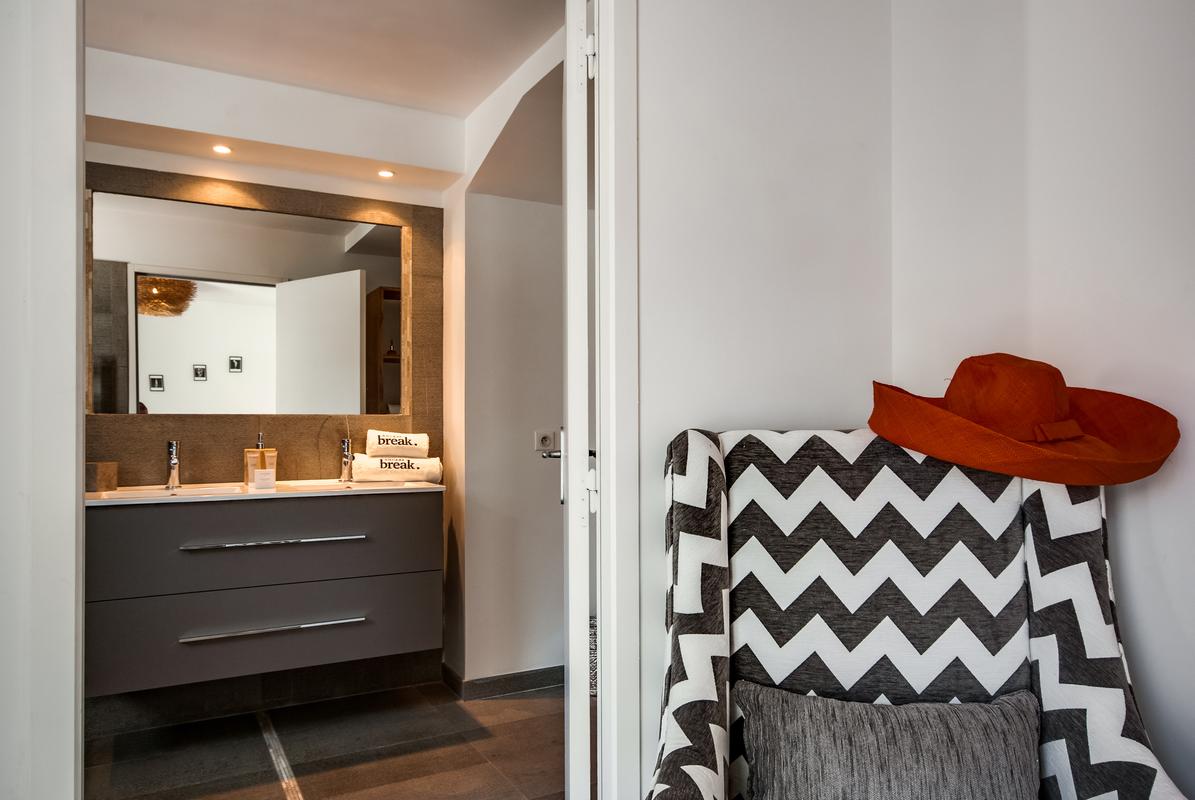 – Chambre à coucher 3 – lits jumeaux (90cm) qui peuvent s’unir pour former un lit king size (180cm), mène au jardin, salle de douche attenante