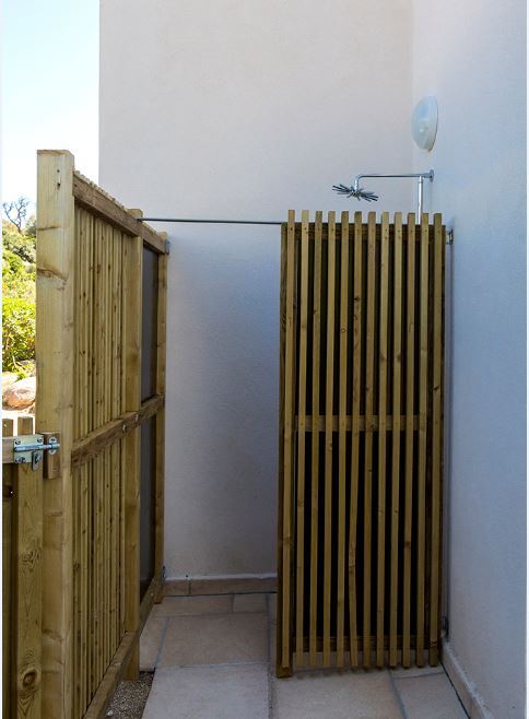 Un grand terrain plat et clôturé avec piscine, équipée de mobilier extérieur et transats. Parking, terrain de boules et douche extérieure.