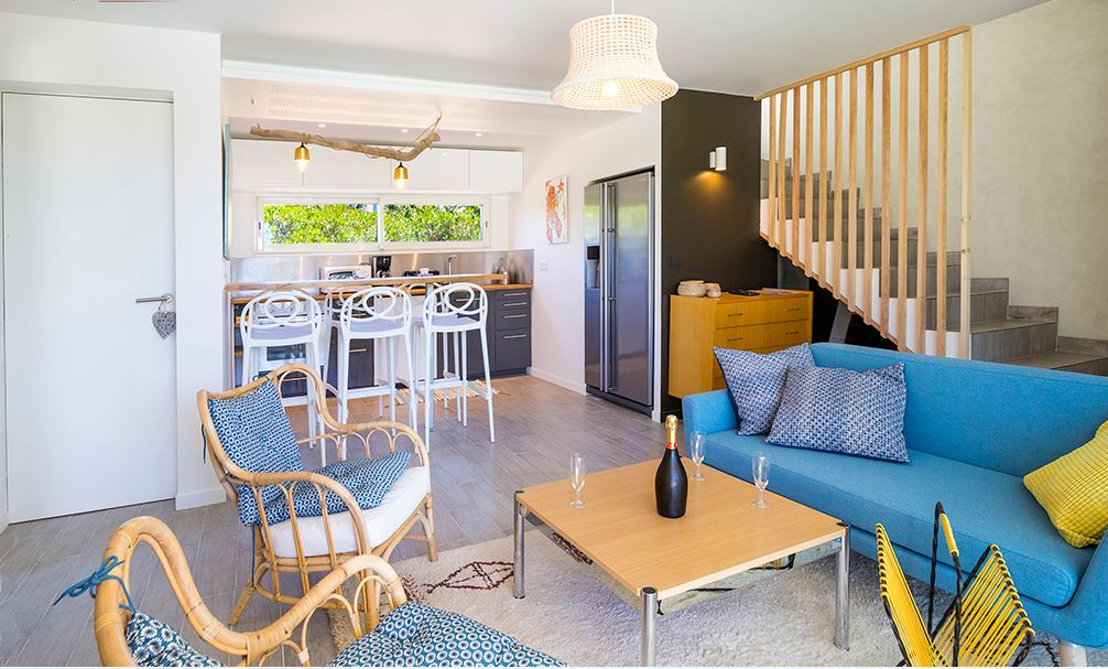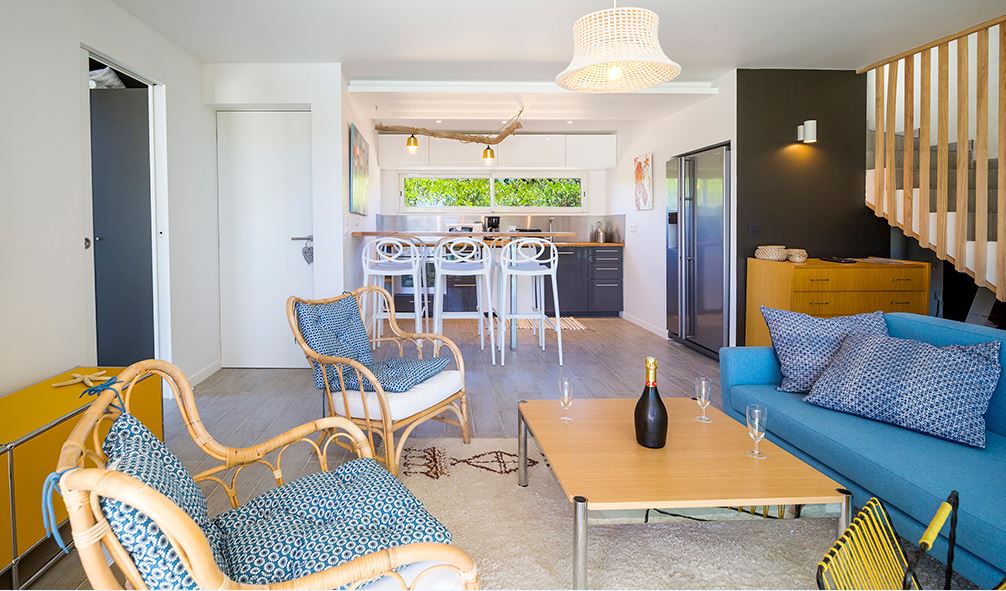 Un espace pièce de vie spacieux avec salon, séjour et cuisine ouverte entièrement équipée. Ensuite, 1 chambre double 160 avec salle de douche et WC de plain pieds. Puis à l’étage, 2 chambres doubles 160 avec salle de douches attenantes et wc indépendant.