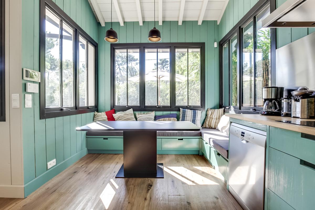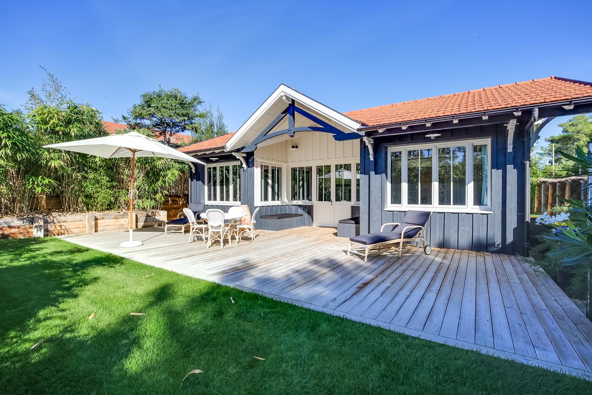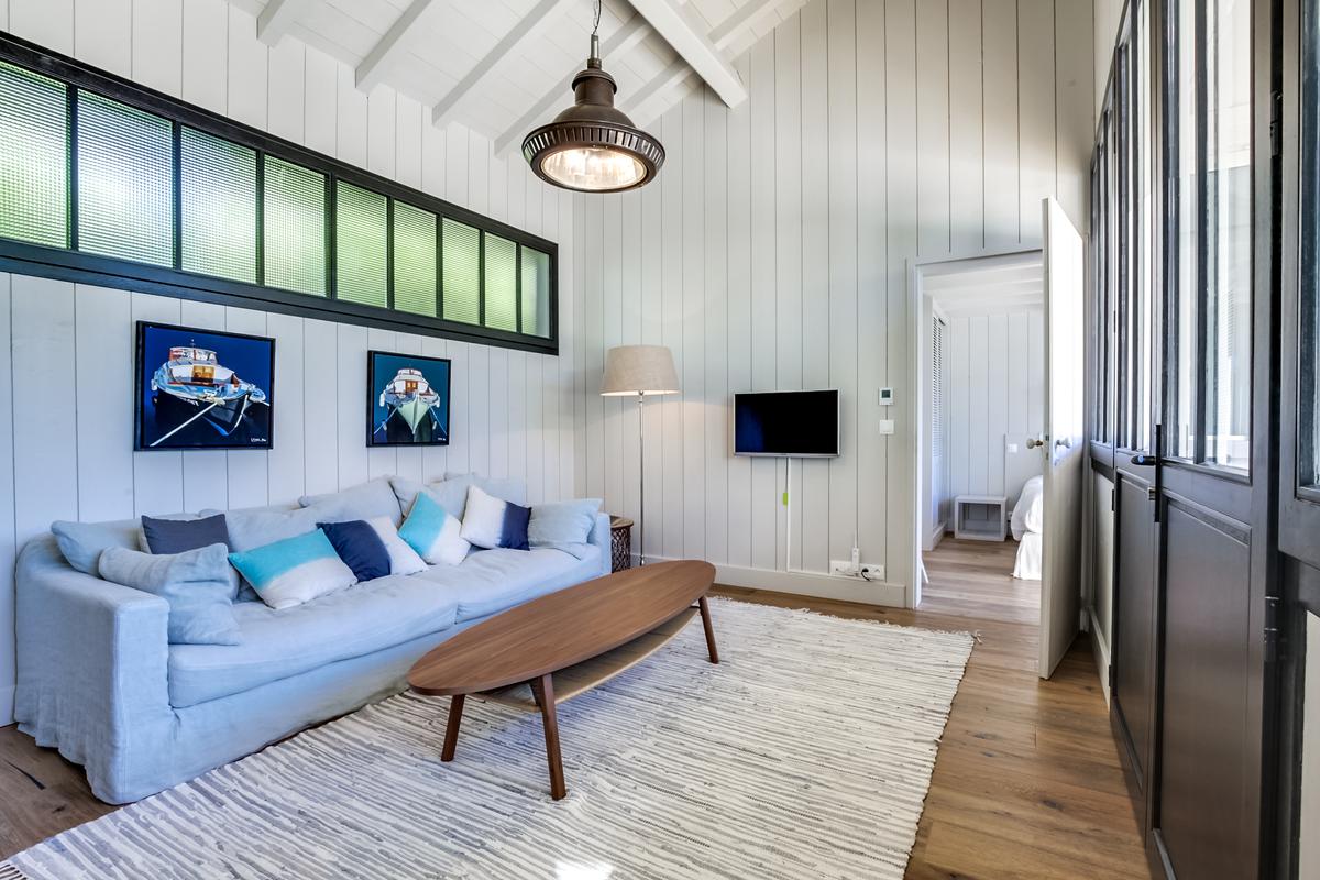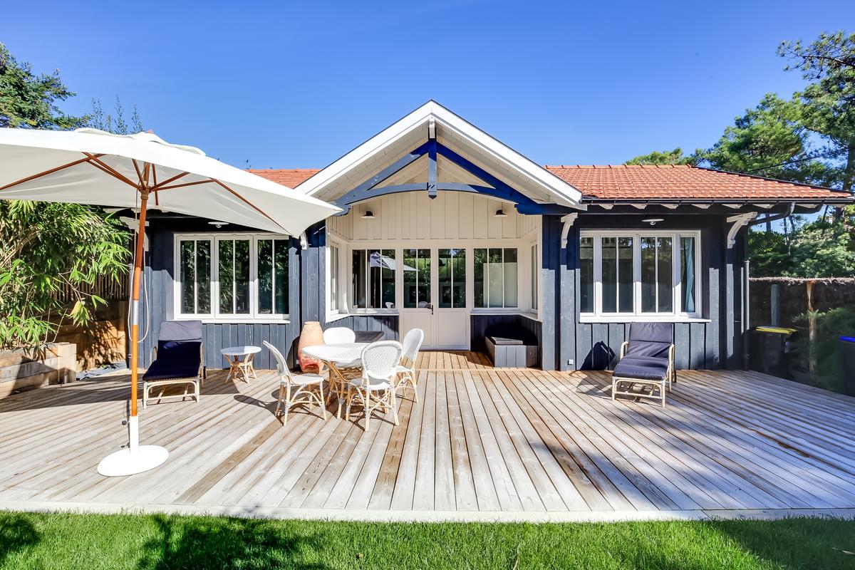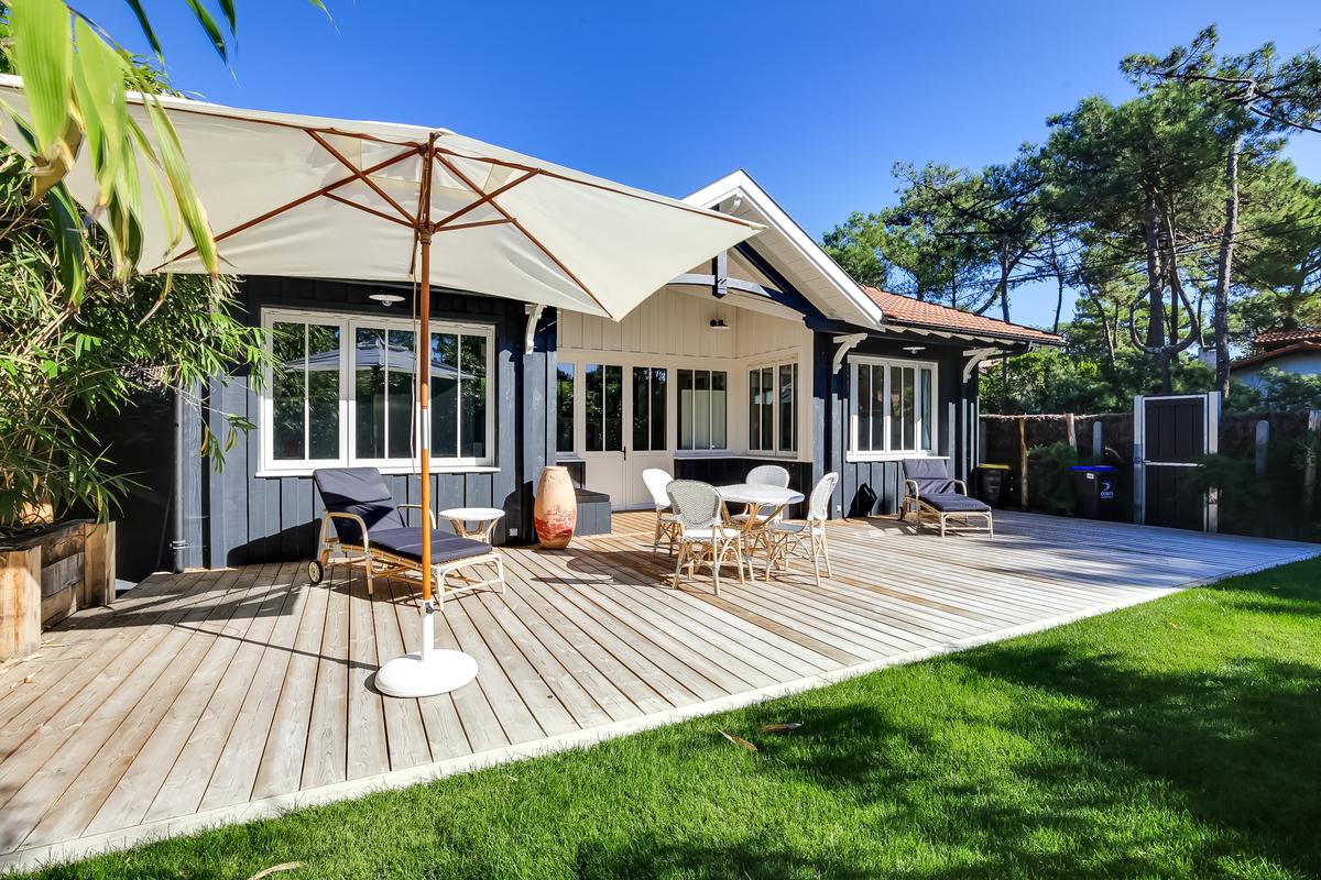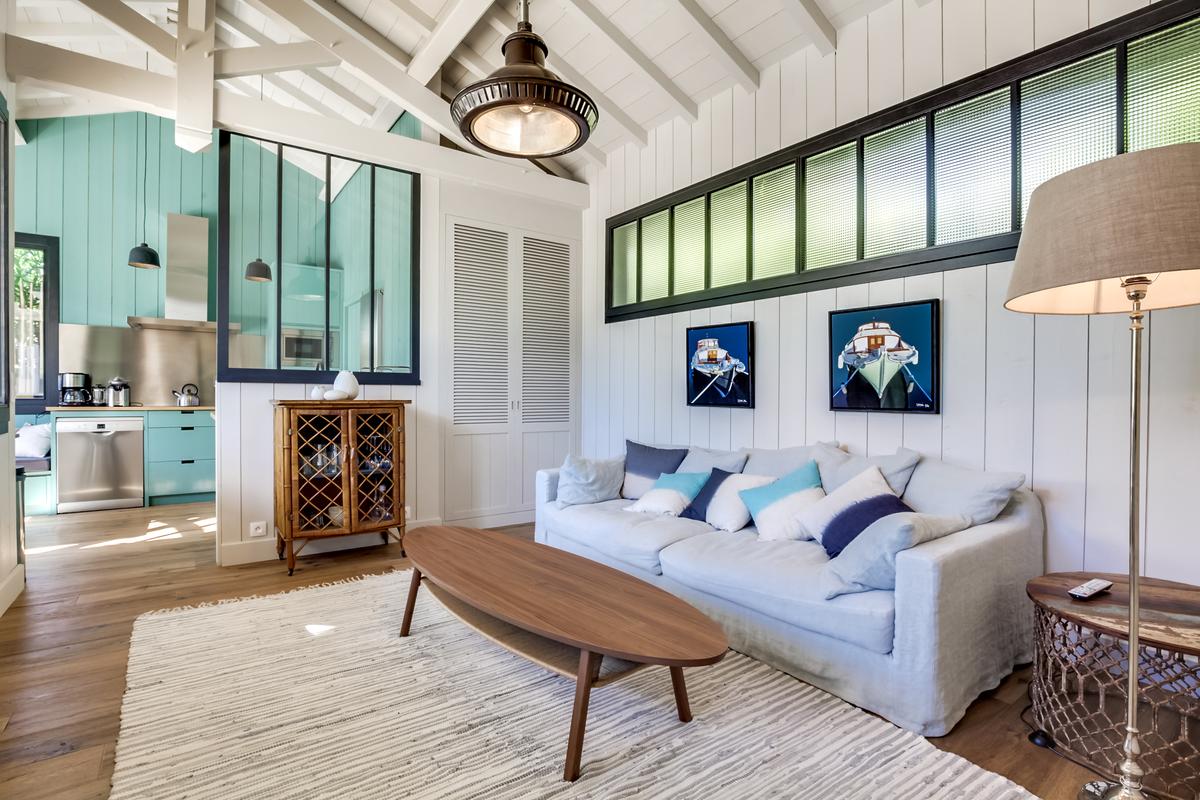 Ce chalet de construction récente est un petit bijou de décoration marine contemporaine, intime et chaleureuse, très bien situé. C’est dans le quartier du phare du Cap Ferret. Ce qui signifie qu’il est facile de tout faire à pied, que ce soit pour aller au marché ou à la plage, que ce soit les plages de l’océan ou celles de la baie.