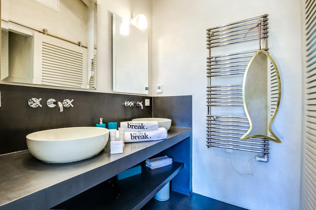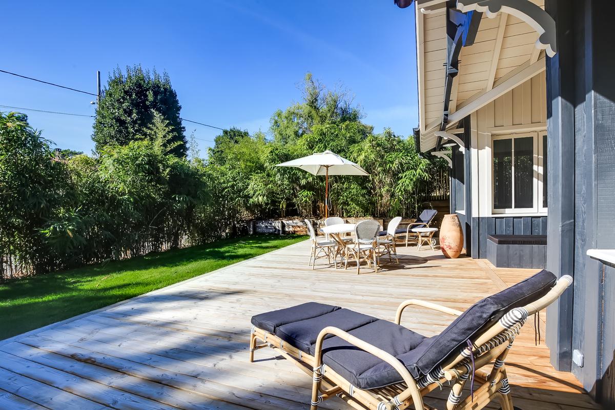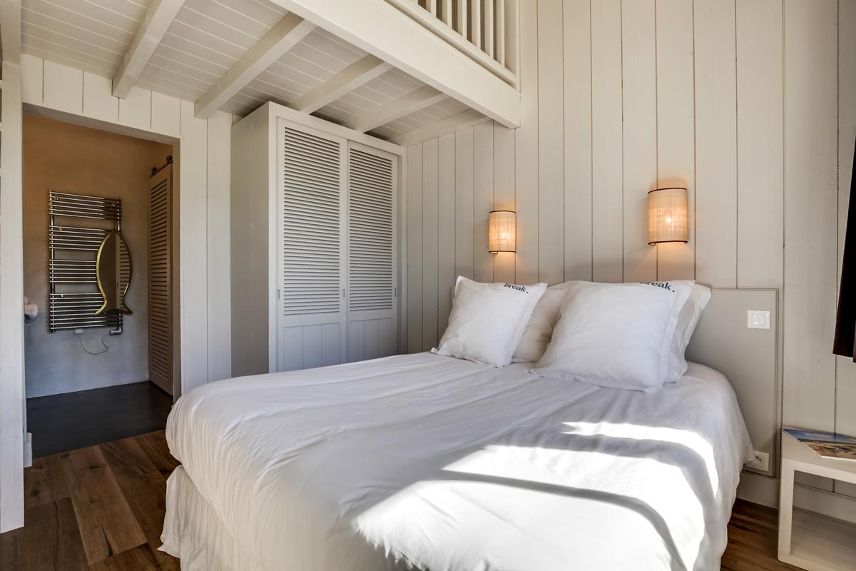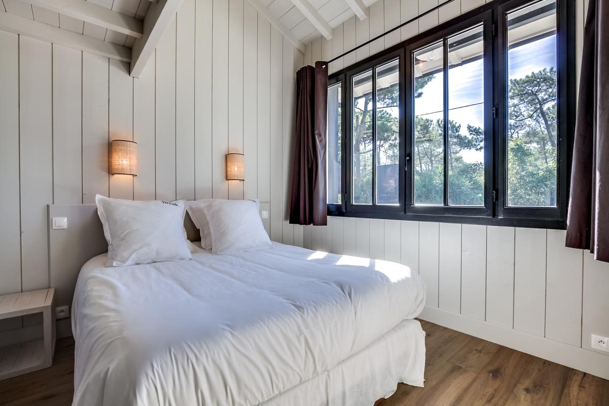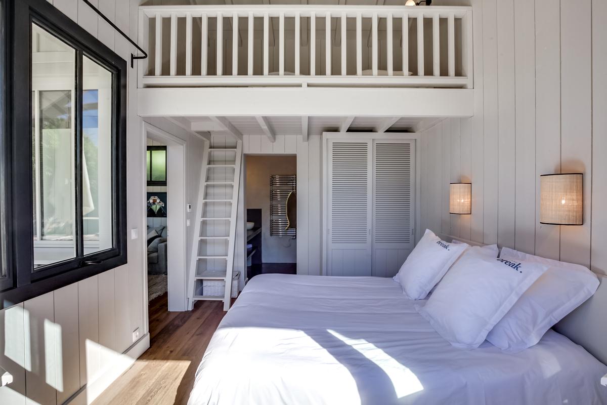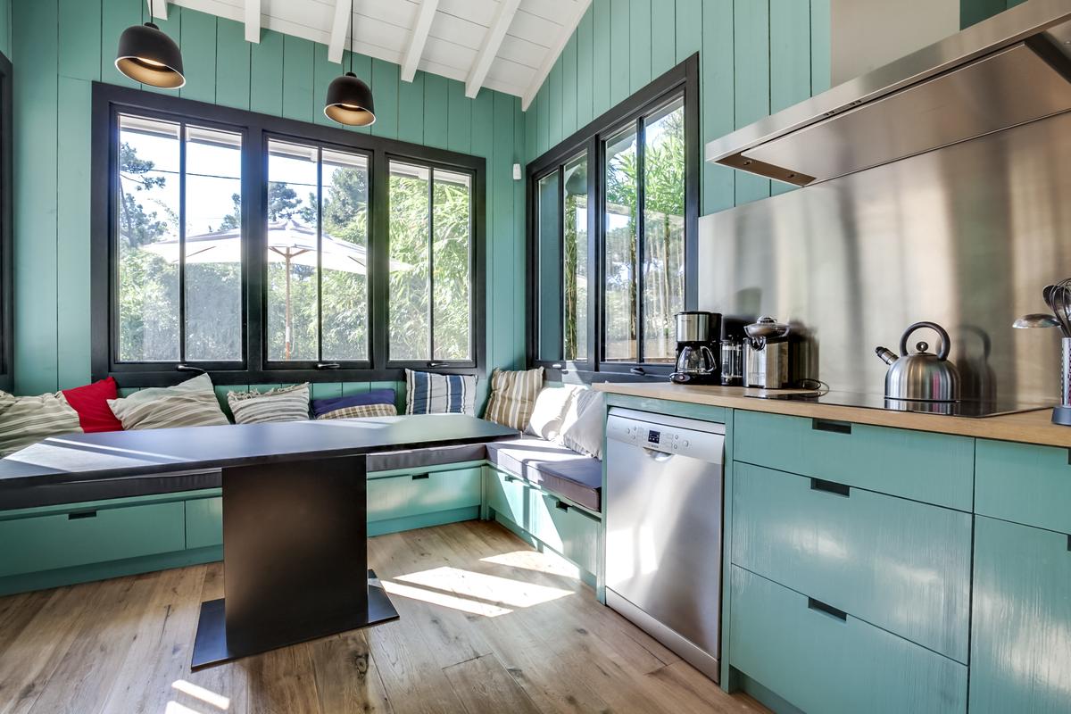 Ce chalet de construction récente est un petit bijou de décoration marine contemporaine, intime et chaleureuse, très bien situé. C’est dans le quartier du phare du Cap Ferret. Ce qui signifie qu’il est facile de tout faire à pied, que ce soit pour aller au marché ou à la plage, que ce soit les plages de l’océan ou celles de la baie.