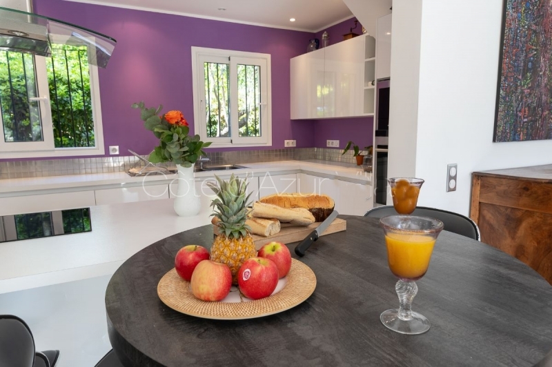 Une belle terrasse accessible depuis la cuisine, équipée de mobilier extérieur très confortable. Une grande table familiale pour recevoir 6 à 8 convives avec des chaises confortables. En effet, après le bon repas, une sieste au bord de la piscine sur une autre terrasse équipée de transats et de parasols.