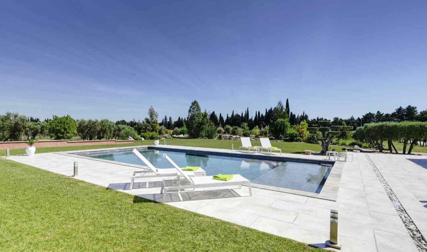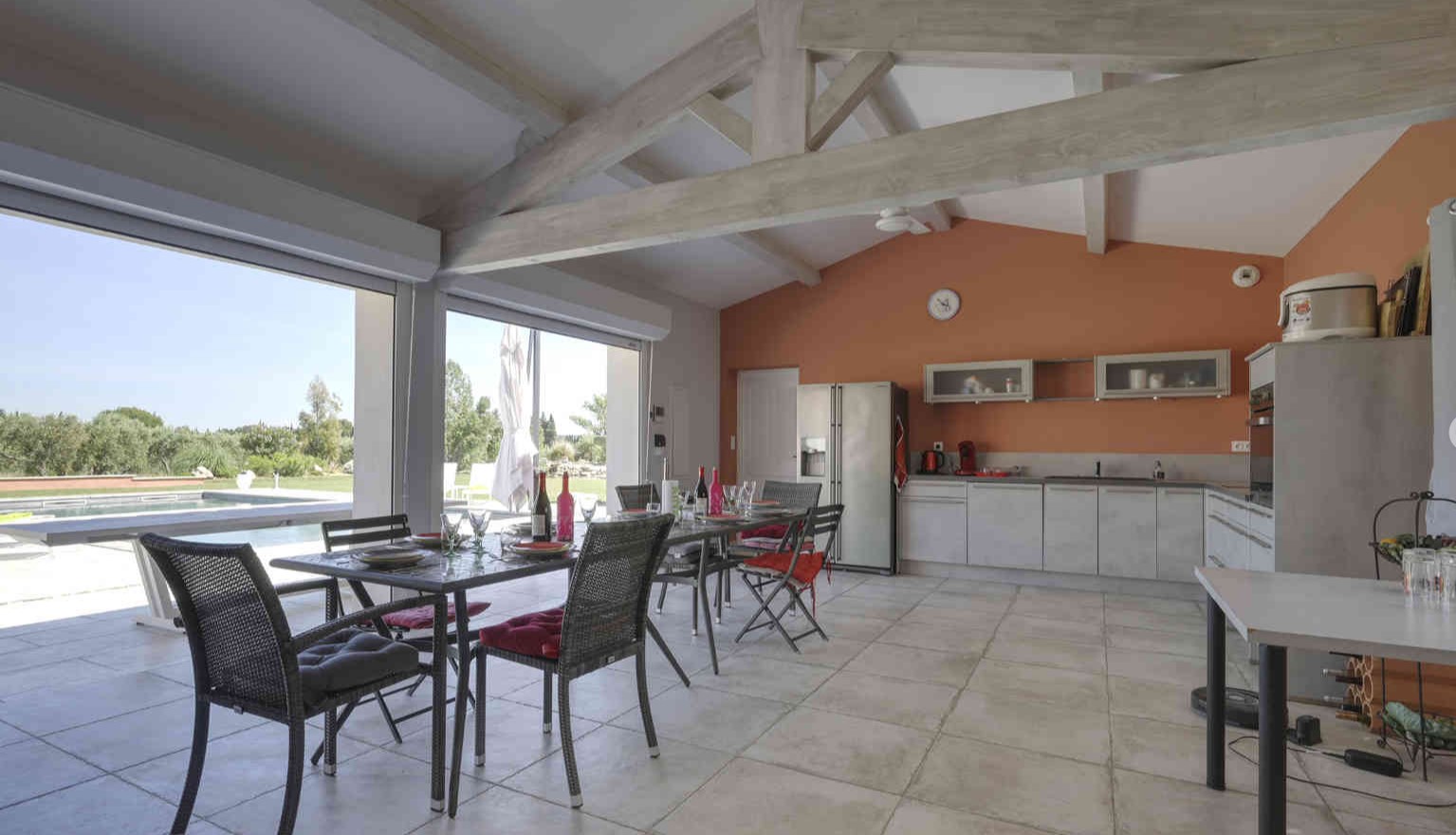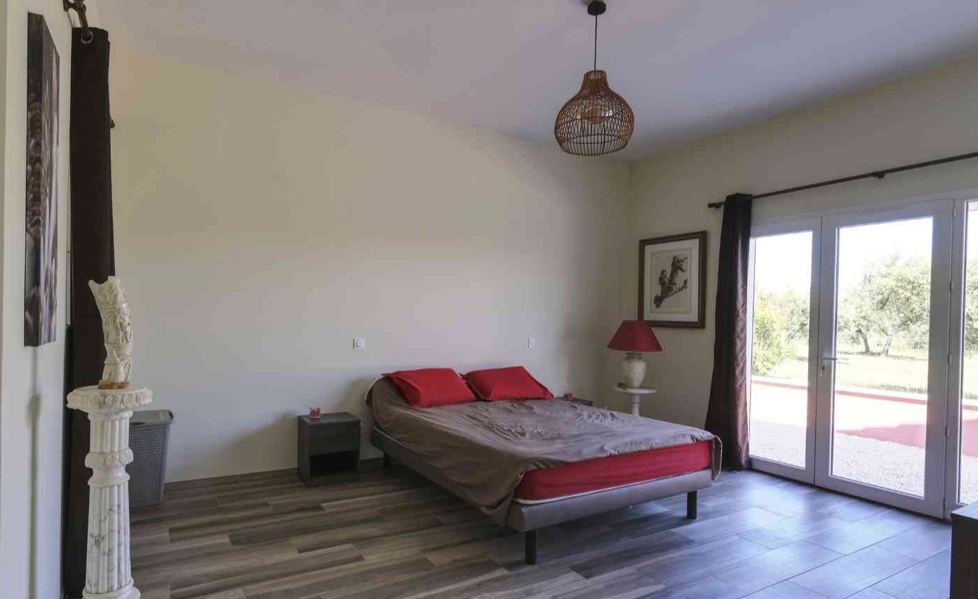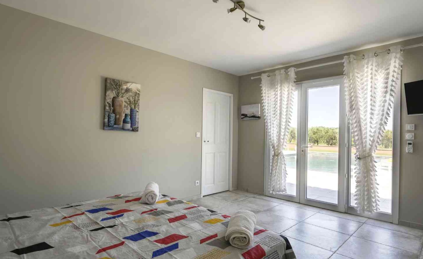 En fait, un vaste salon séjour avec cheminée puis une cuisine ouverte donne le ton du modernisme à cette villa. De plus, les 4 chambres sont spacieuses avec 2 suites avec salle de bain/douche. Et puis, 2 chambres doubles lits séparés et lit 160. Les chambres donnent sur le jardin et les suites ont une petite terrasse personnelle. Puis, la chambre 4 est située dans une partie privée du pool house.