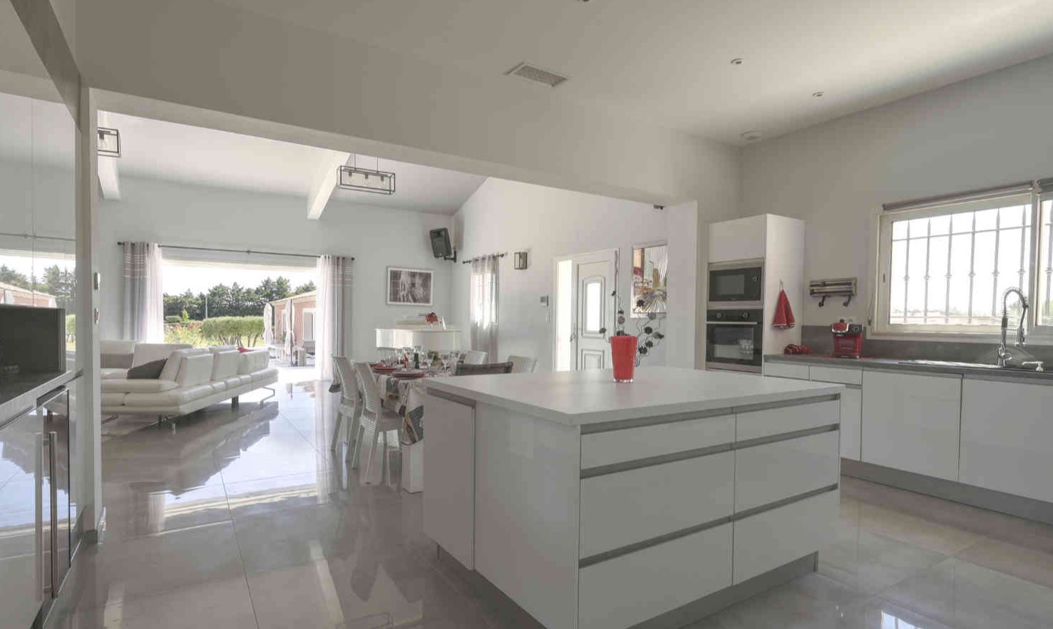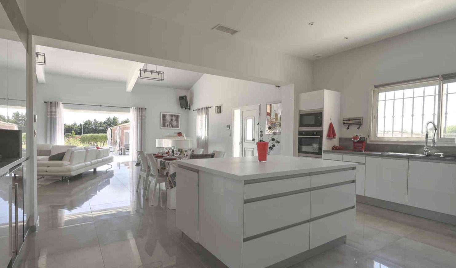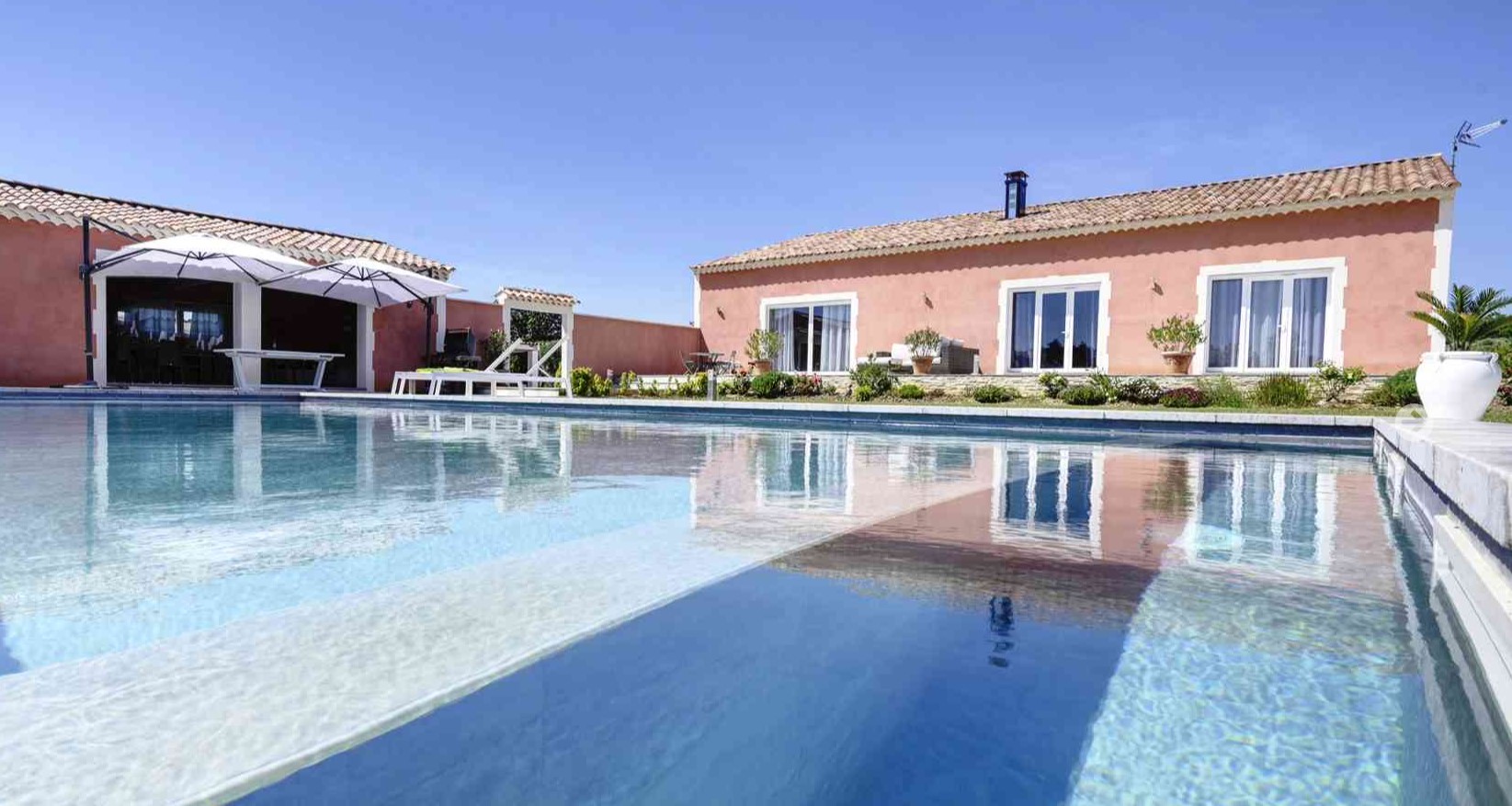 En fait, un vaste salon séjour avec cheminée puis une cuisine ouverte donne le ton du modernisme à cette villa. De plus, les 4 chambres sont spacieuses avec 2 suites avec salle de bain/douche. Et puis, 2 chambres doubles lits séparés et lit 160. Les chambres donnent sur le jardin et les suites ont une petite terrasse personnelle. Puis, la chambre 4 est située dans une partie privée du pool house.