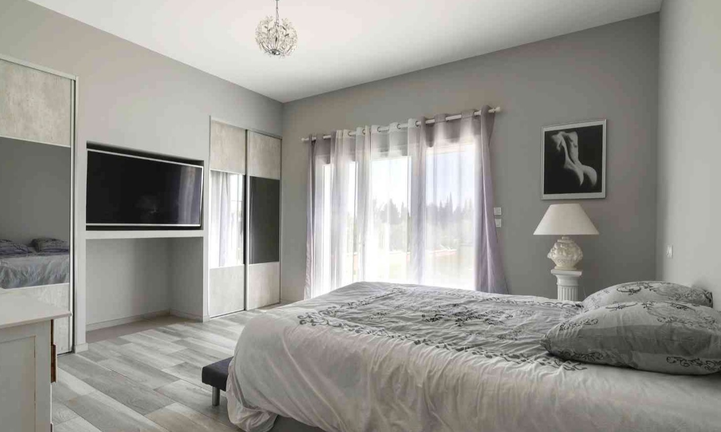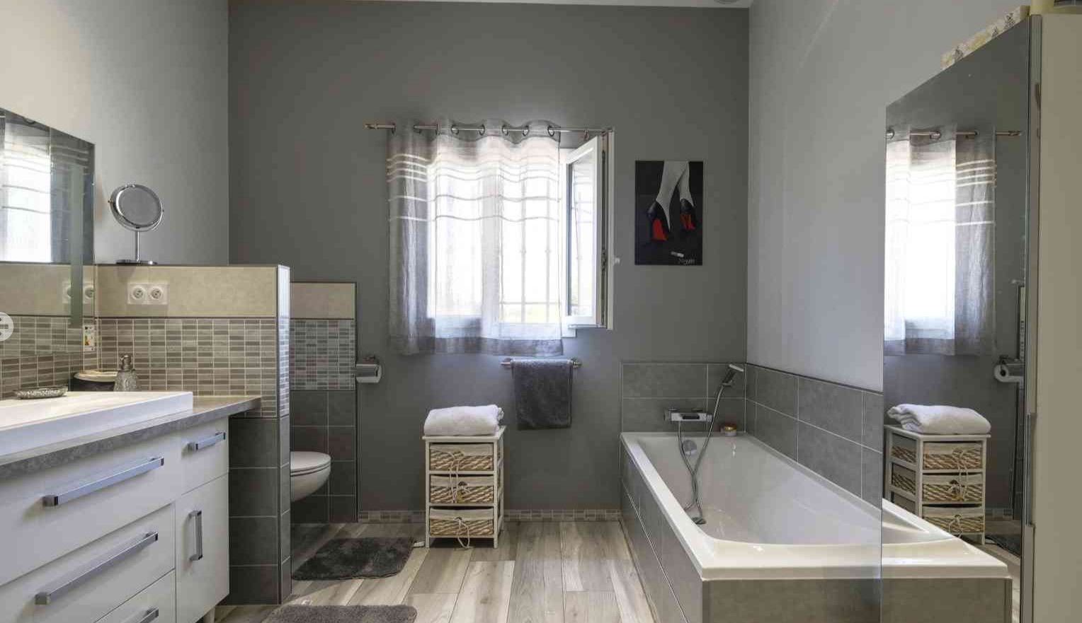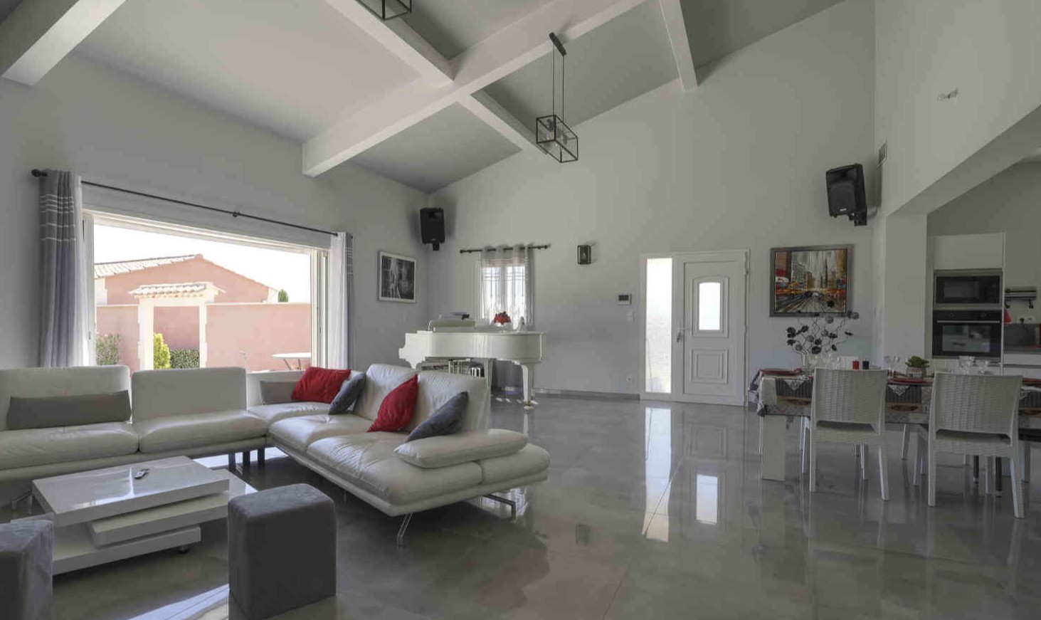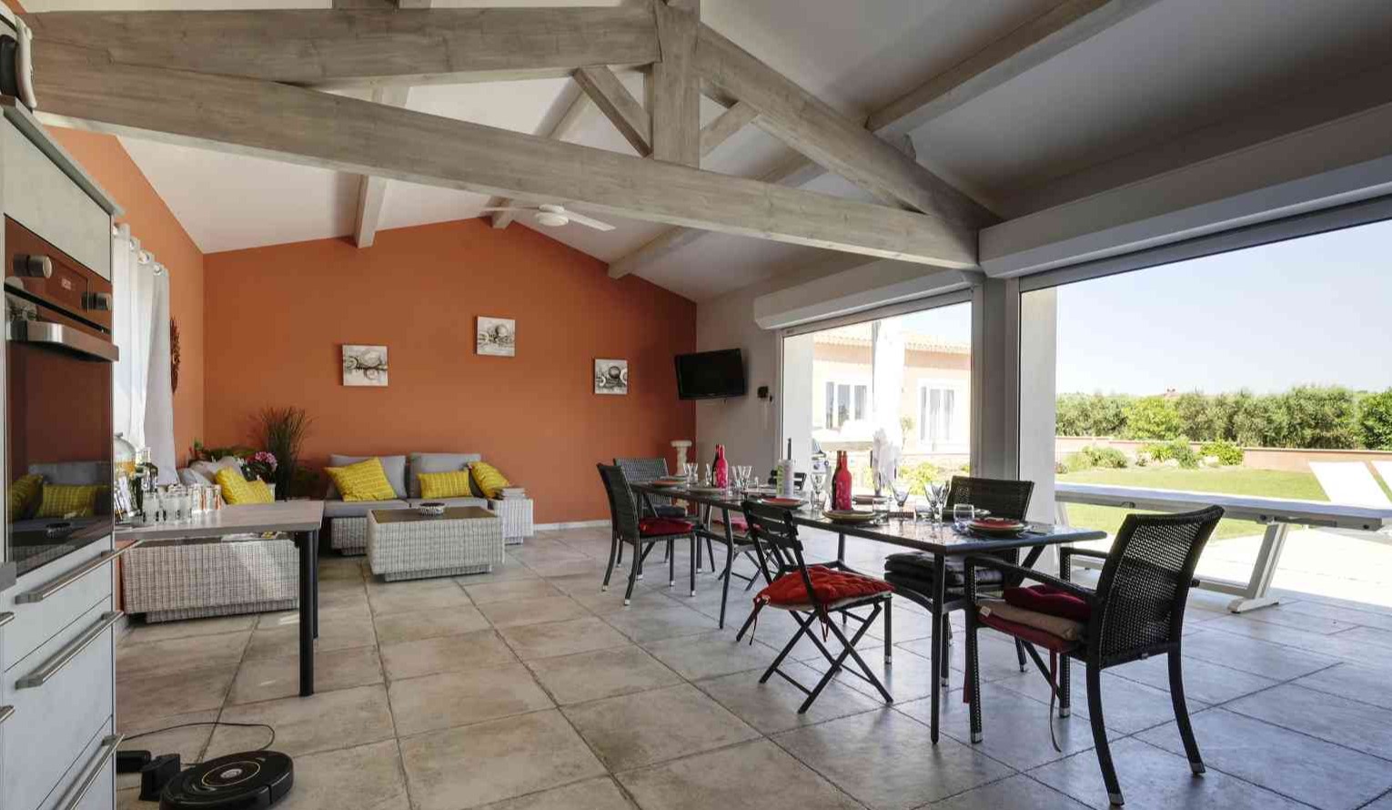 En fait, un vaste salon séjour avec cheminée puis une cuisine ouverte donne le ton du modernisme à cette villa. De plus, les 4 chambres sont spacieuses avec 2 suites avec salle de bain/douche. Et puis, 2 chambres doubles lits séparés et lit 160. Les chambres donnent sur le jardin et les suites ont une petite terrasse personnelle. Puis, la chambre 4 est située dans une partie privée du pool house.