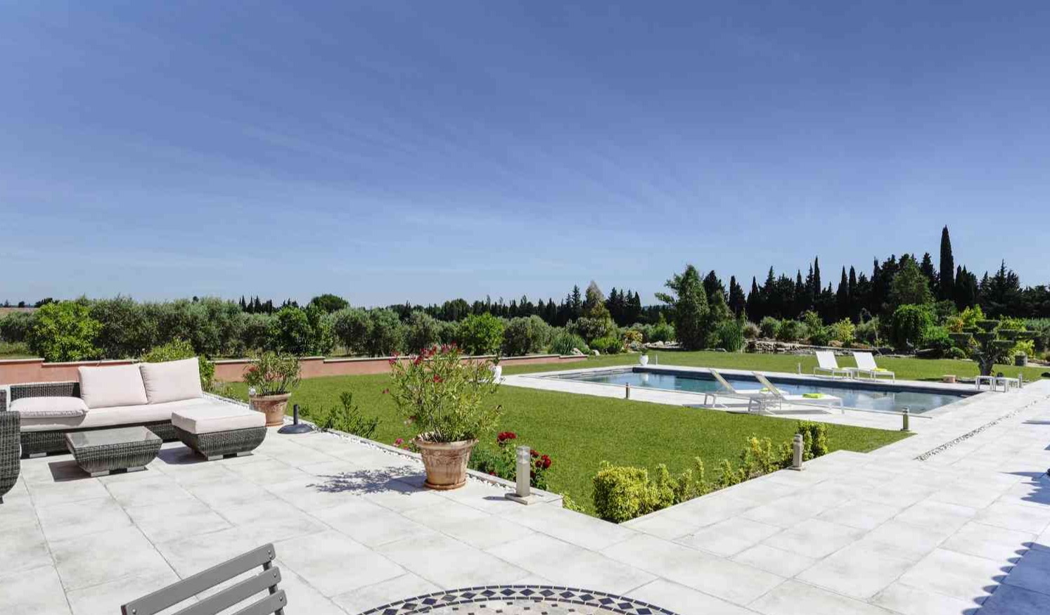 Cette villa de charme est orientée sud mais en forme de U à l’abri du Mistral. Les terrasses sont grandes et donnent directement sur la piscine de 12 M X 6 M. De plus, l’espaces extérieurs est aménagé avec du mobilier confortable pour profitez du soleil et de vivre en plein air.