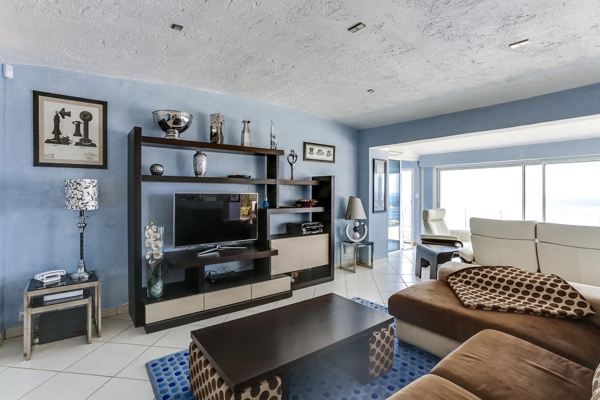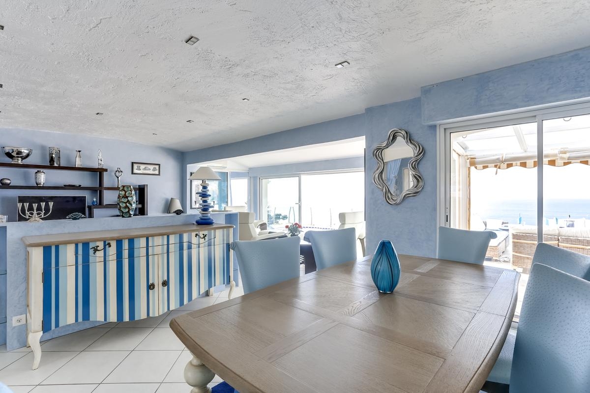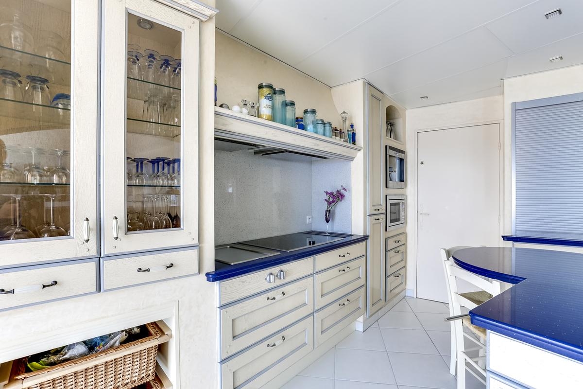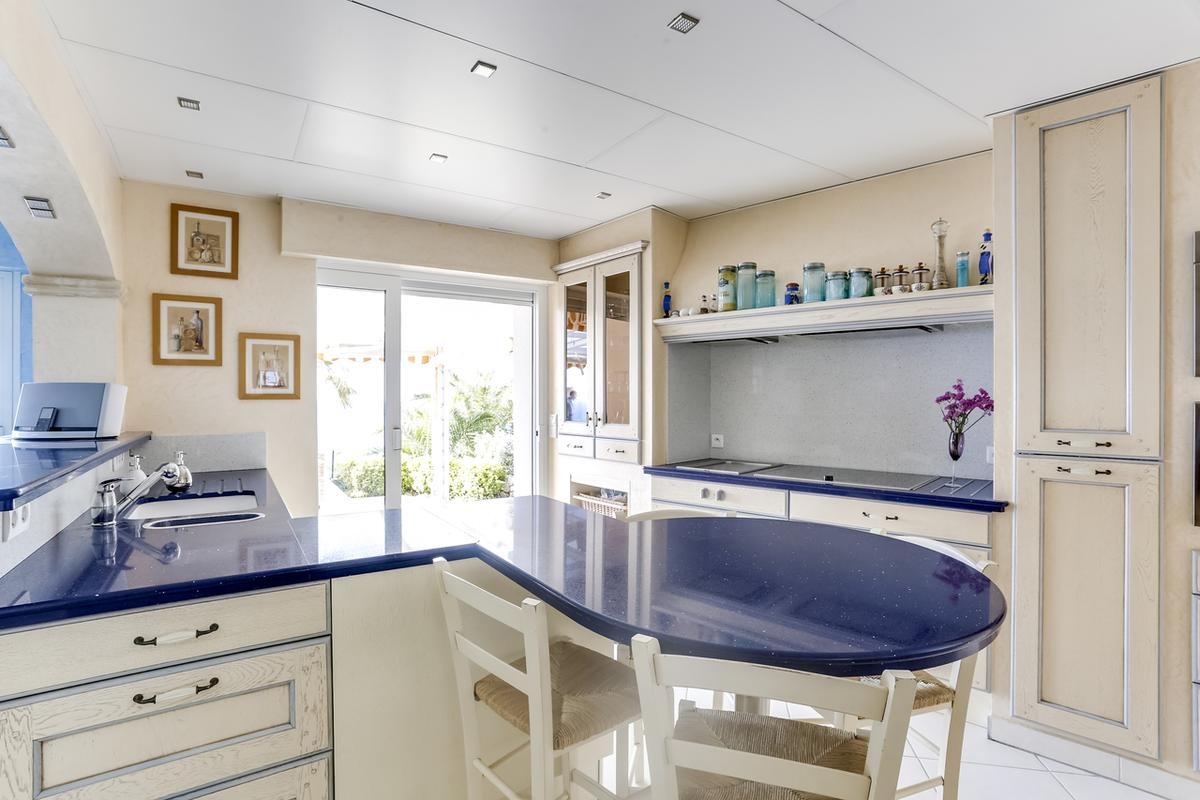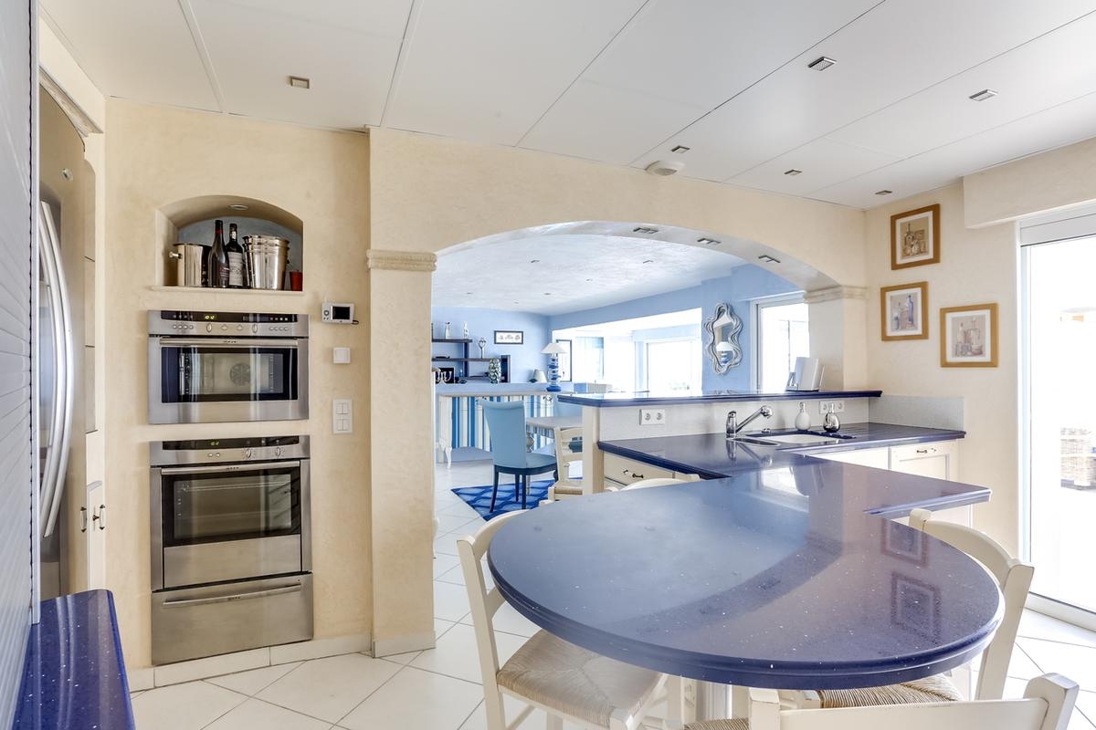 1 cuisine entièrement équipée ouverte sur la pièce à vivre très lumineuse avec les grandes baies vitrées avec vue sur la mer.