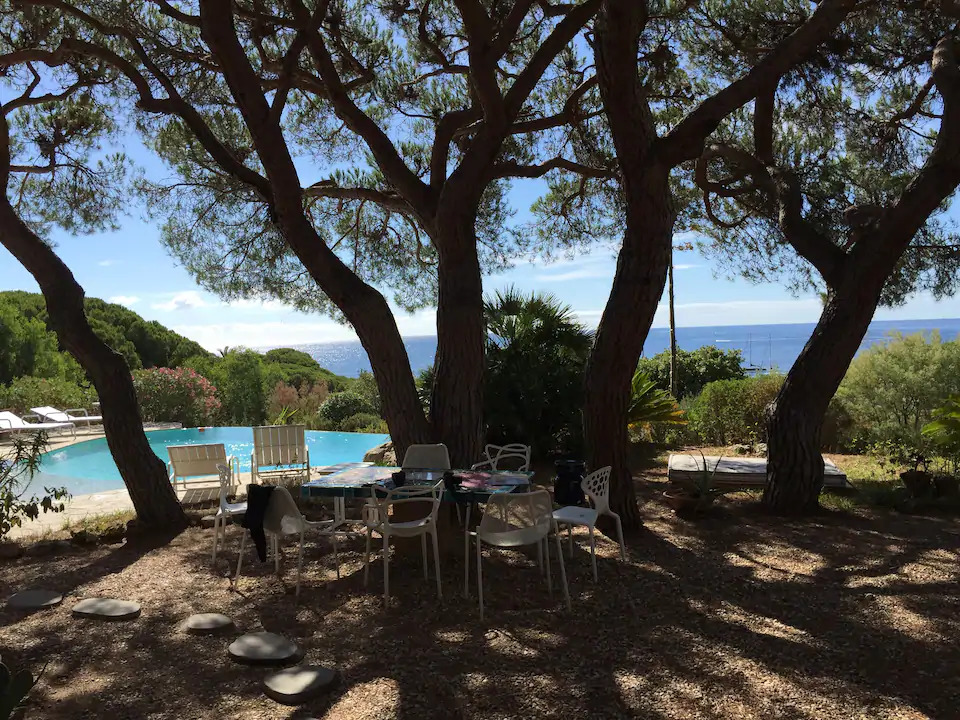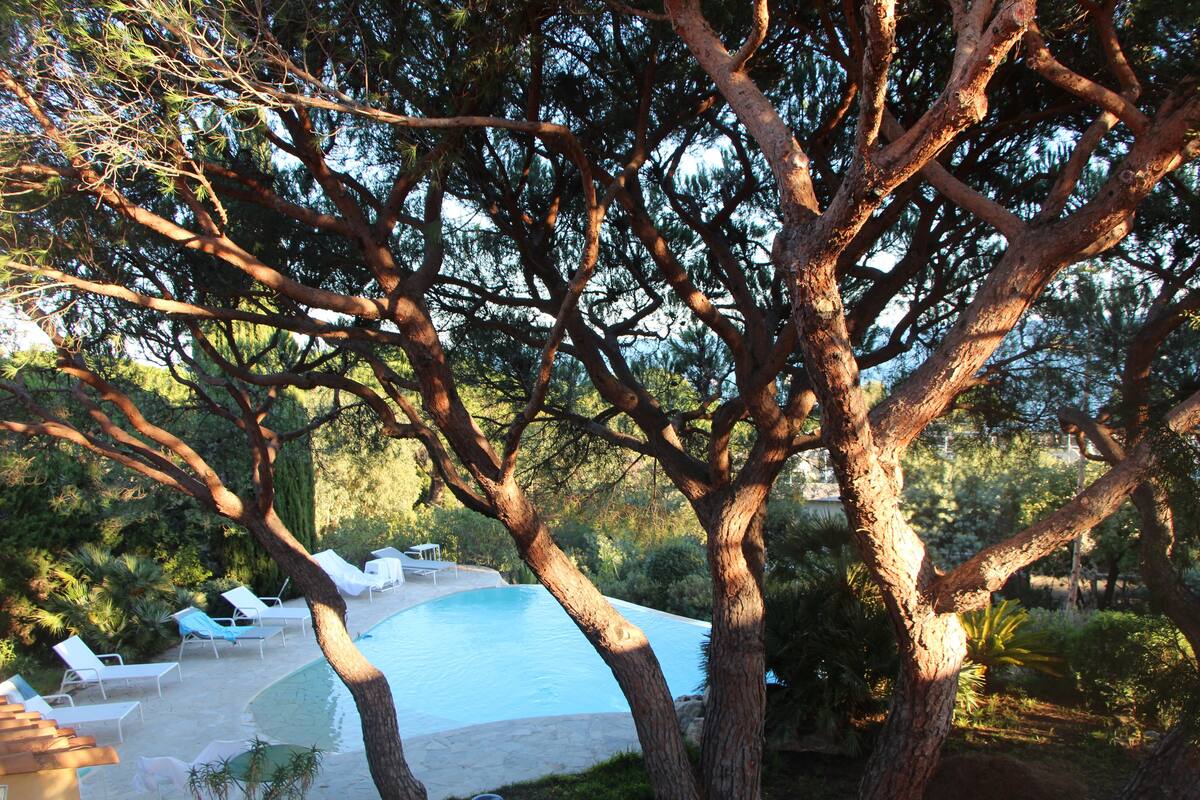 Cette villa est au calme dans une impasse privée, une piscine à débordement et une vue panoramique sur la mer. En fait nous sommes à l’ombre des pins parasols , à 5 mn à pieds de la plage de sable avec restaurants ,activités nautiques, supermarché, port avec locations de bateaux et navettes pour Saint-Tropez.