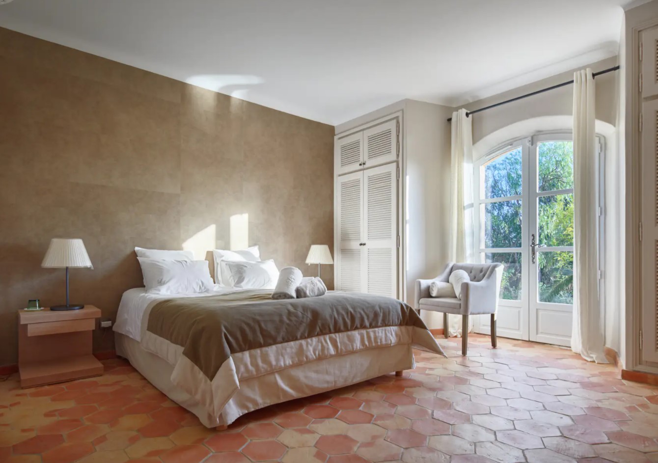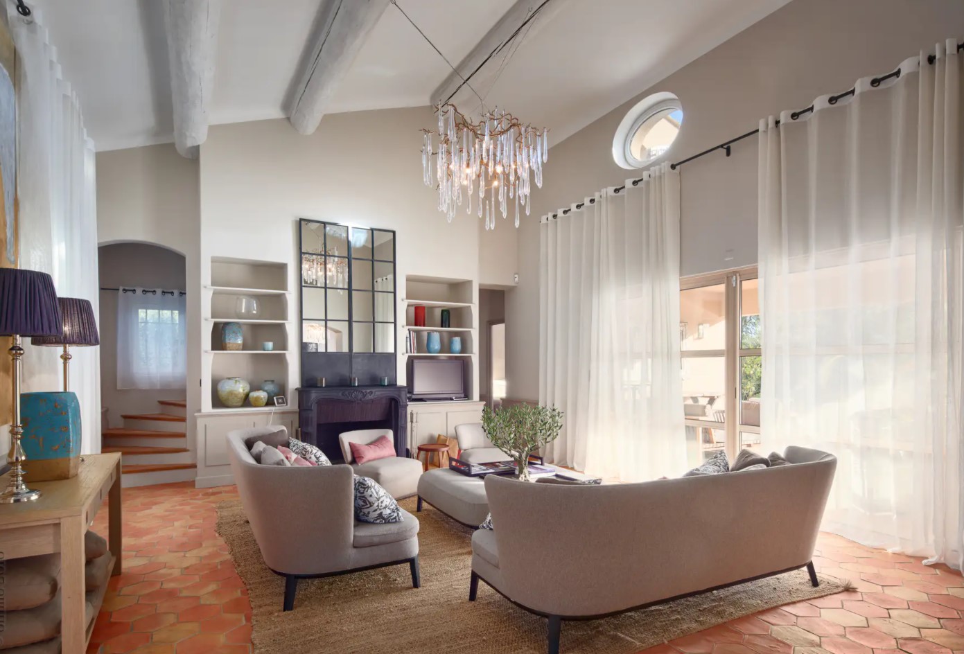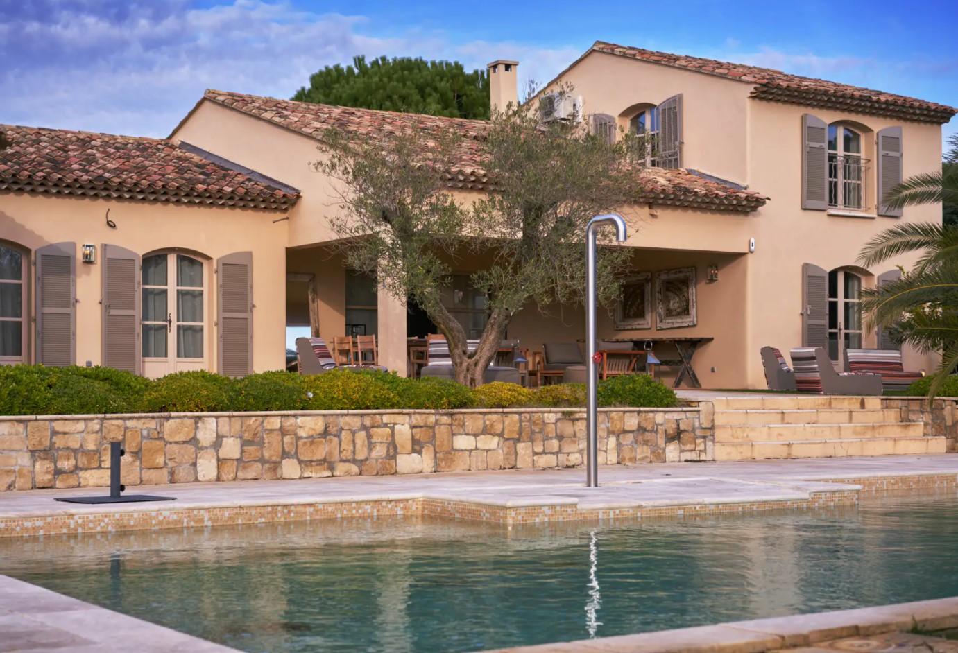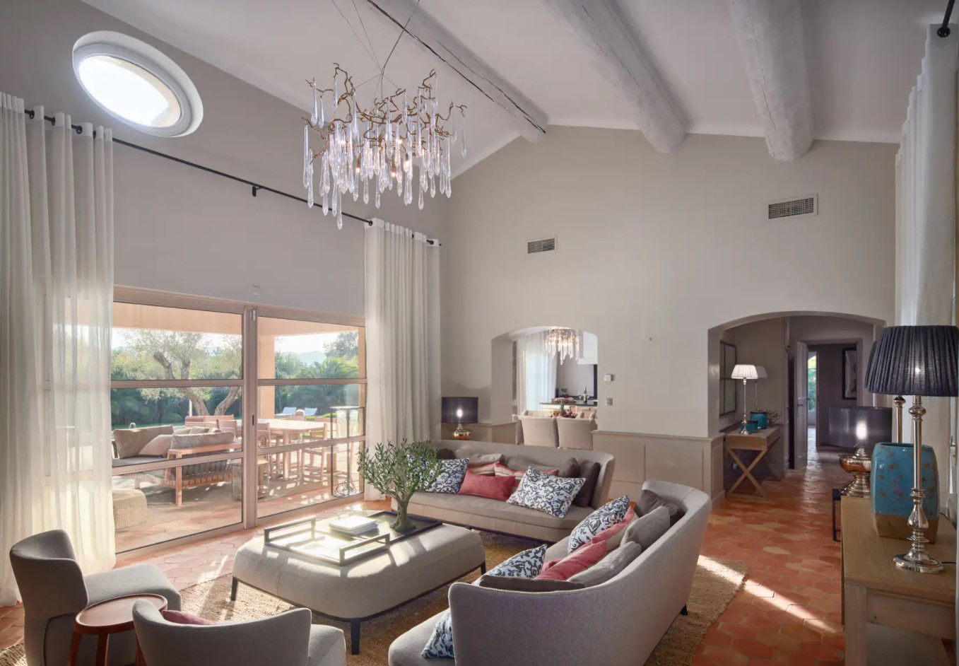 Une grande villa de prestige de 240 m² pour 10 personnes. En effet, de grandes fenêtres blanches et une façade couleur sable, un air de Provence pour cette belle villa de luxe. La décoration en carrelage et poutres de bois remis au gout du jour donnant un style chic contemporain.