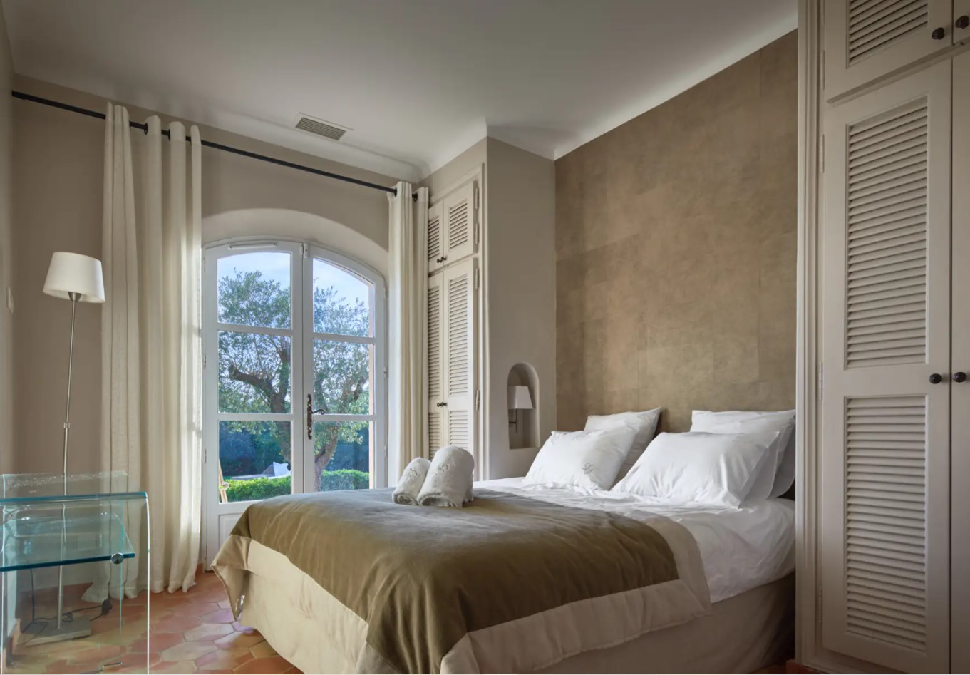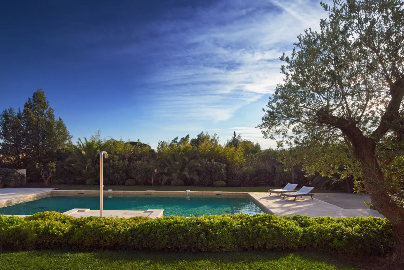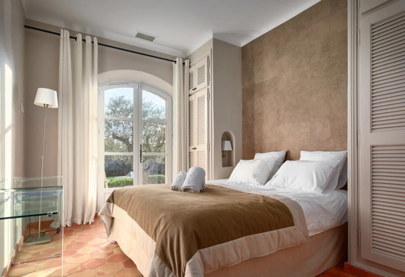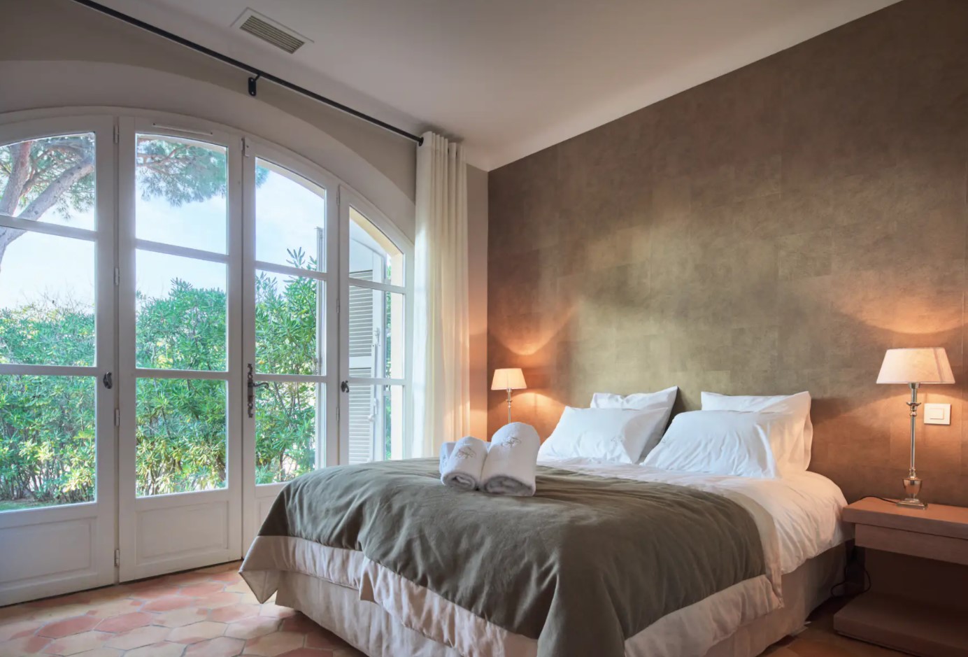 Une grande villa de prestige de 240 m² pour 10 personnes. En effet, de grandes fenêtres blanches et une façade couleur sable, un air de Provence pour cette belle villa de luxe. La décoration en carrelage et poutres de bois remis au gout du jour donnant un style chic contemporain.