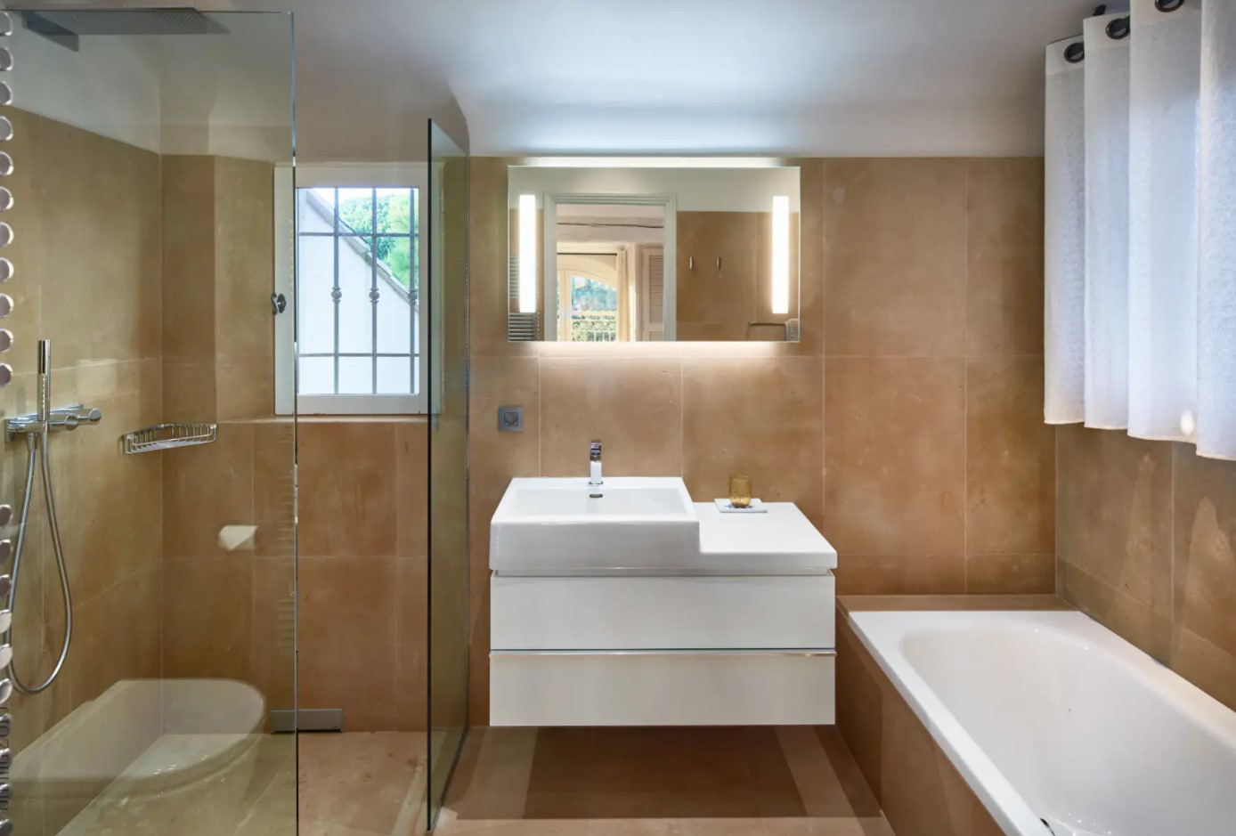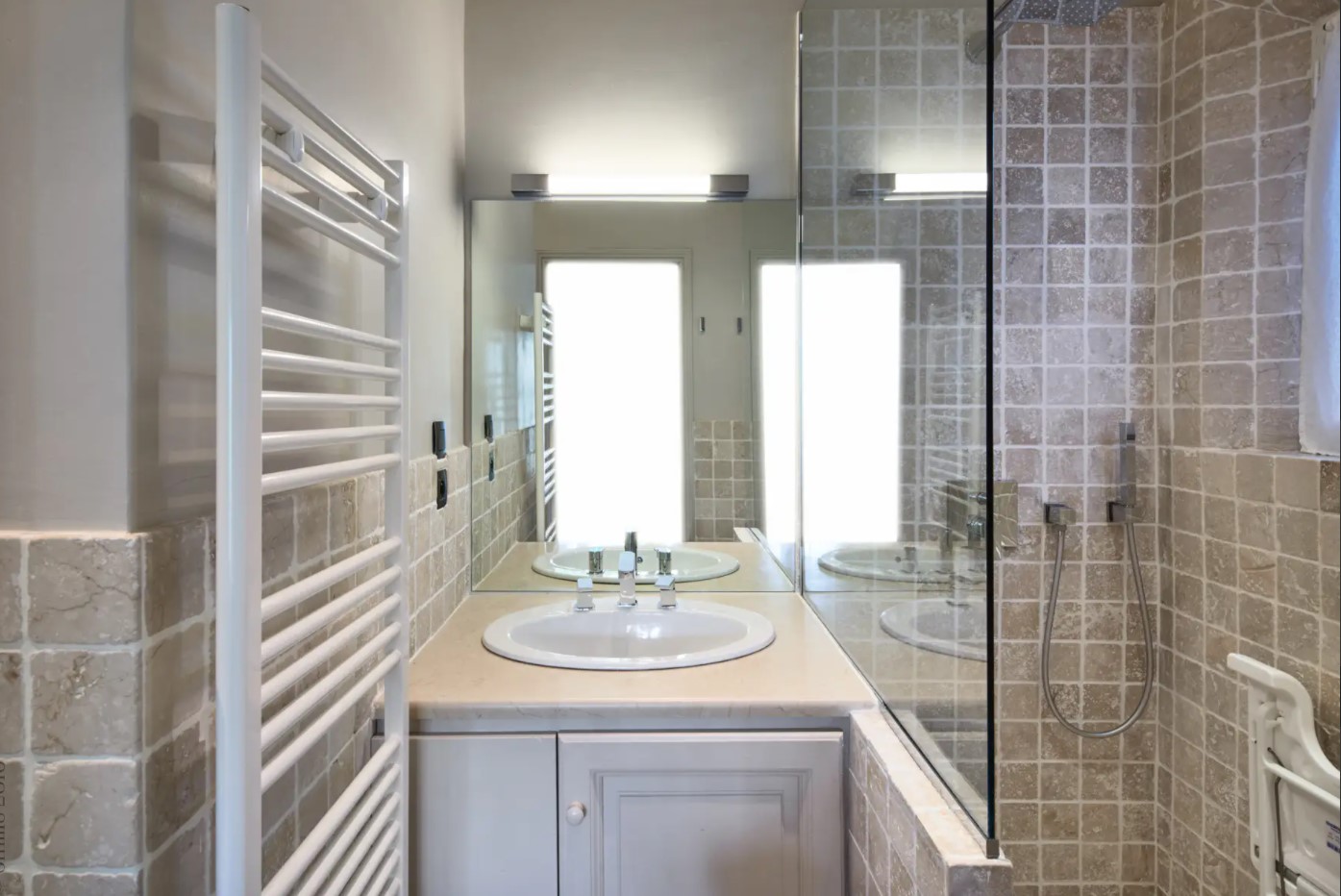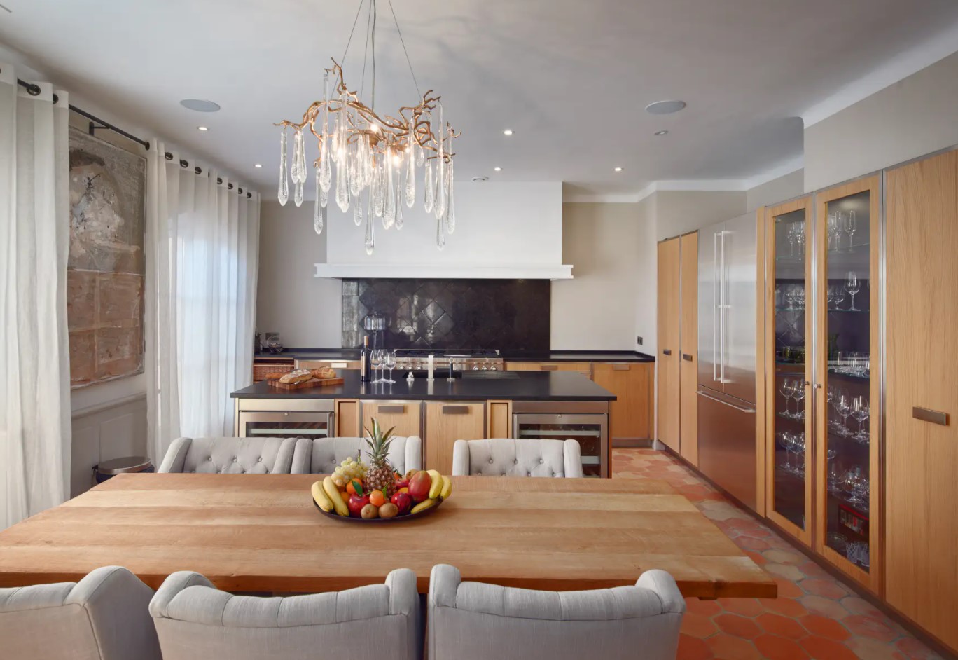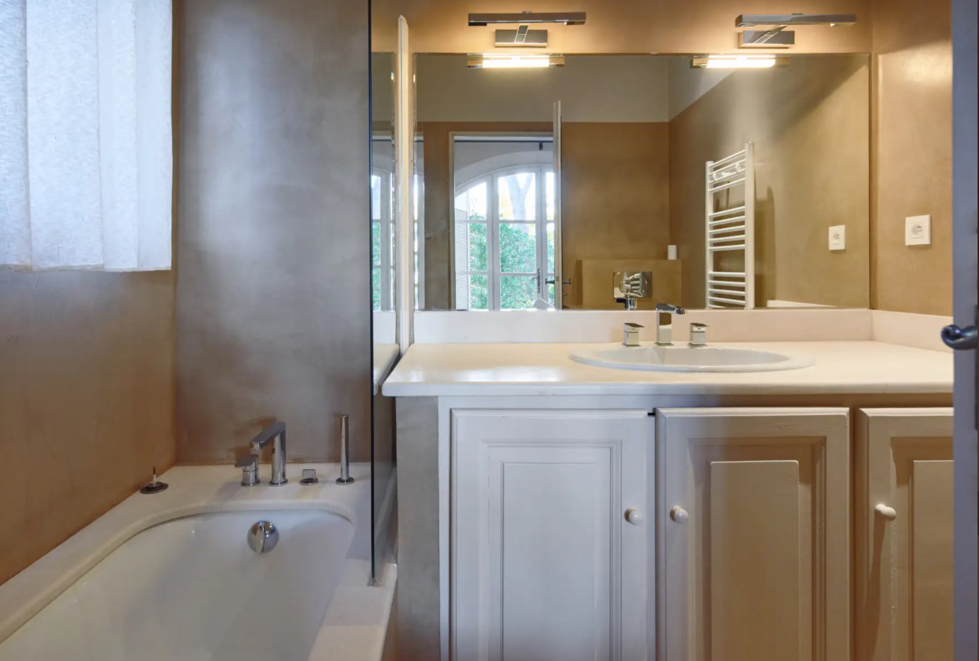 Une grande villa de prestige de 240 m² pour 10 personnes. En effet, de grandes fenêtres blanches et une façade couleur sable, un air de Provence pour cette belle villa de luxe. La décoration en carrelage et poutres de bois remis au gout du jour donnant un style chic contemporain.