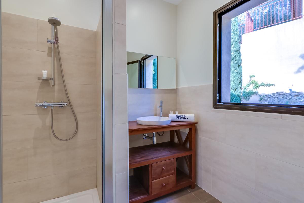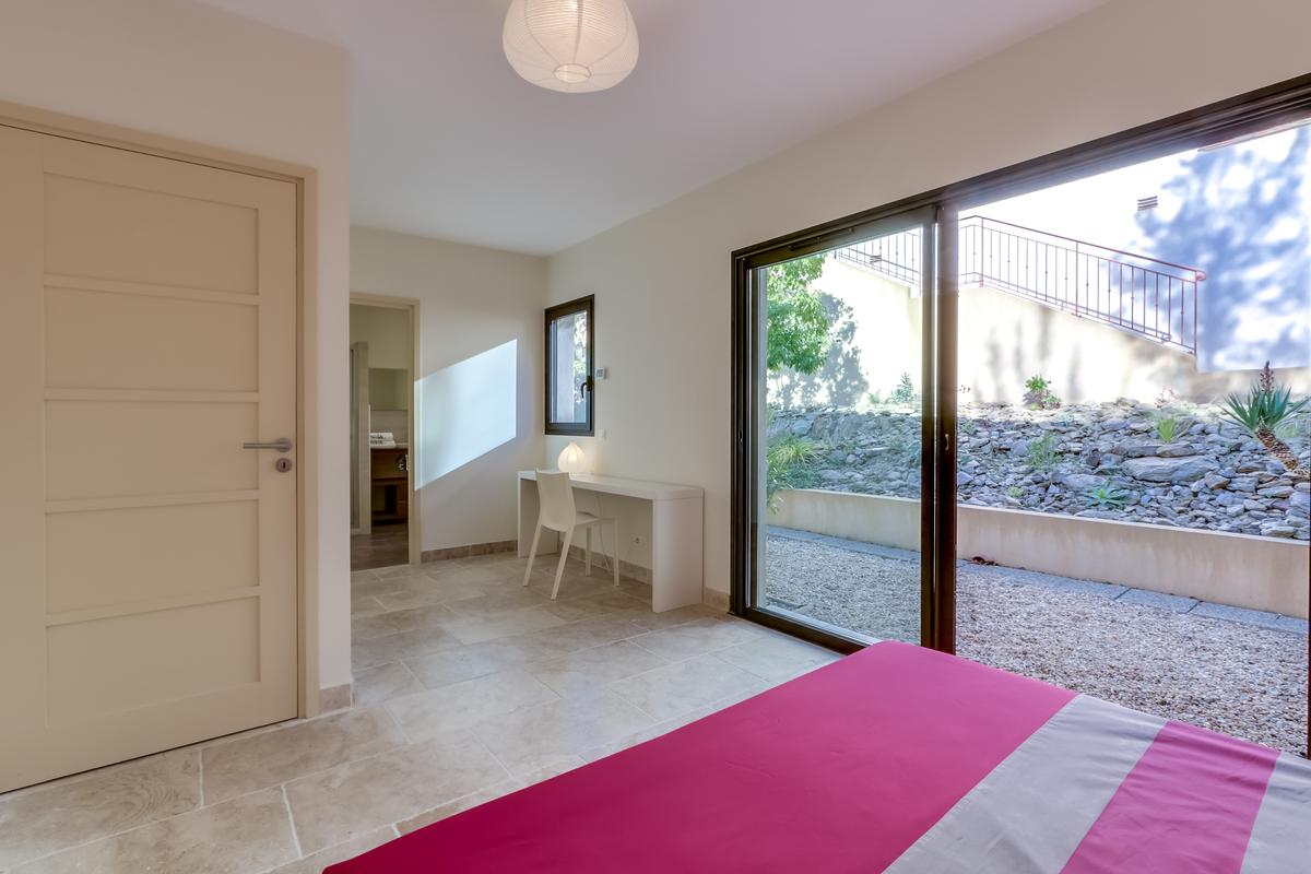 – Chambre à coucher 3, accès au jardin, grand lit, salle de douche attenante (douche et toilettes)