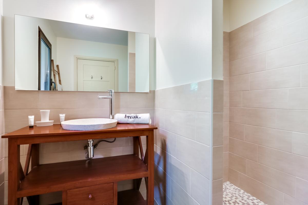 La grande terrasse couverte où l’on peut dîner tout en donnant sur la mer. Puis, la piscine est aussi un endroit idéal pour se détendre. En fait, les quatre des chambres ont une vue sur la mer.