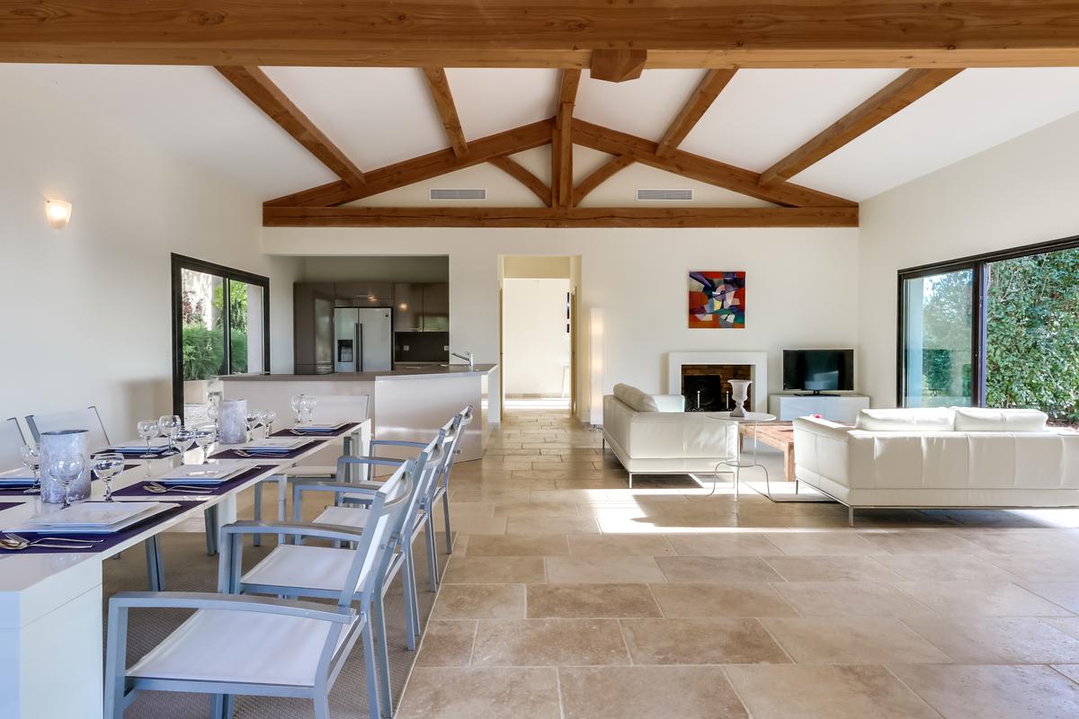 Maison principale: Vaste espace de vie avec salon et salle à manger ouvrant sur la terrasse.
