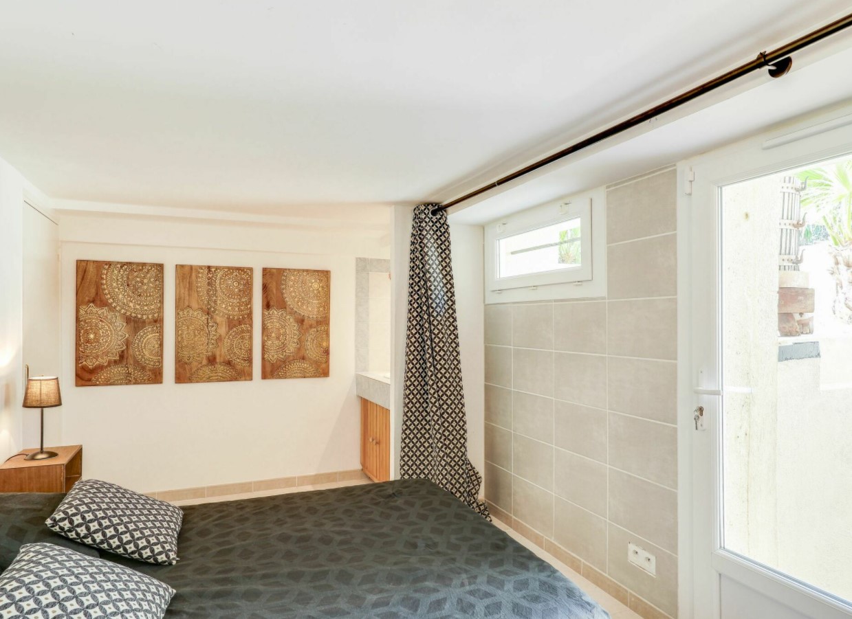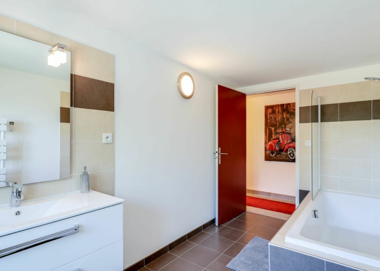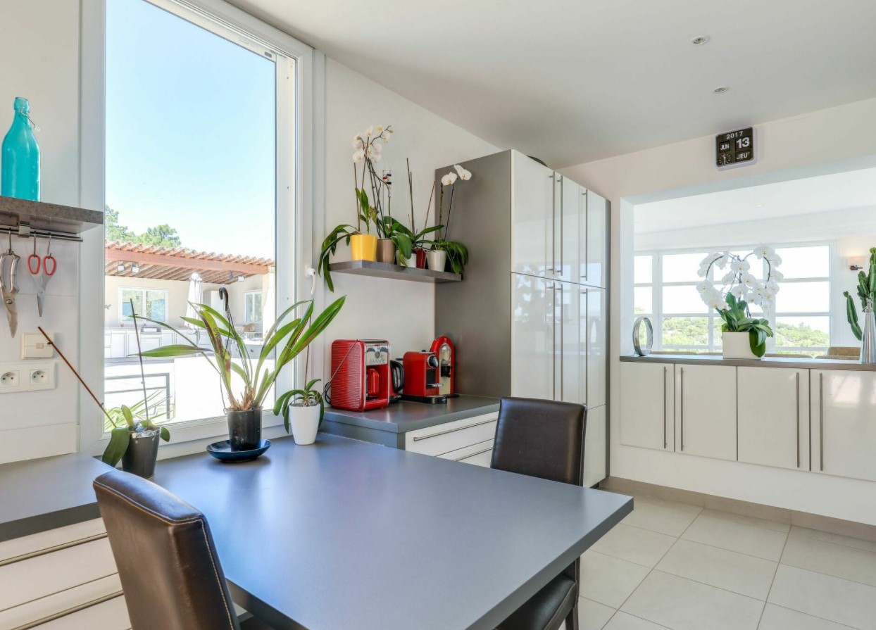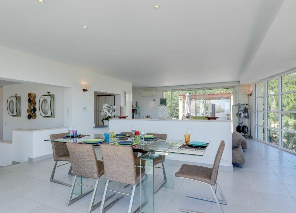 En fait, la composition de la villa est fonctionnelle, entrée avec WC et douche, un salon avec accès direct sur la terrasse. De plus, un grand séjour, spacieux et lumineux donne directement sur la terrasse piscine. La cuisine ouverte entièrement aménagée donne également sur la piscine.