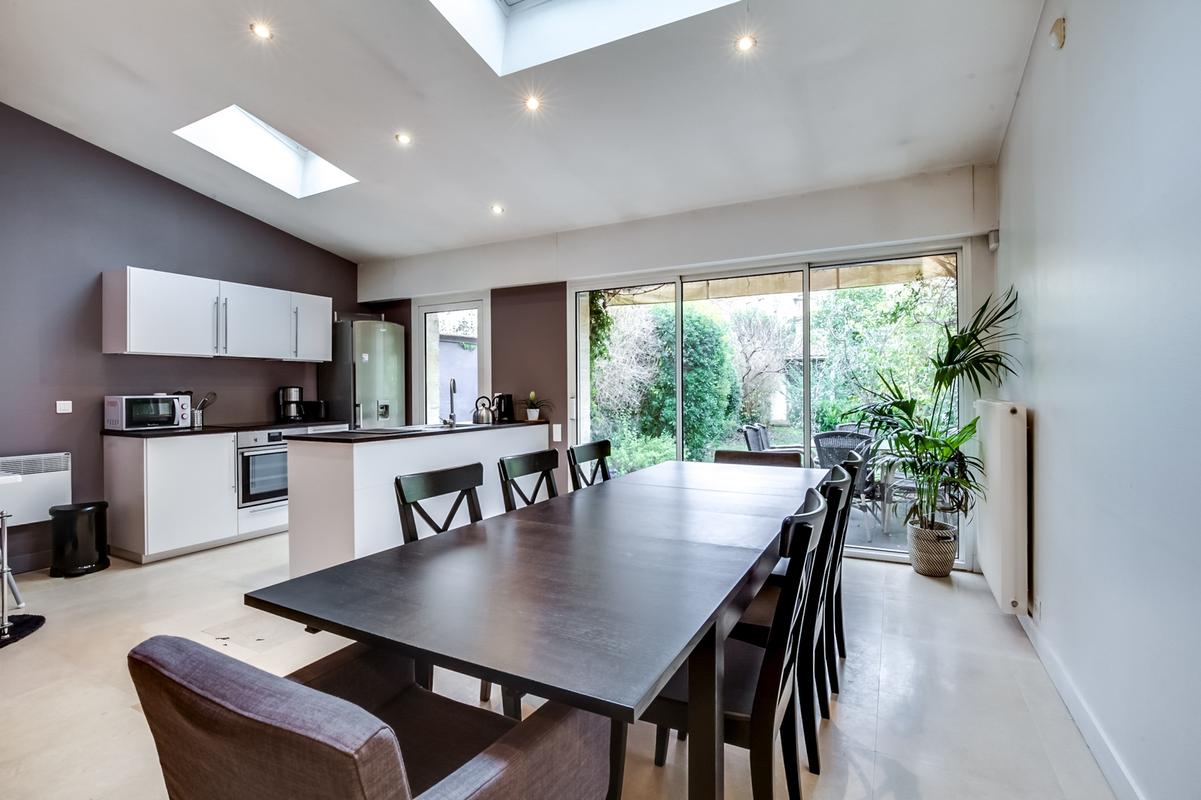 – Séjour avec cheminée, prolongé par une salle à manger et une cuisine ouverte, avec de grandes portes vitrées coulissantes donnant sur la terrasse et le jardin