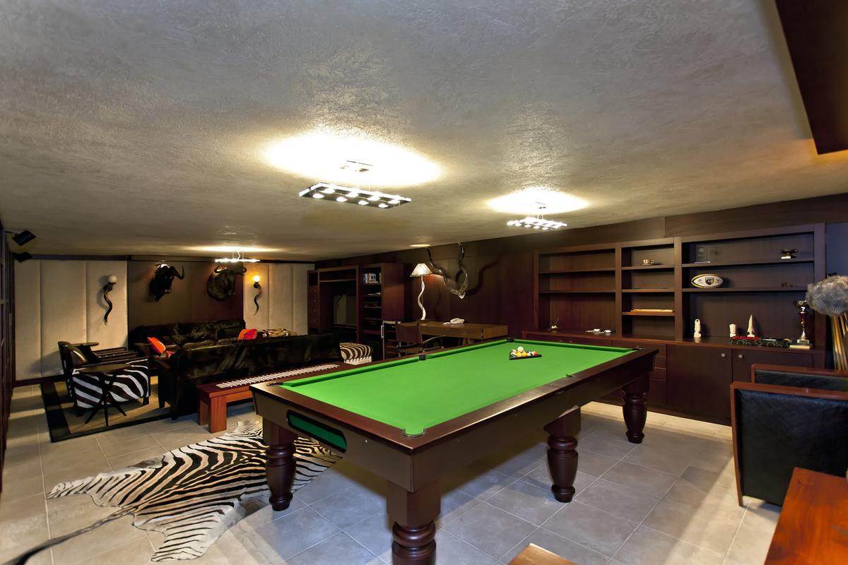 Espace jeux et télévision avec une table de snooker qui se transforme en table de ping-pong, jeu de fléchettes. L’espace télévision avec grand écran plat et canapés relax.
