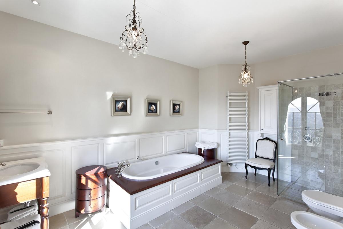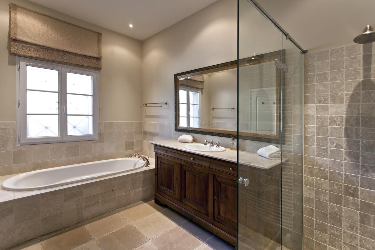 Chambre 1 : lit King size (200x200cm). Salle de bain avec baignoire, douche et toilettes.